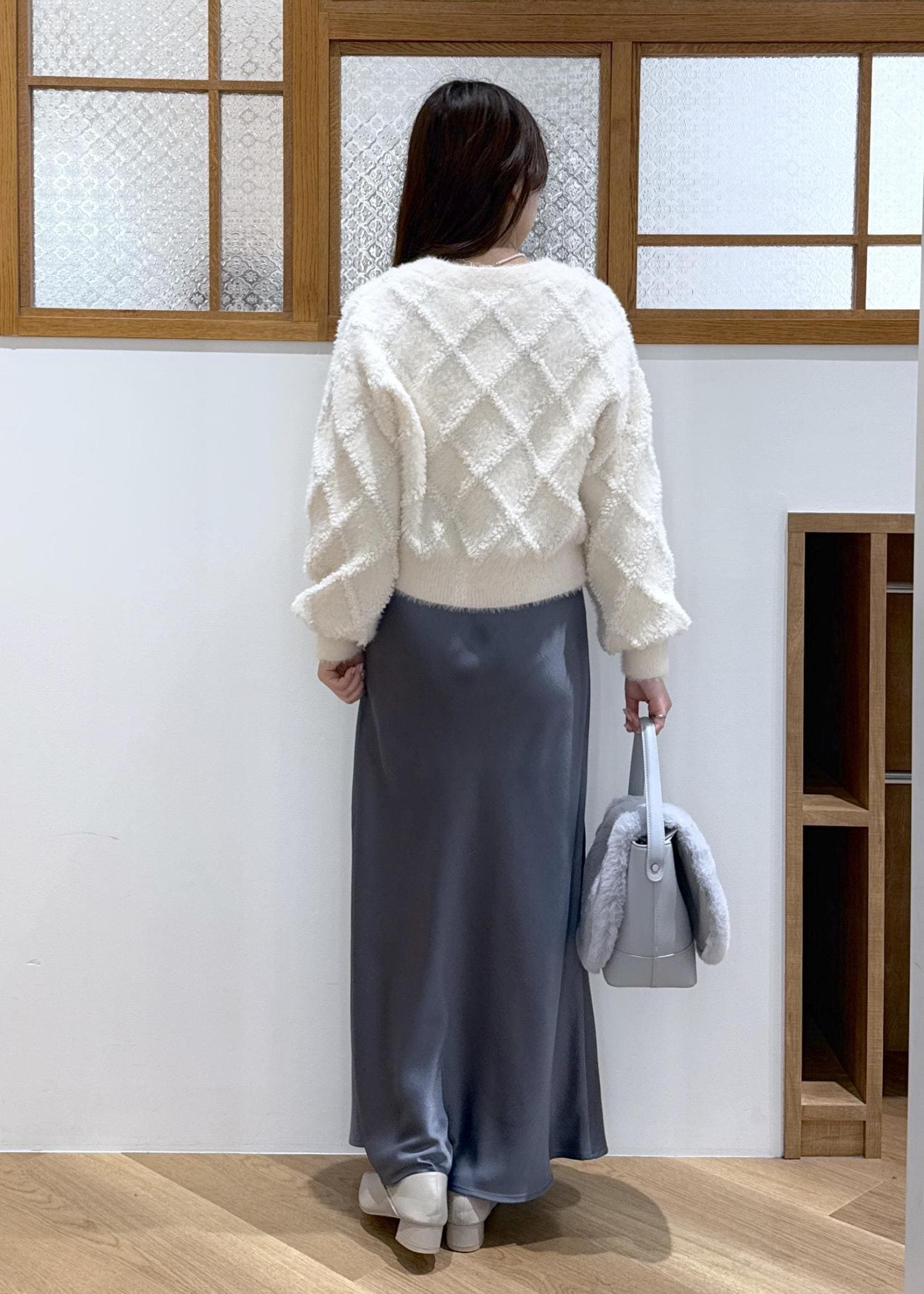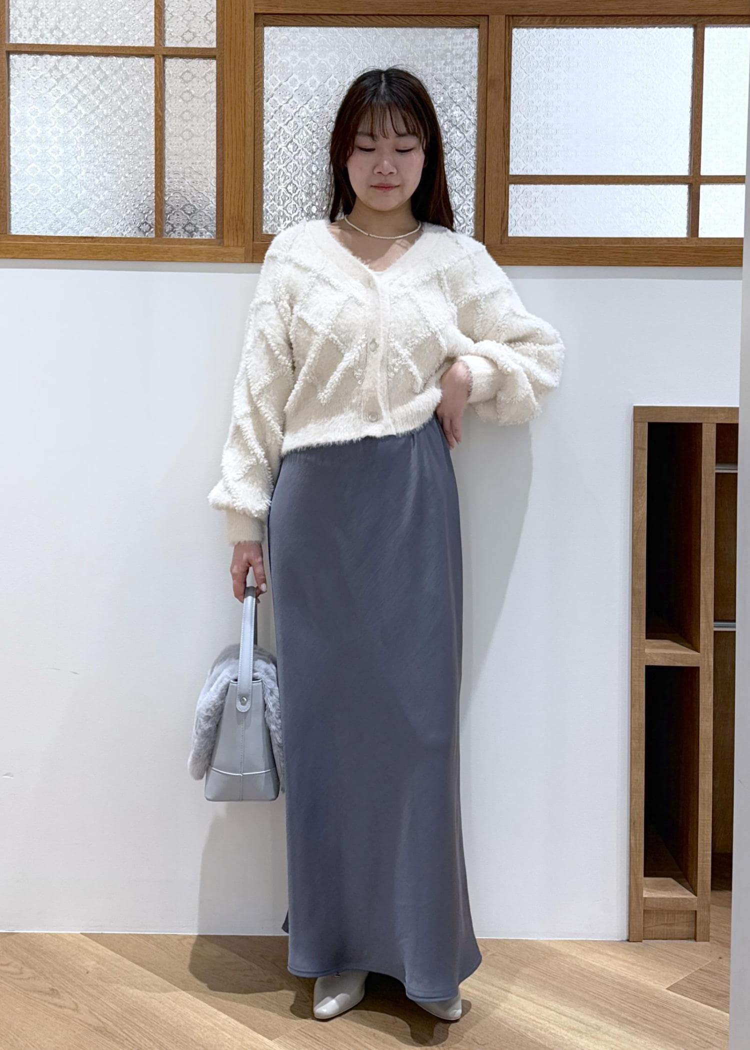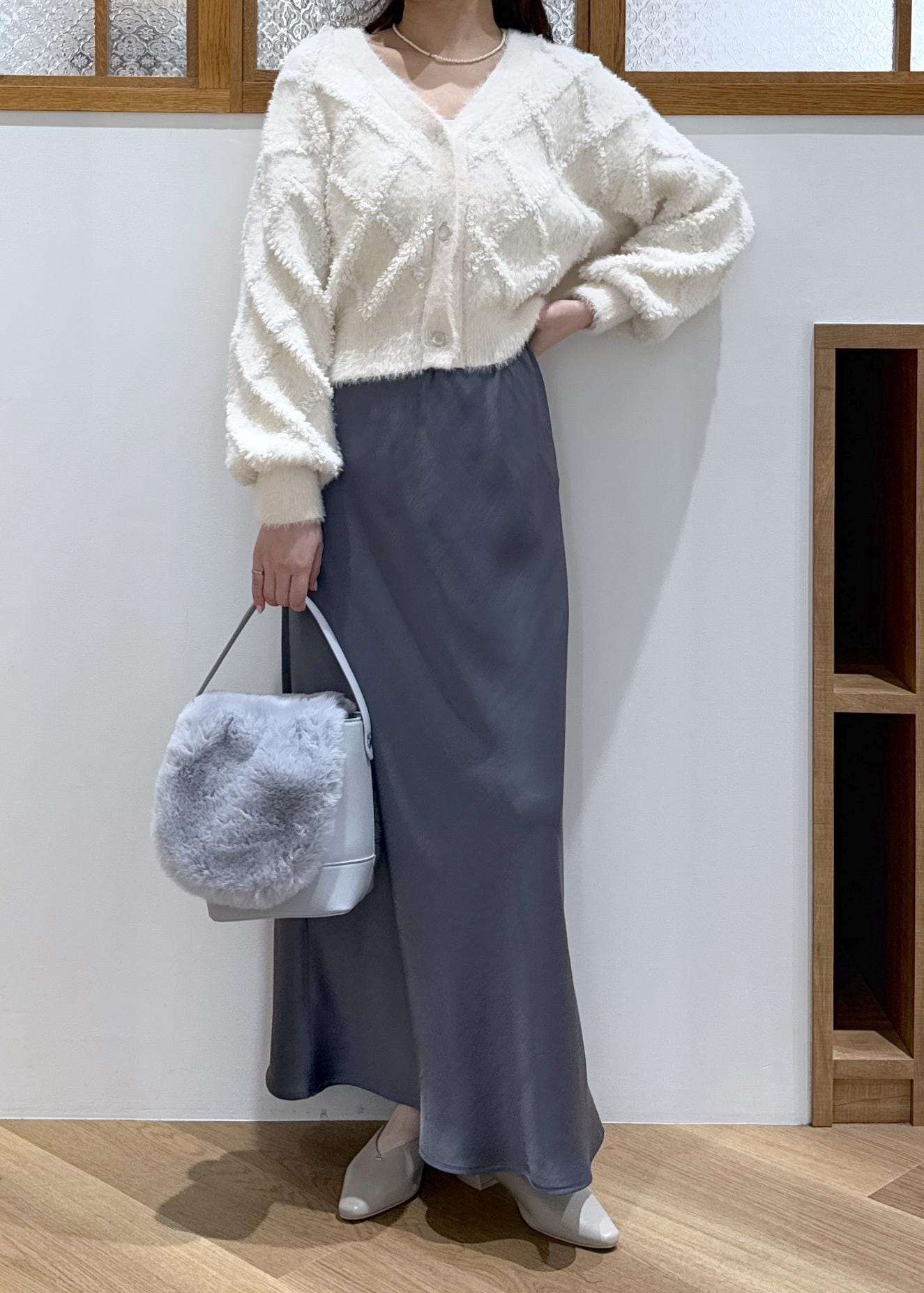 深めVネックのカーディガンにサテンのスカートを合わせたエレガントな印象のコーディネートです。
