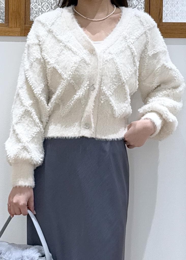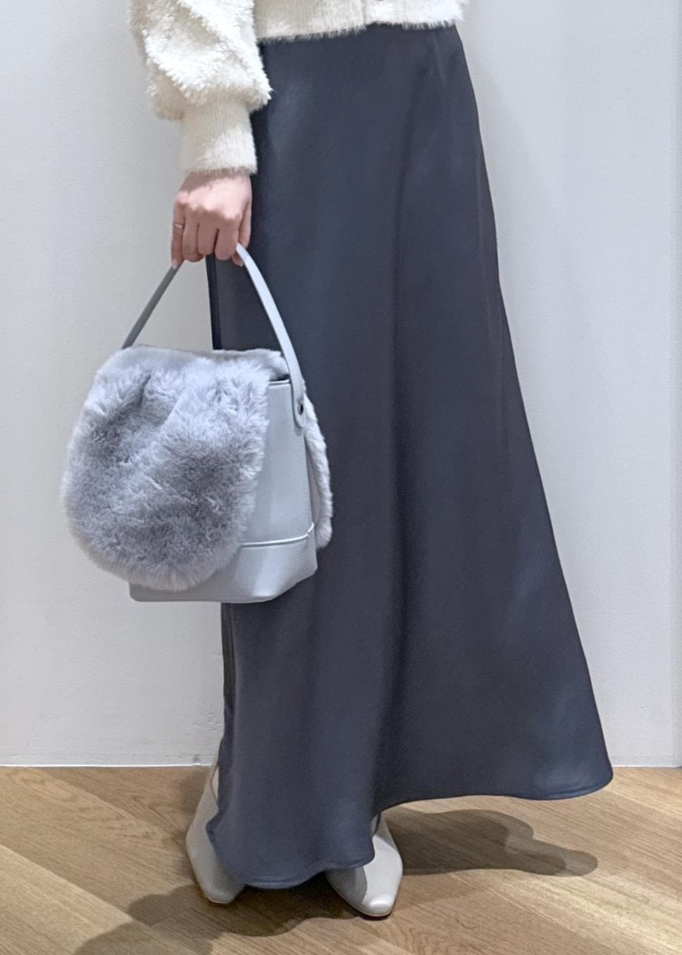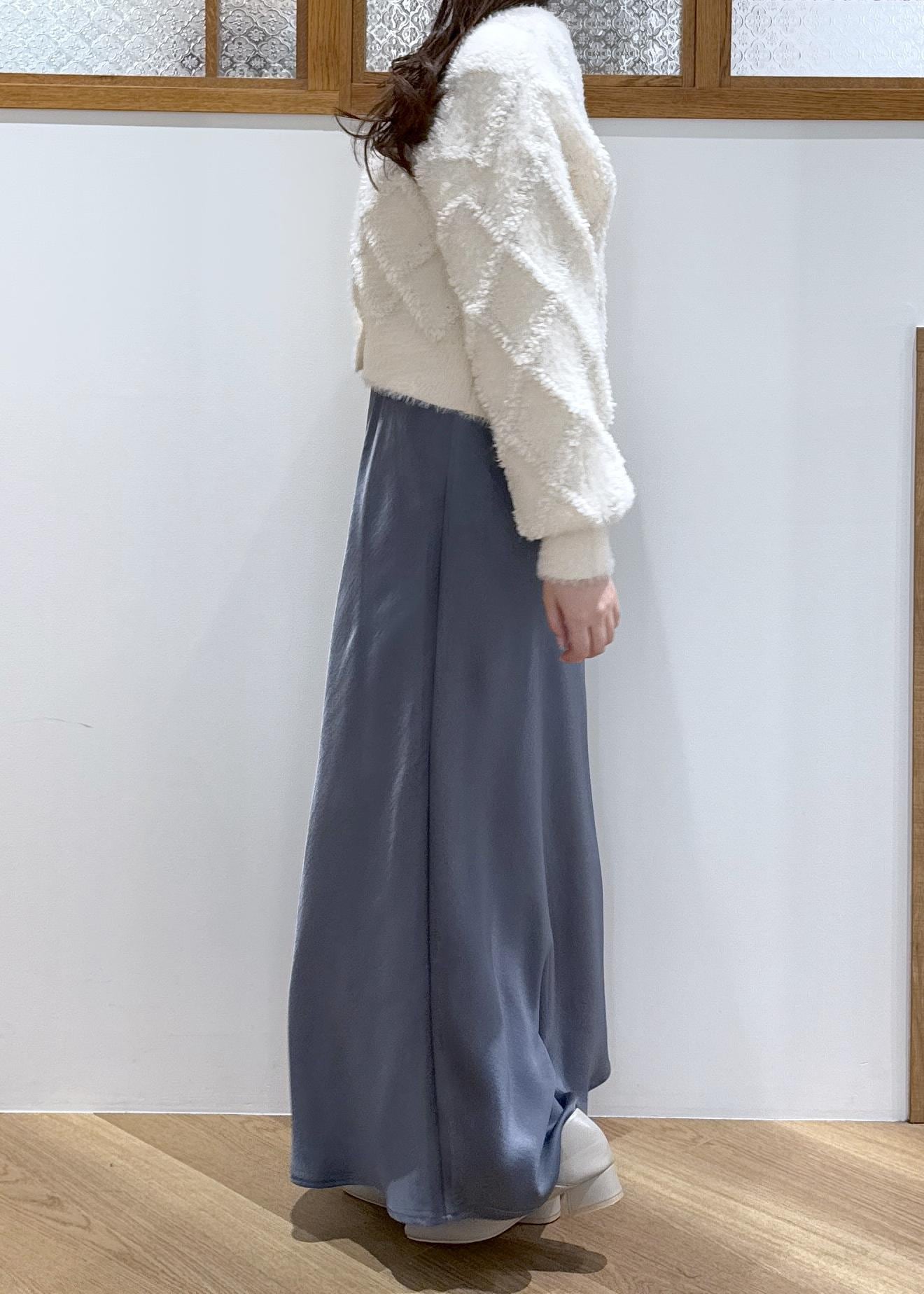深めVネックのカーディガンにサテンのスカートを合わせたエレガントな印象のコーディネートです。
