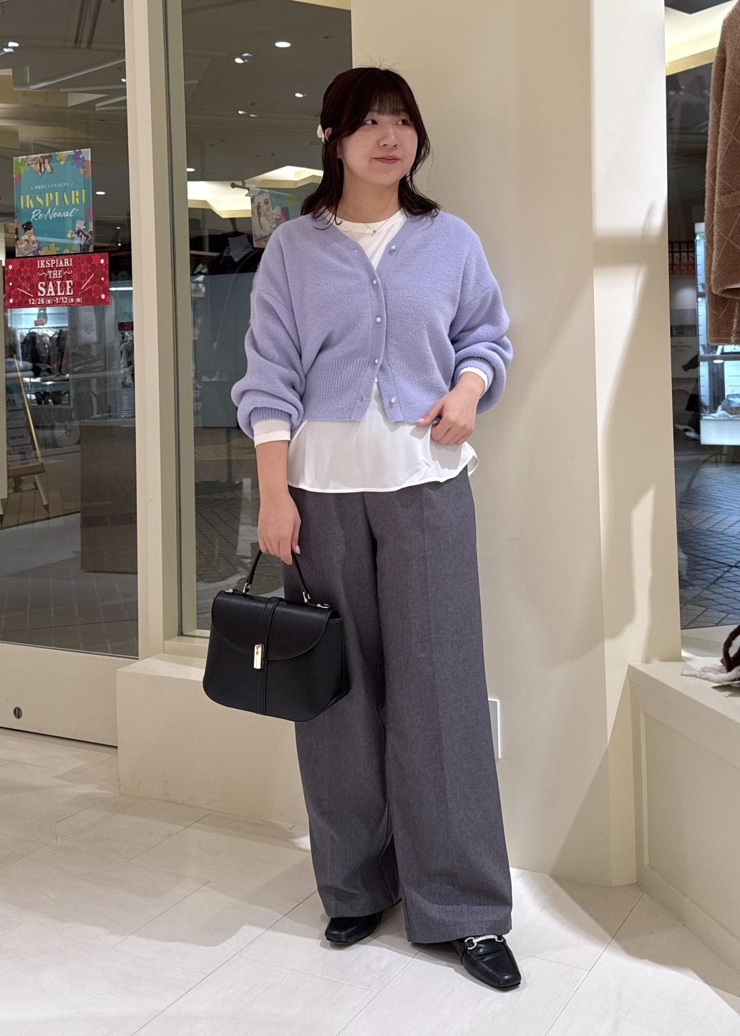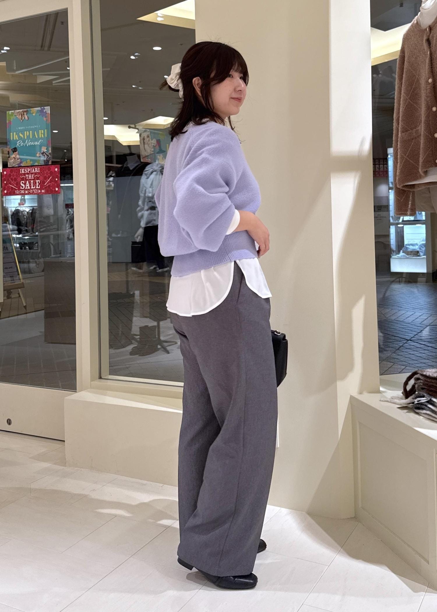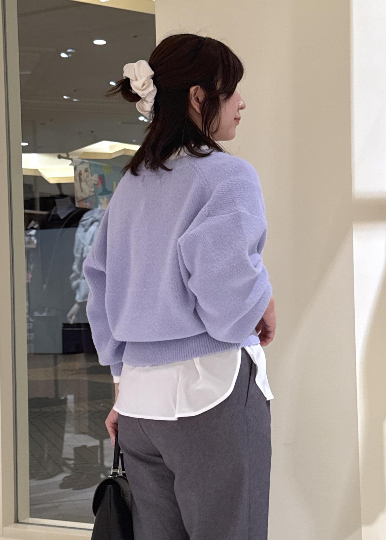 着丈が少し長めのものを合わせる時は、丈感のバランスを取るように心がけます。 -