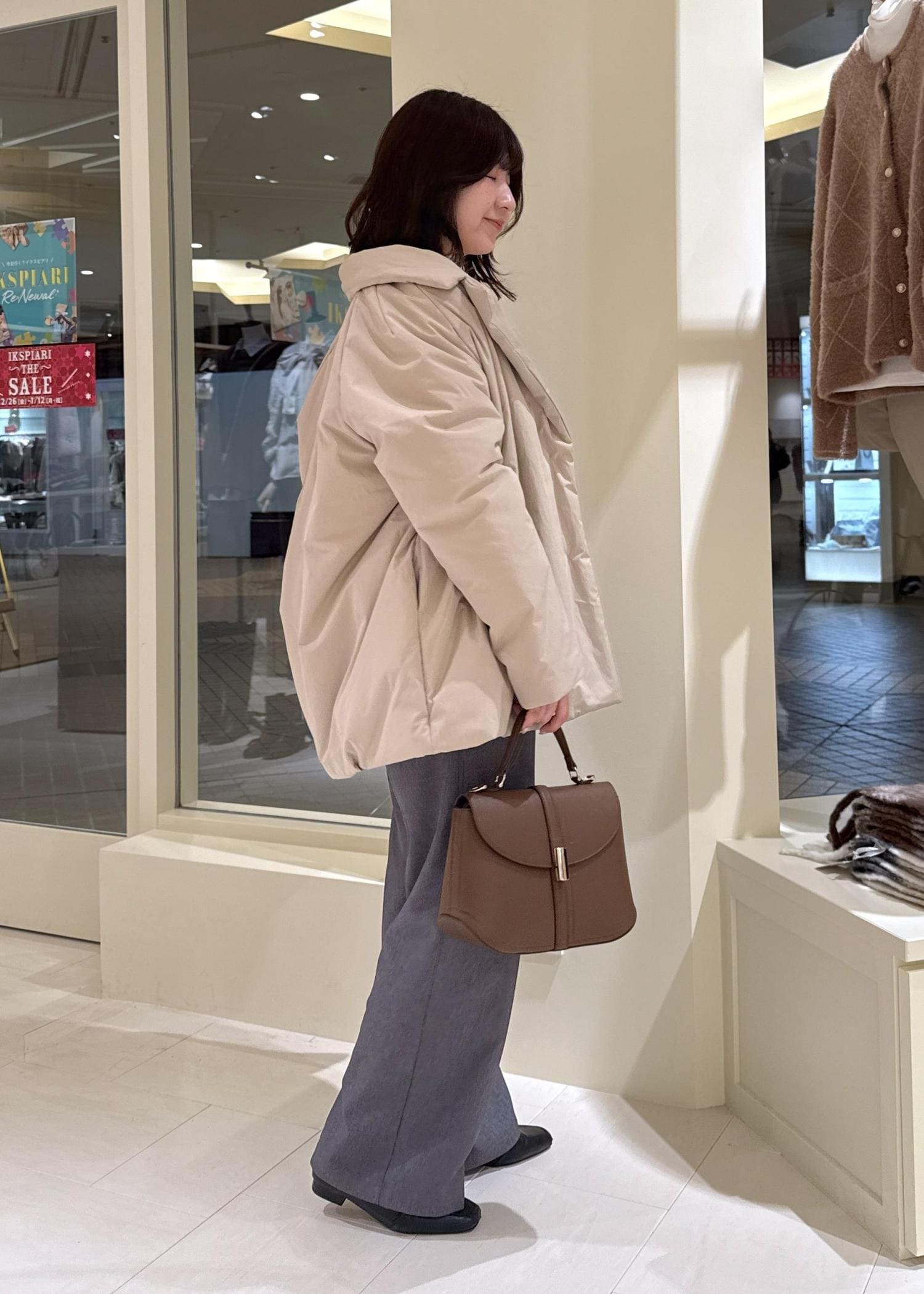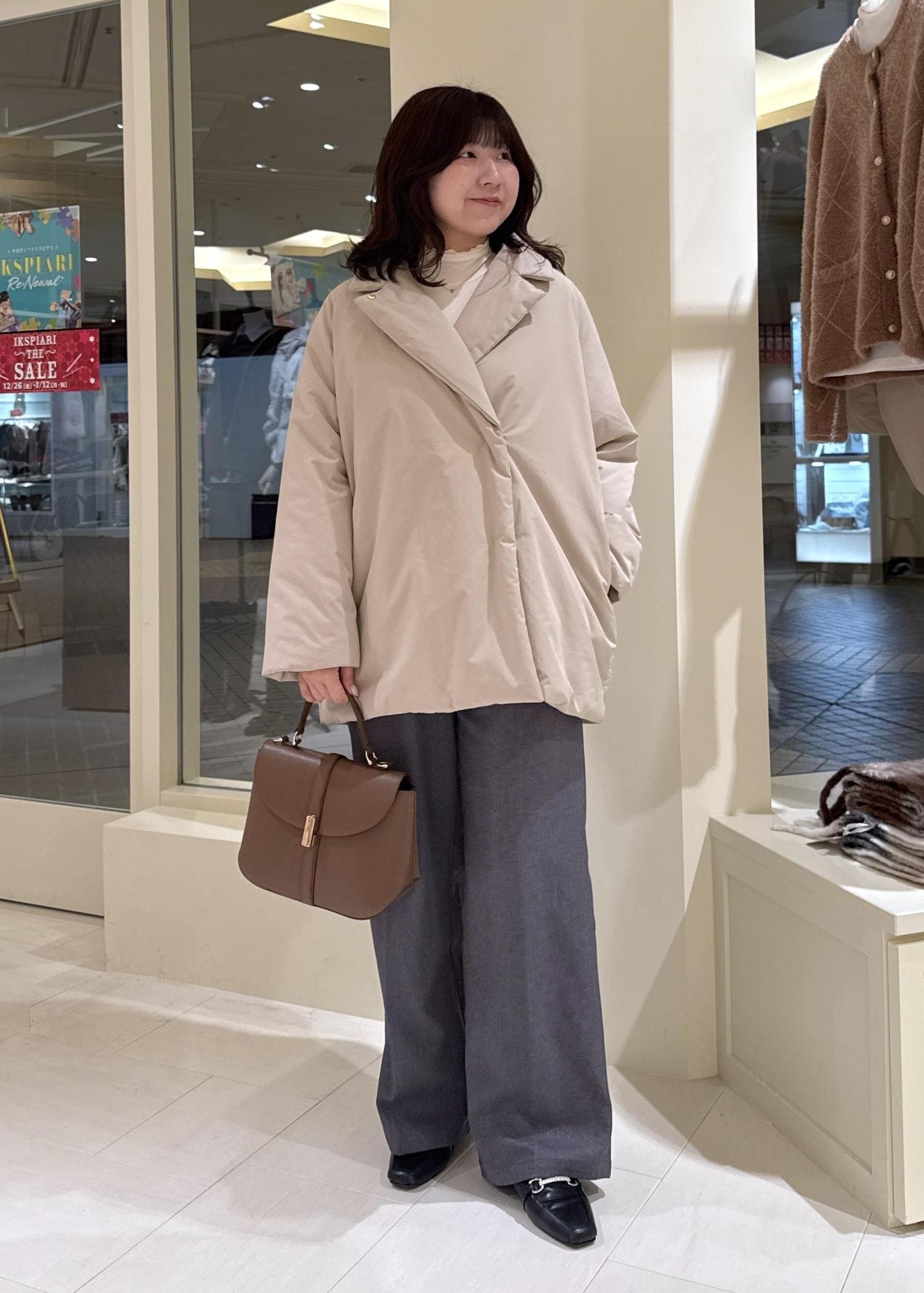 今まで丈がジャストより少し短く感じていたので、余計に下半身が太く見えてしまうのが悩みでしたが、ズルっと着れる丈感で脚が長く見せれます。