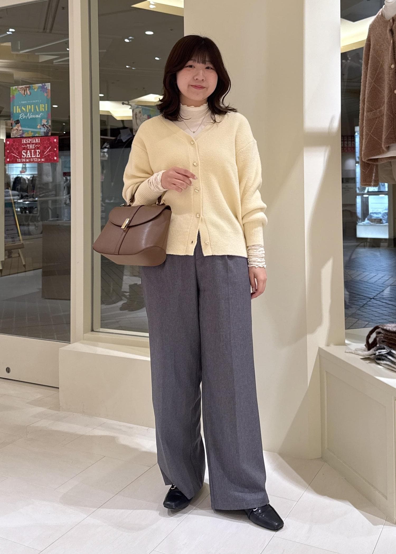 イエローと言ってもクリーム系のカラーで、グレーのパンツと合わせて大人っぽく仕上げるのが◎