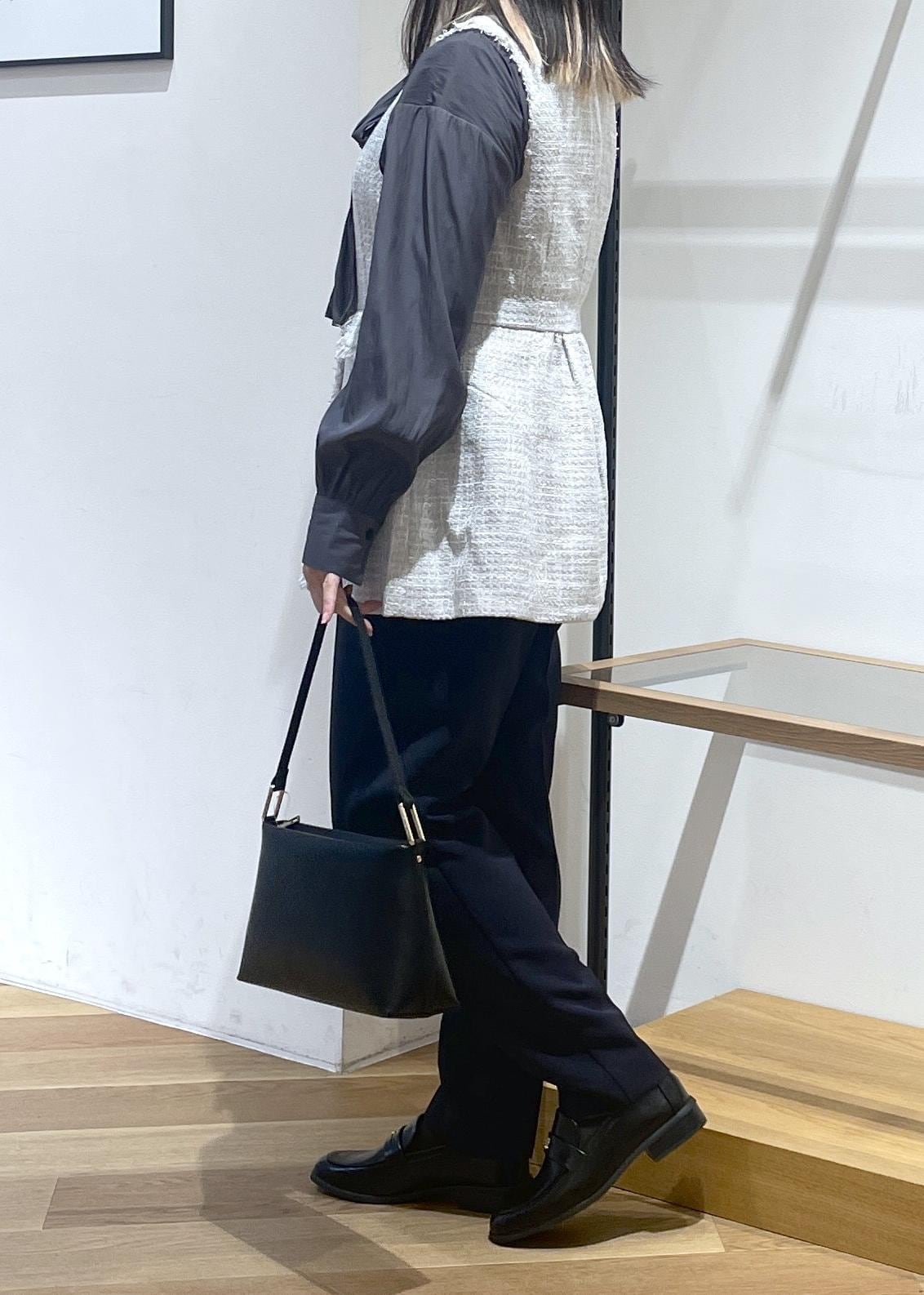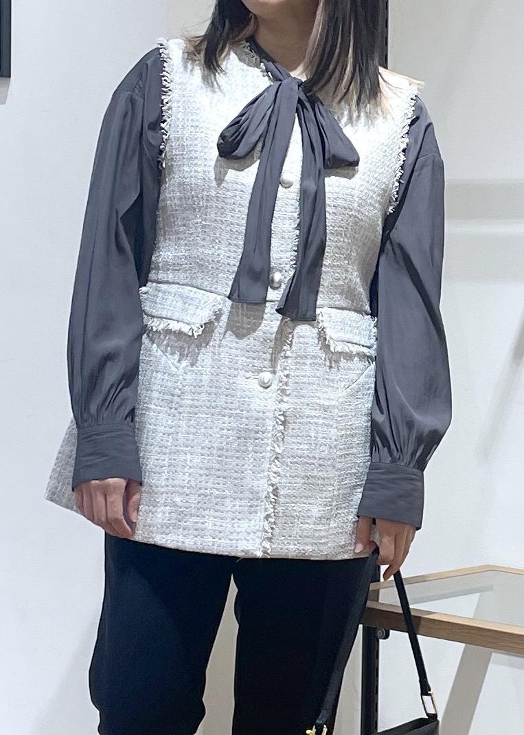 大人気のツイードベストです。ウエスト部分の切り返しが華奢見え効果アリです。カジュアルにもセレモニーにもどんなシーンでも着用して頂ける万能ツイードベストです。