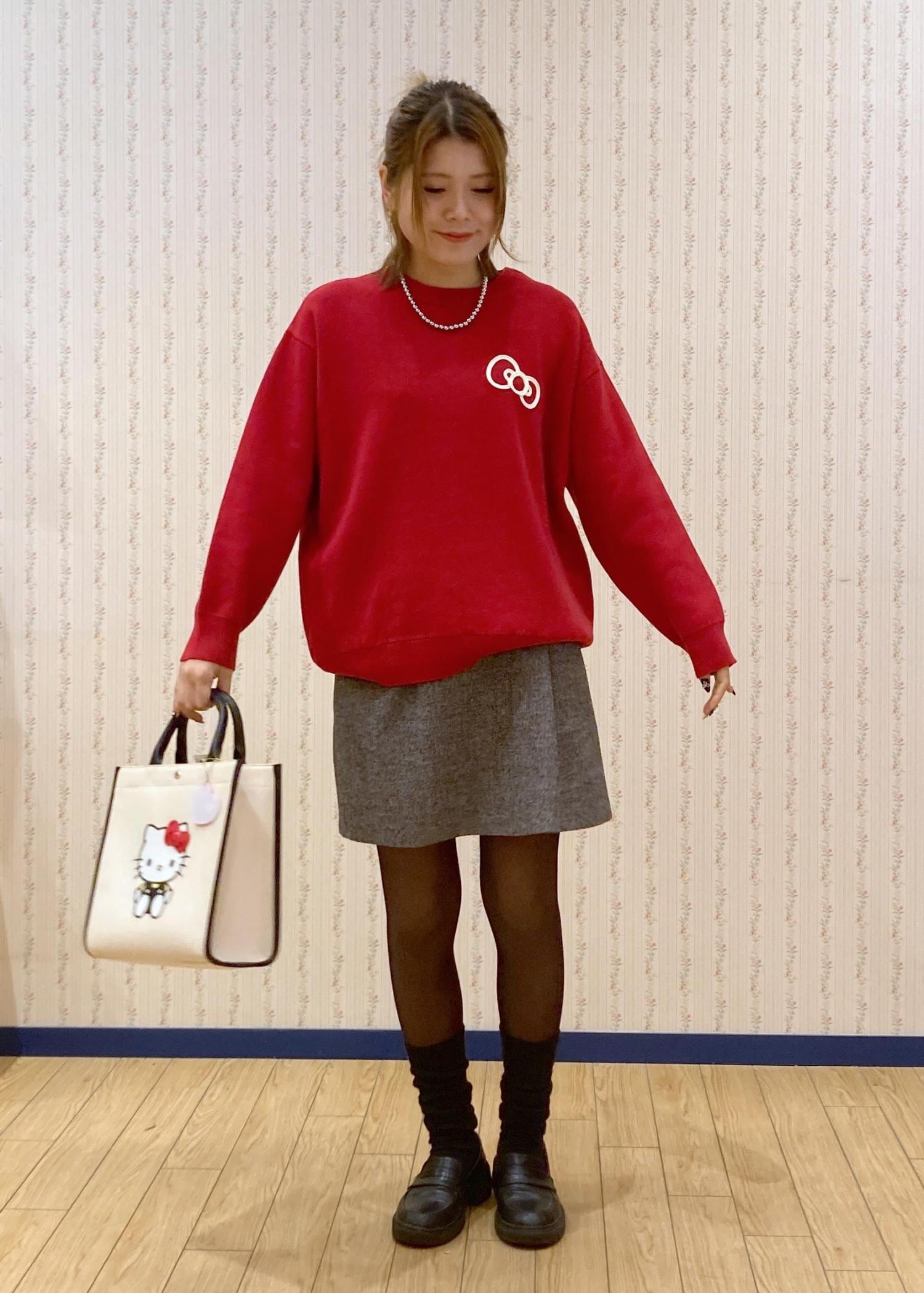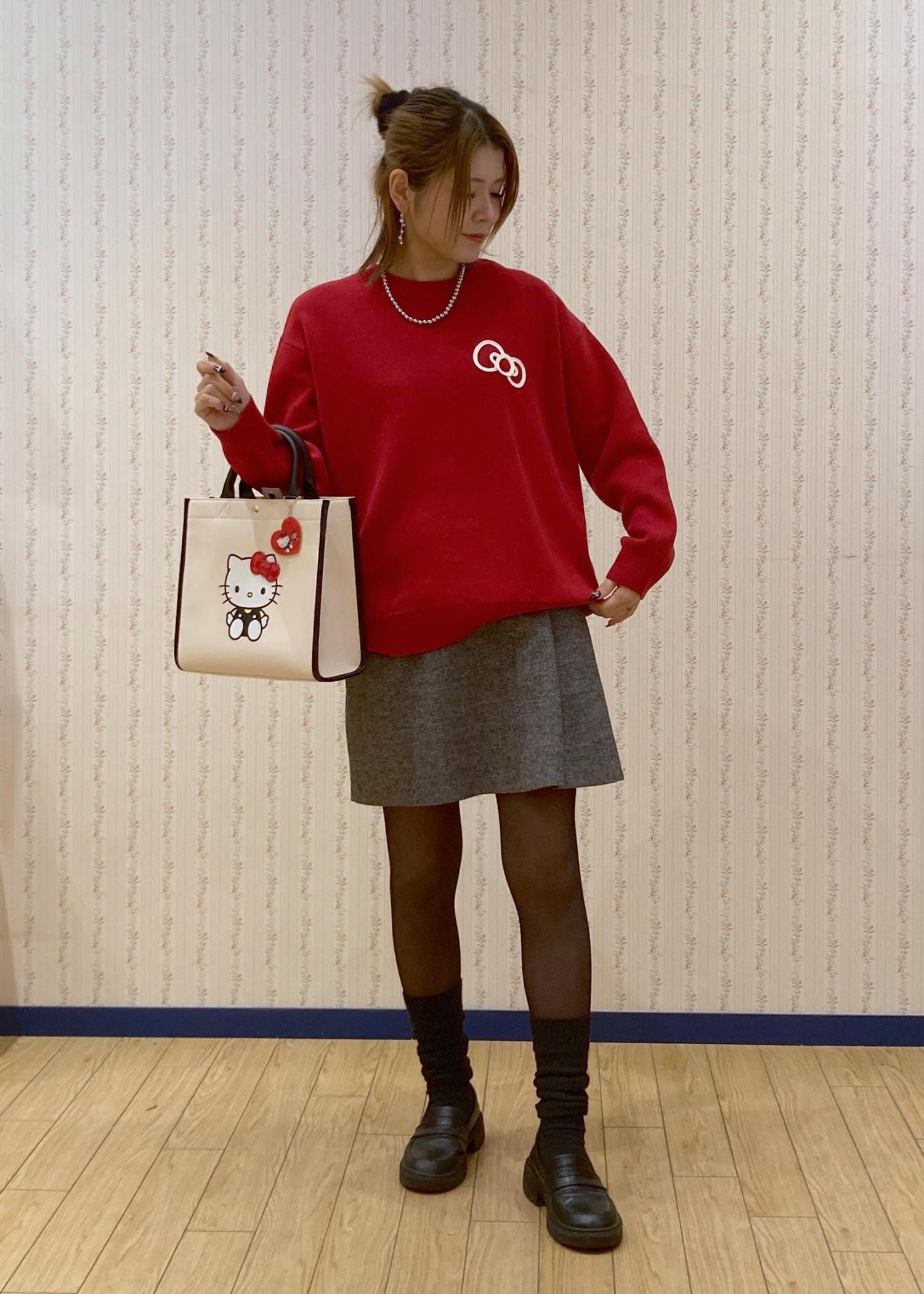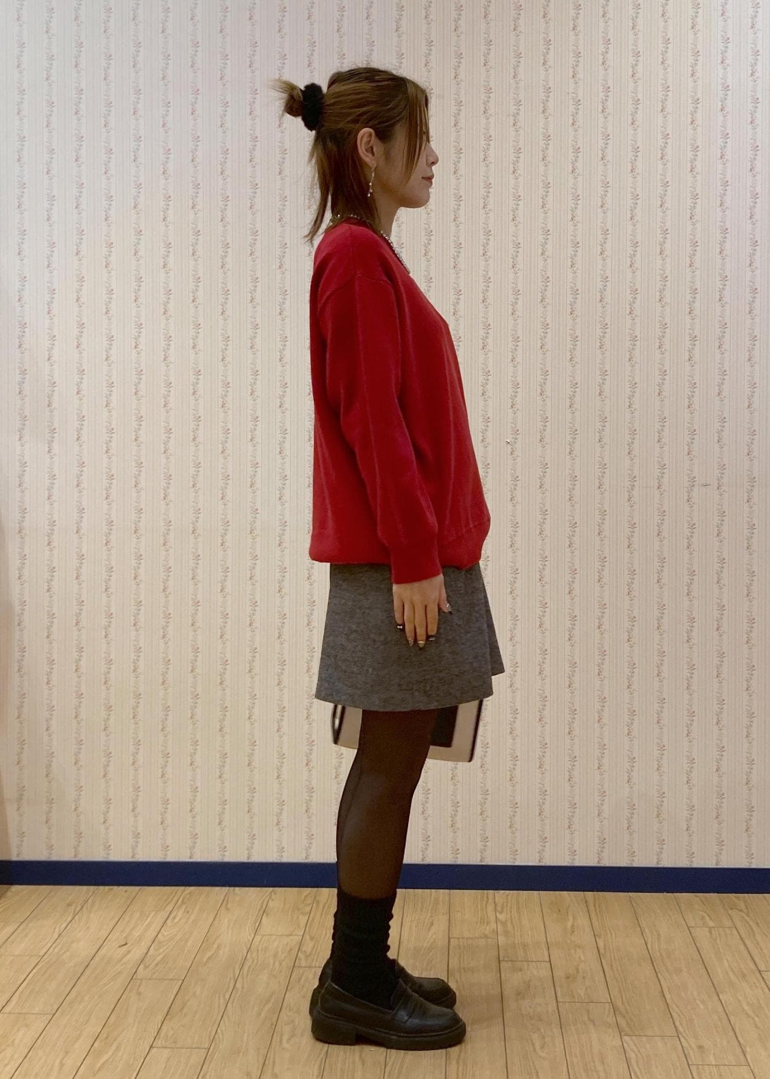 長めの着丈のニットとミニスカートのバランスがポイントです!