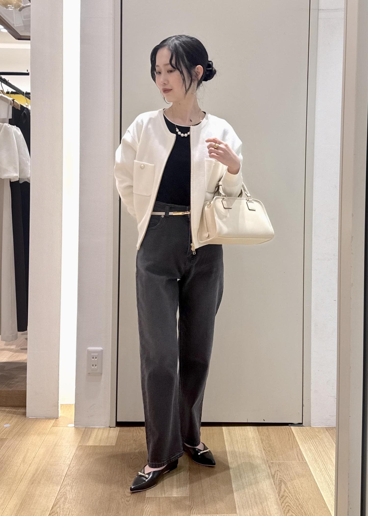 オールホワイトでまとめる際には、クリームがかった白と組み合わせることでスタイリングに変化をつけられます。