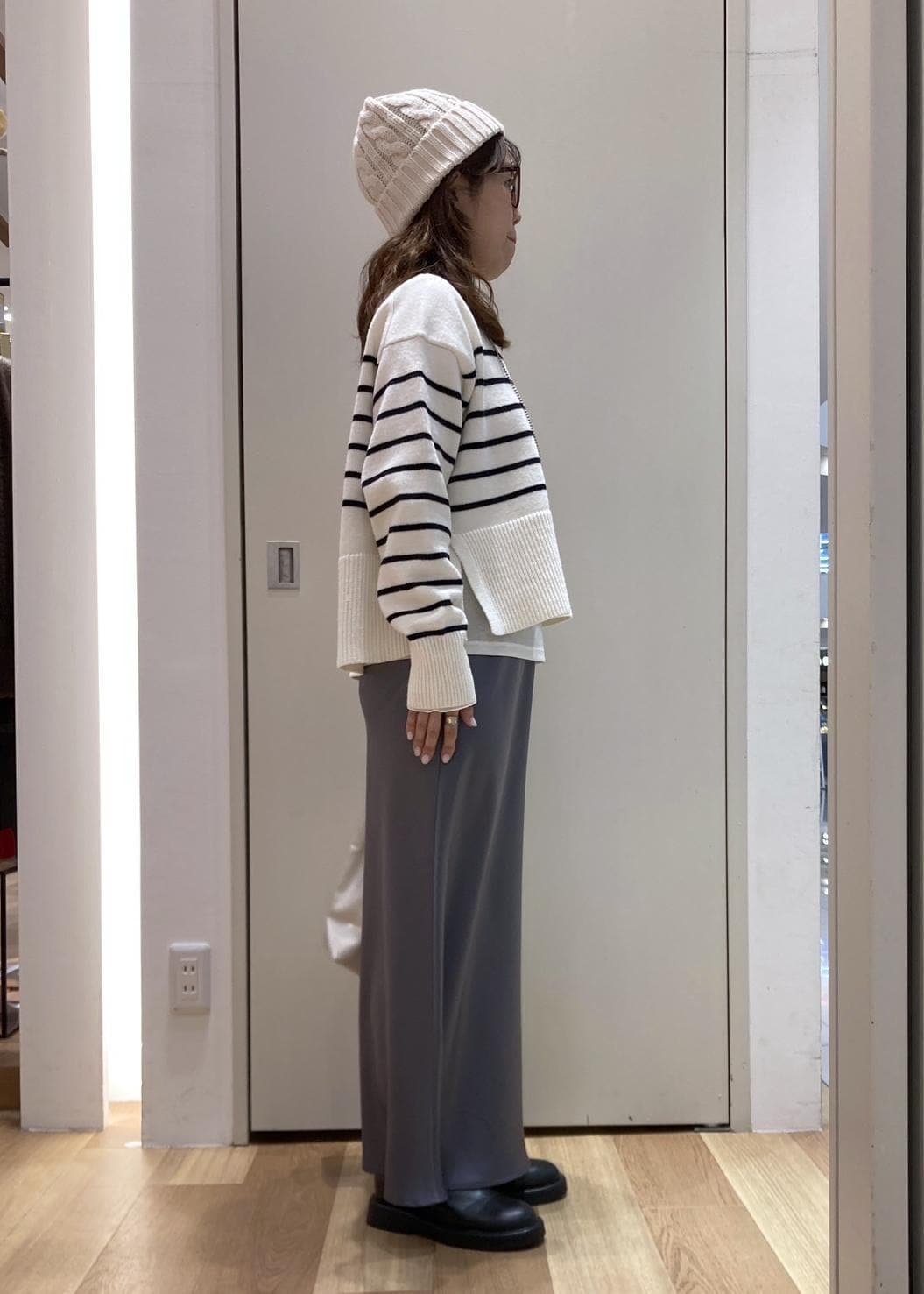 157cmでフラットヒールでも履ける長さです。