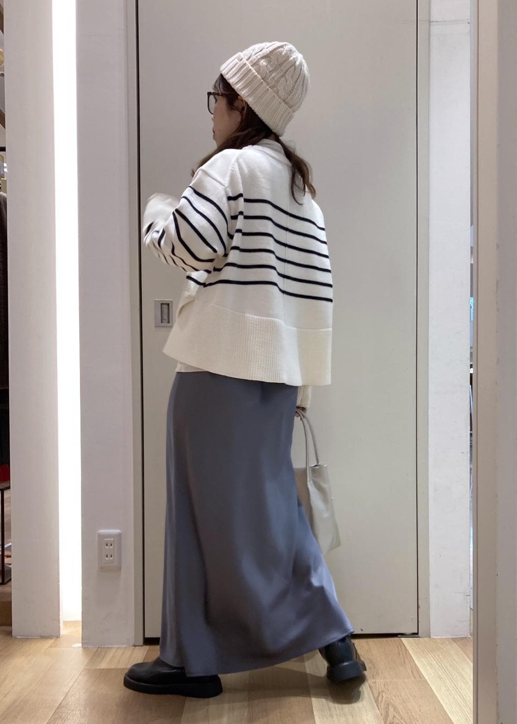 おでかけにぴったりなニット帽、フラットヒールのブーツを合わせました。
