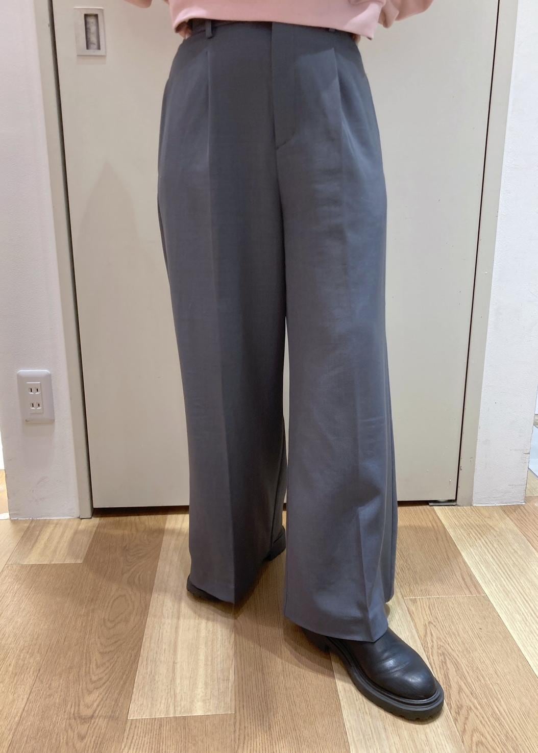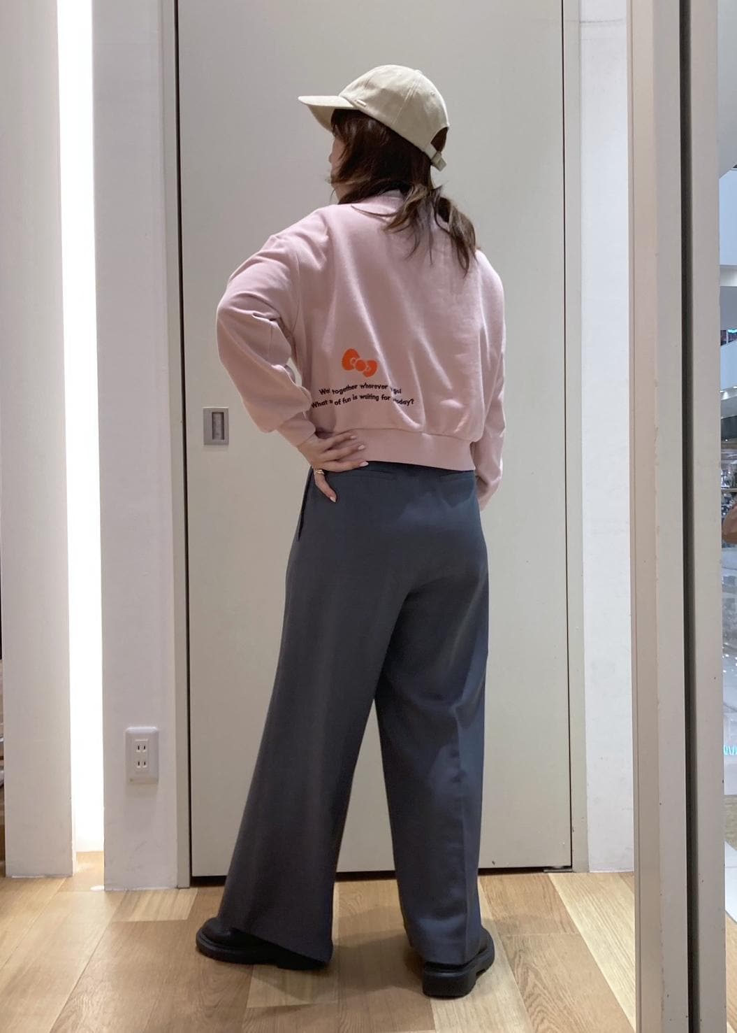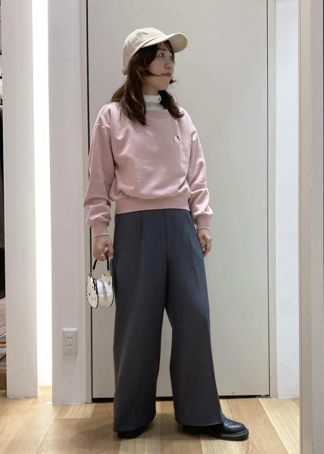 着丈がコンパクトなスウェットに、ハイウエストのパンツあわせでバランスがスッキリみえるようにしています。