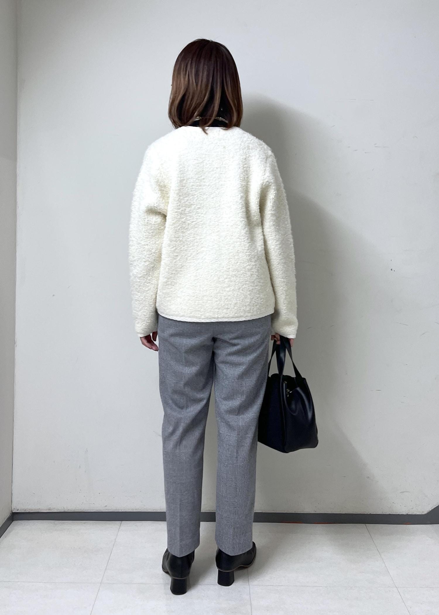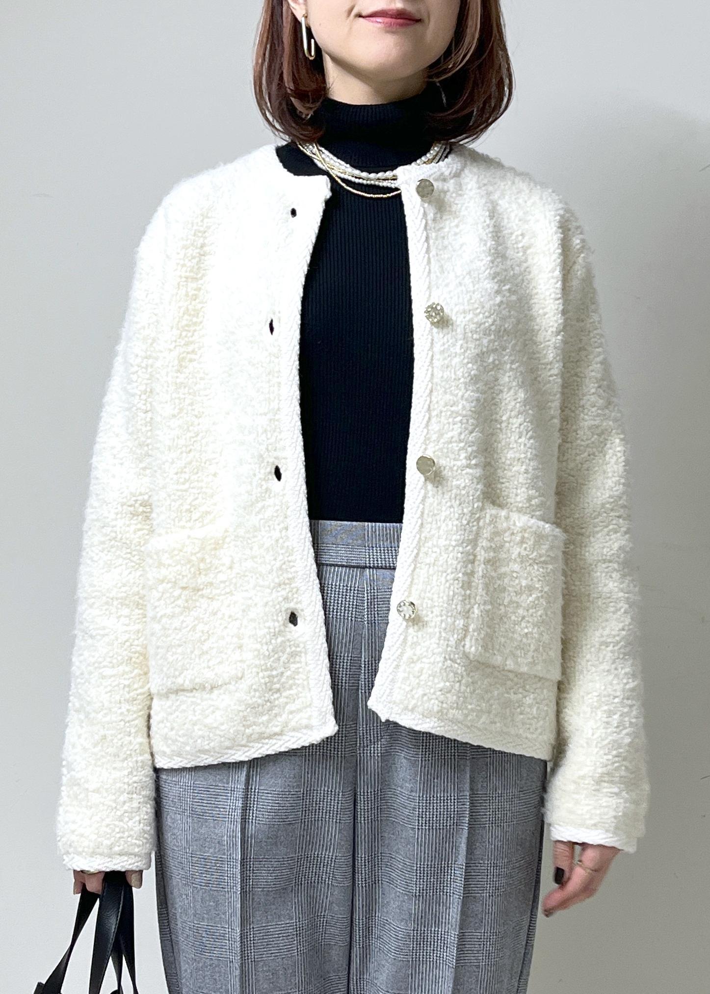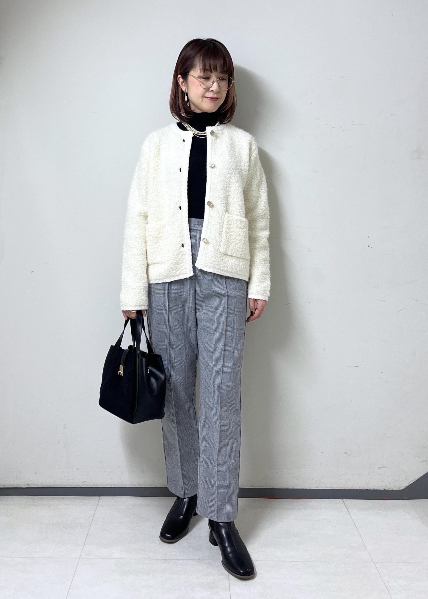 タートルネックニットとループ編みニットブルゾンを合わせて、暖かな印象に♪