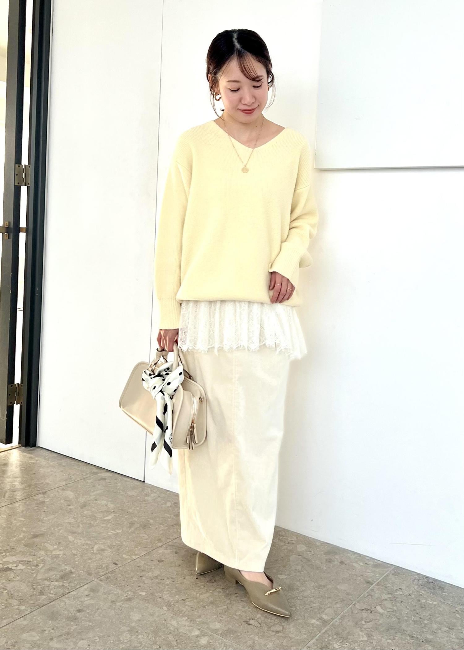 イエローのトップスにレースインナーを合わせて、愛らしい印象に◎