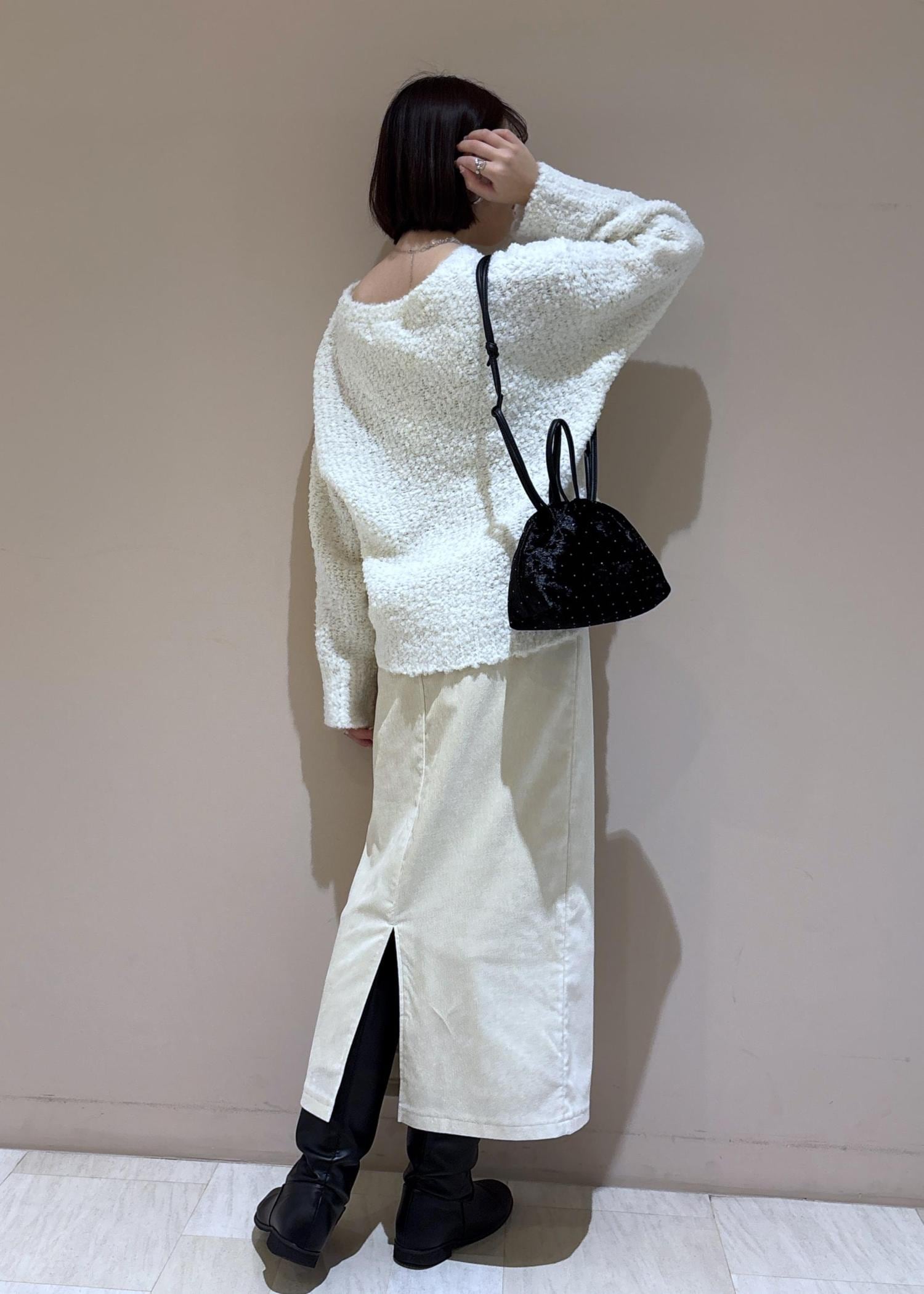 もこもこニットにアイラインスカートを合わせて、女っぽ大人女子コーデに。