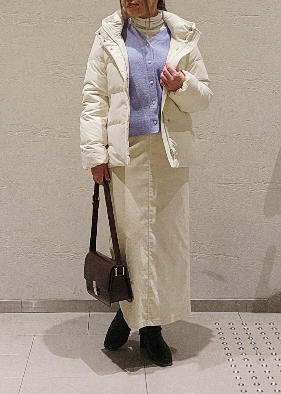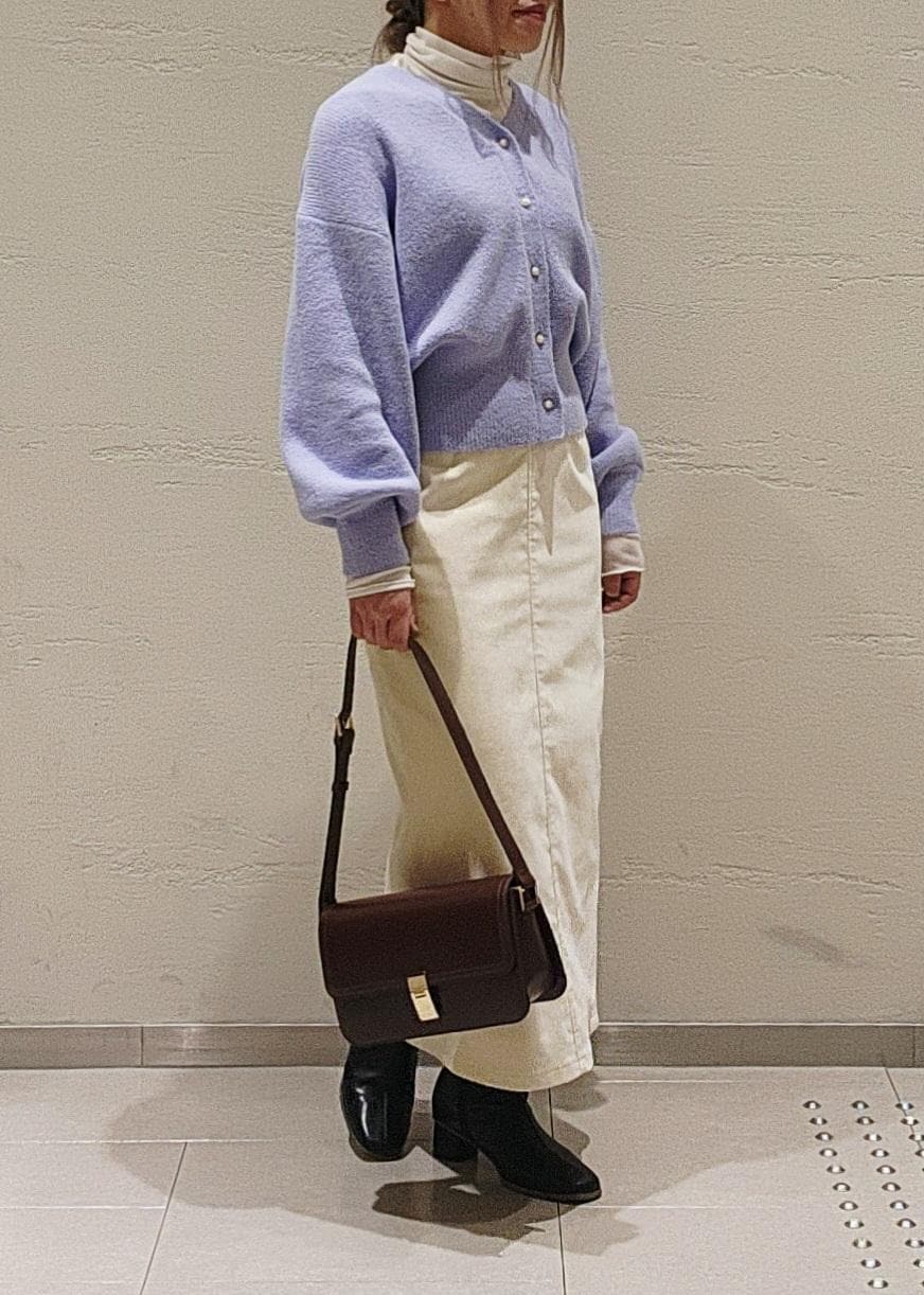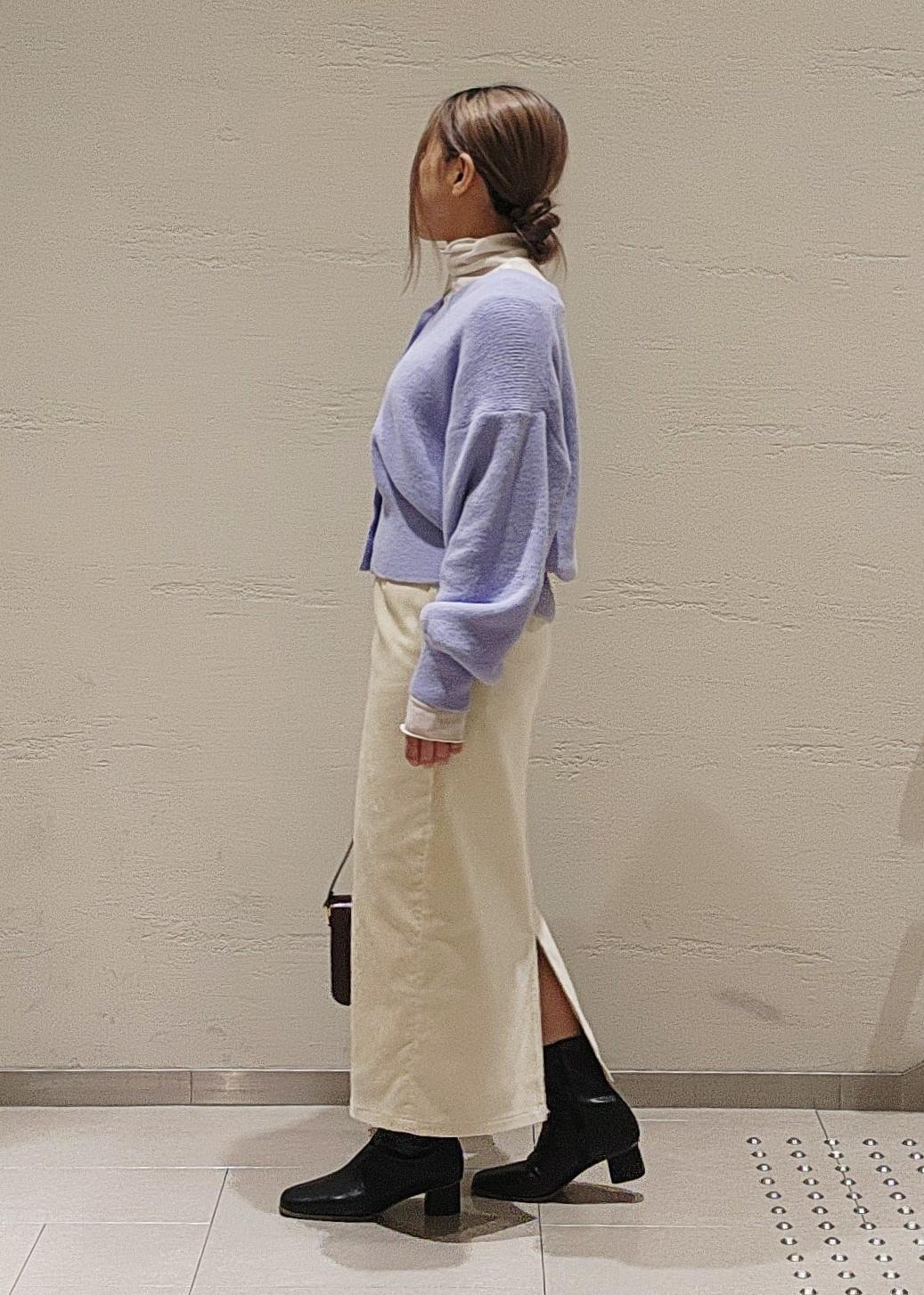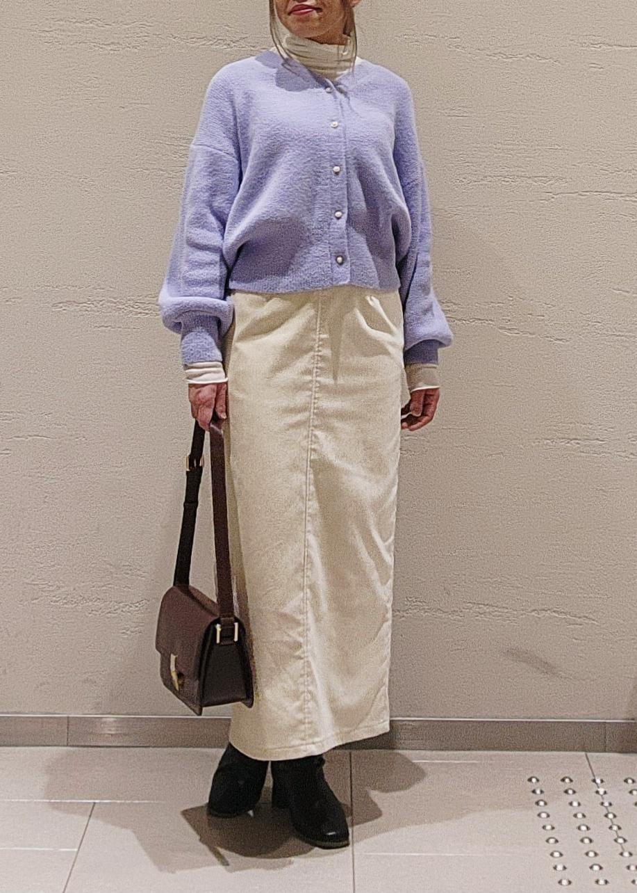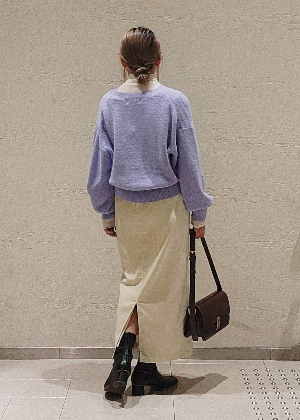 パープルを差し色にコートを脱いでも可愛いコーデにしました。