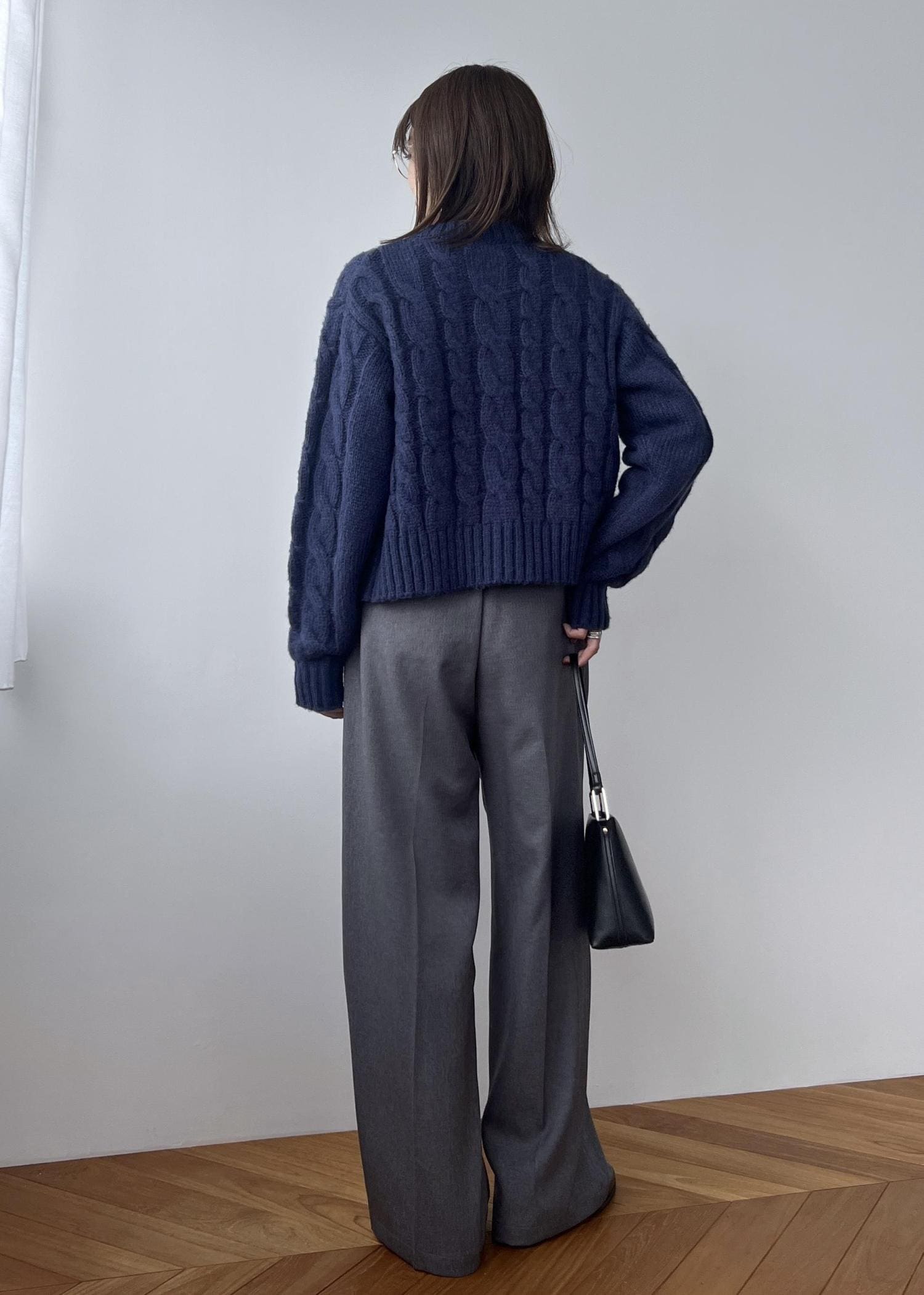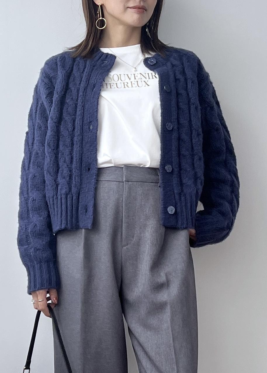 厚みのあるケーブル編みのニットカーデは、前を開けて羽織スタイルも◎。