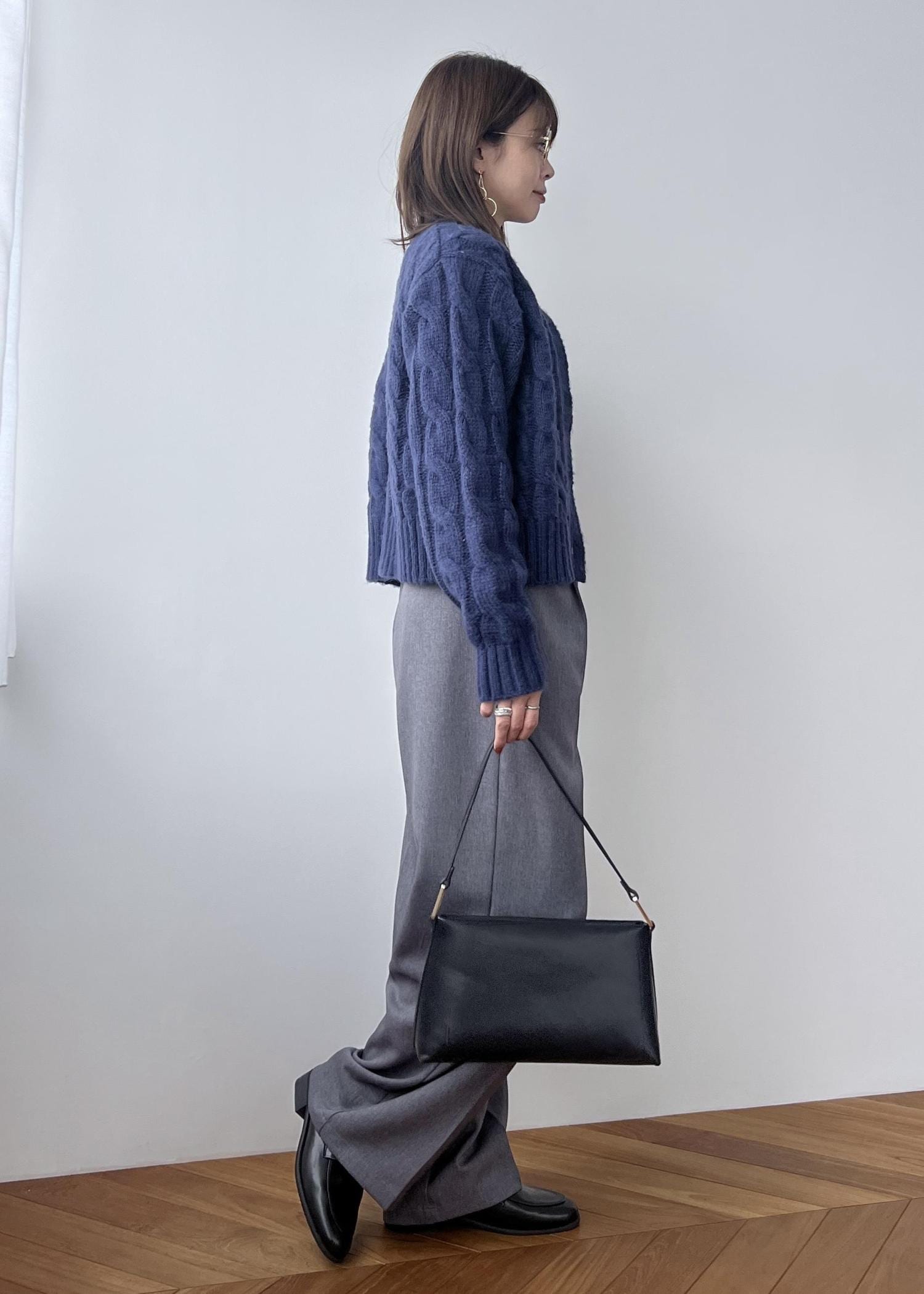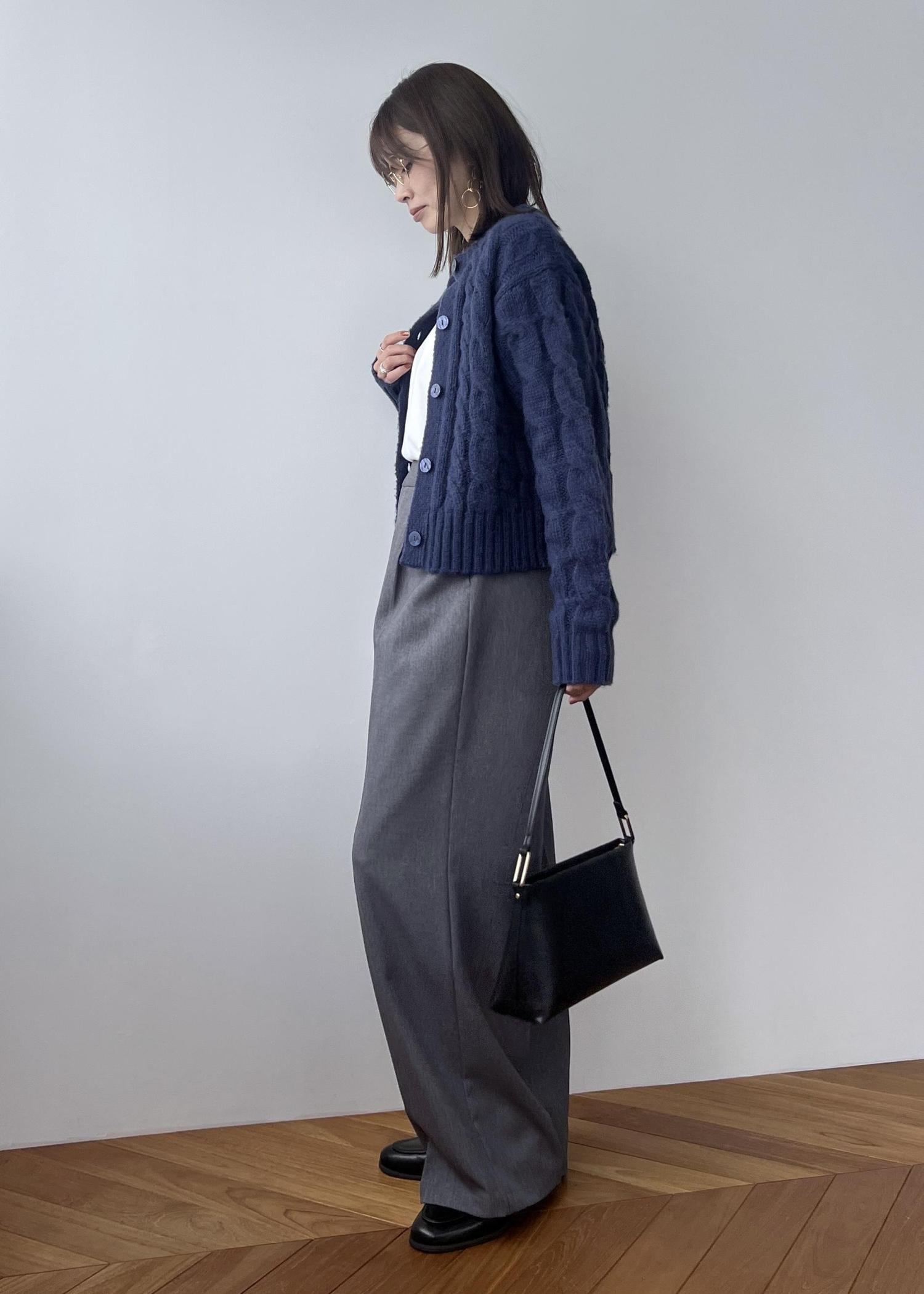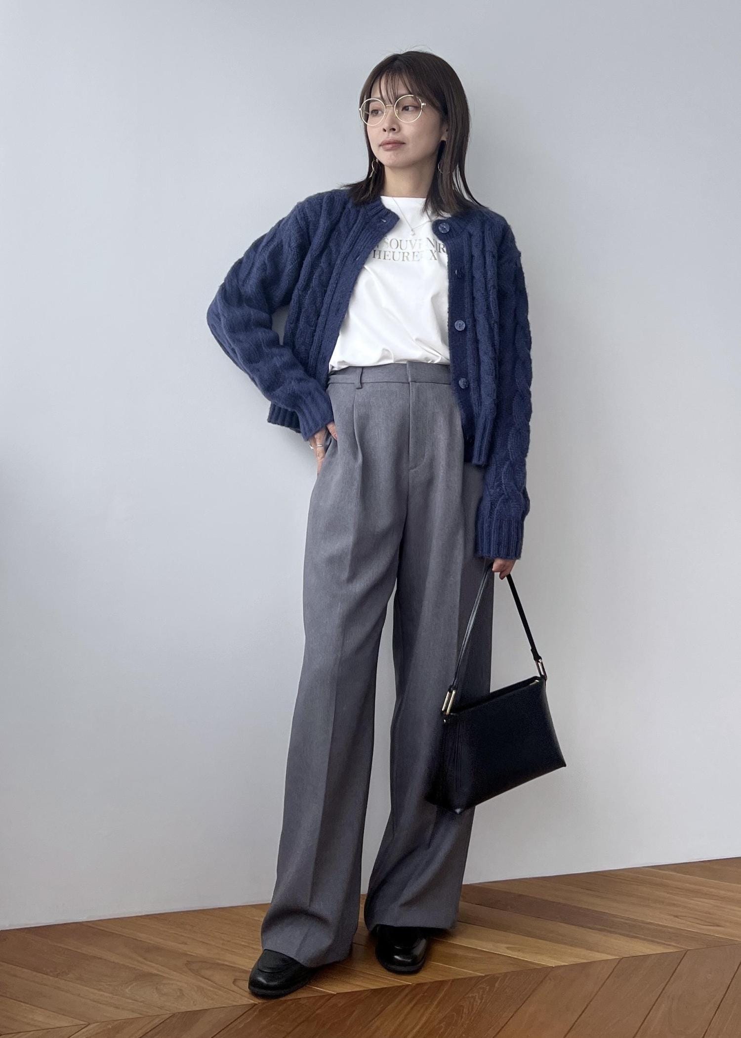 深みのあるネイビーカラーのカーディガンには、ワイドパンツはグレーで大人カジュアルコーデに。