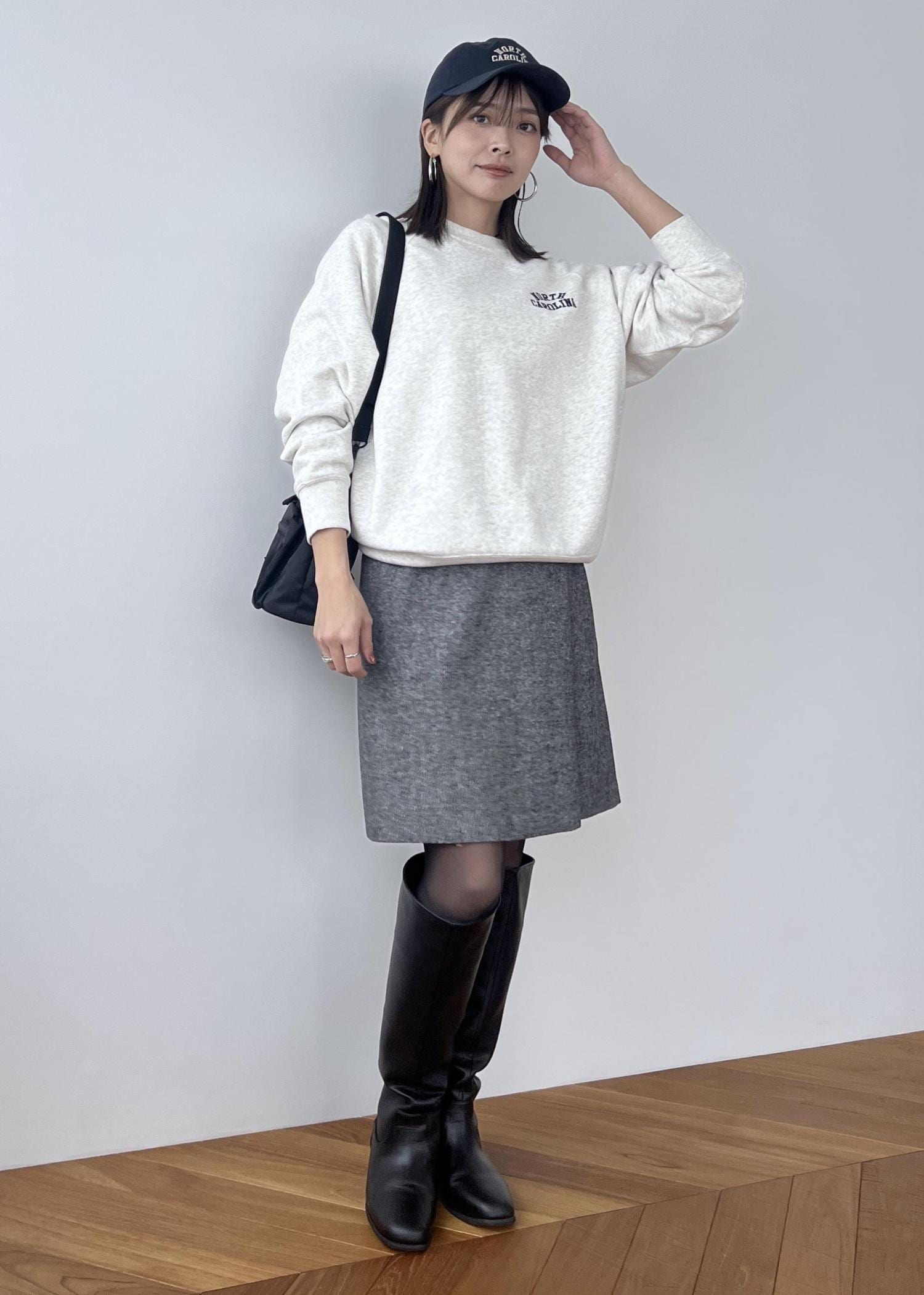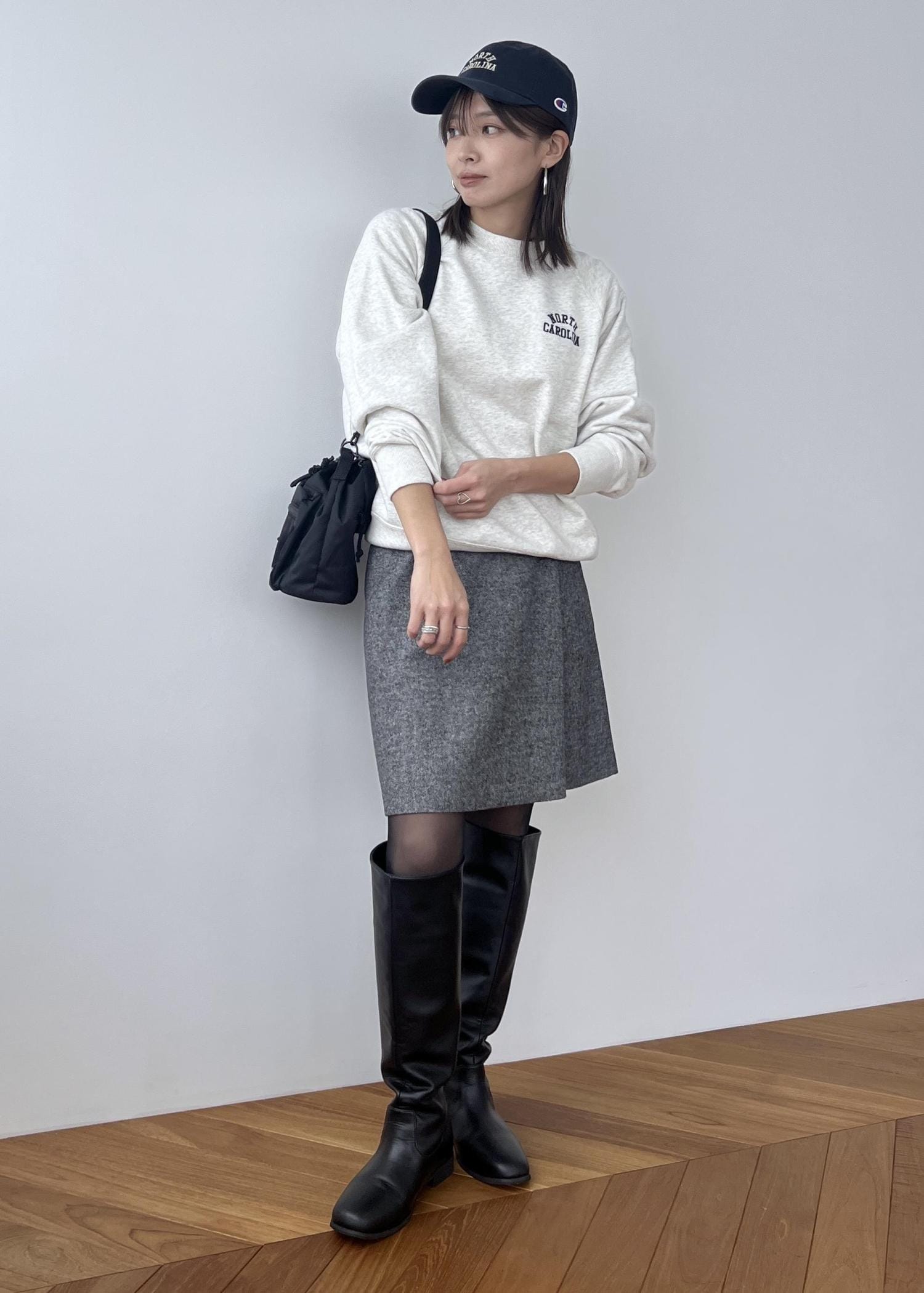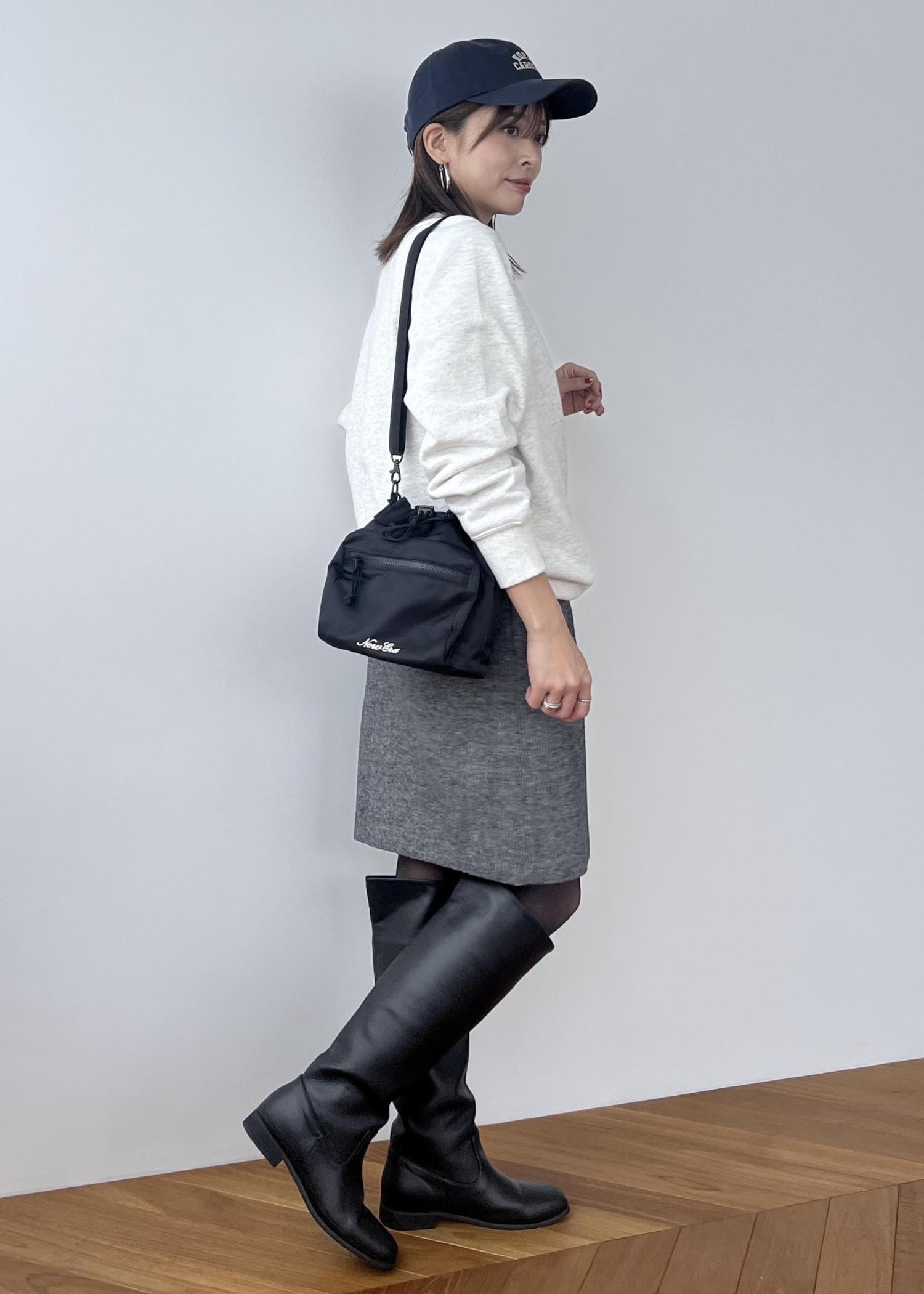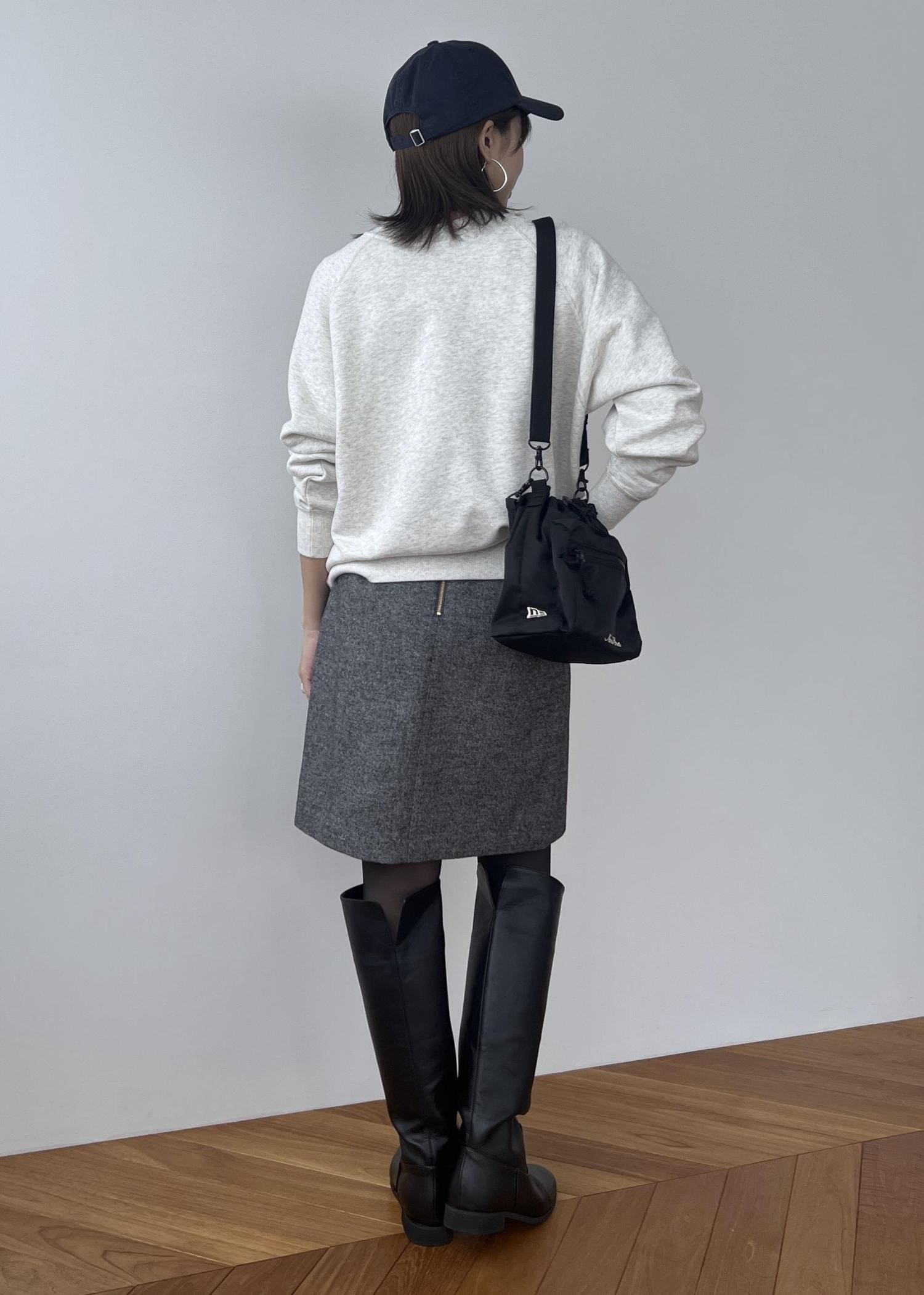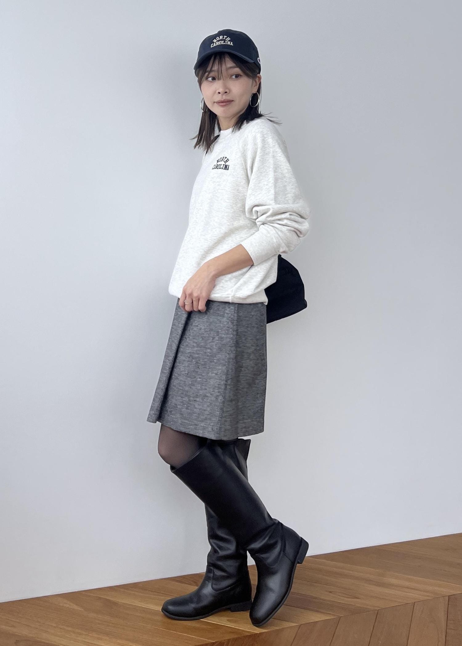 膝の見える丈感でロングブーツとの相性も◎。 -