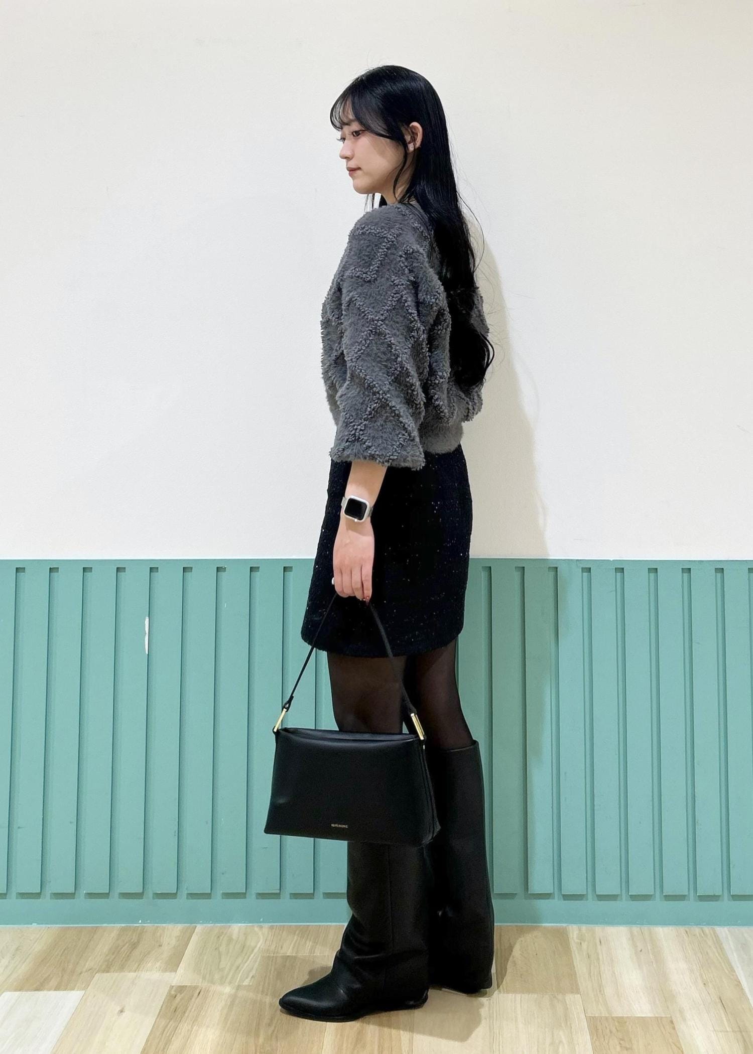 足元はロングブーツを合わせることで縦のラインが強調され、