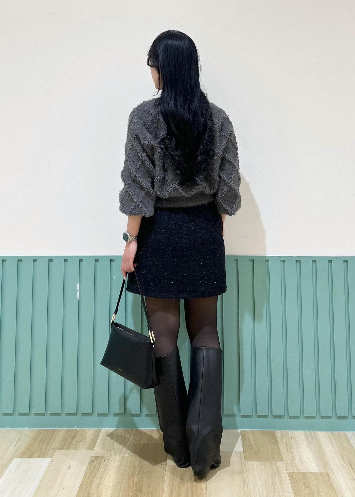 しっかり短丈なので、ロングブーツを合わせると足がすっきり見えます。 -