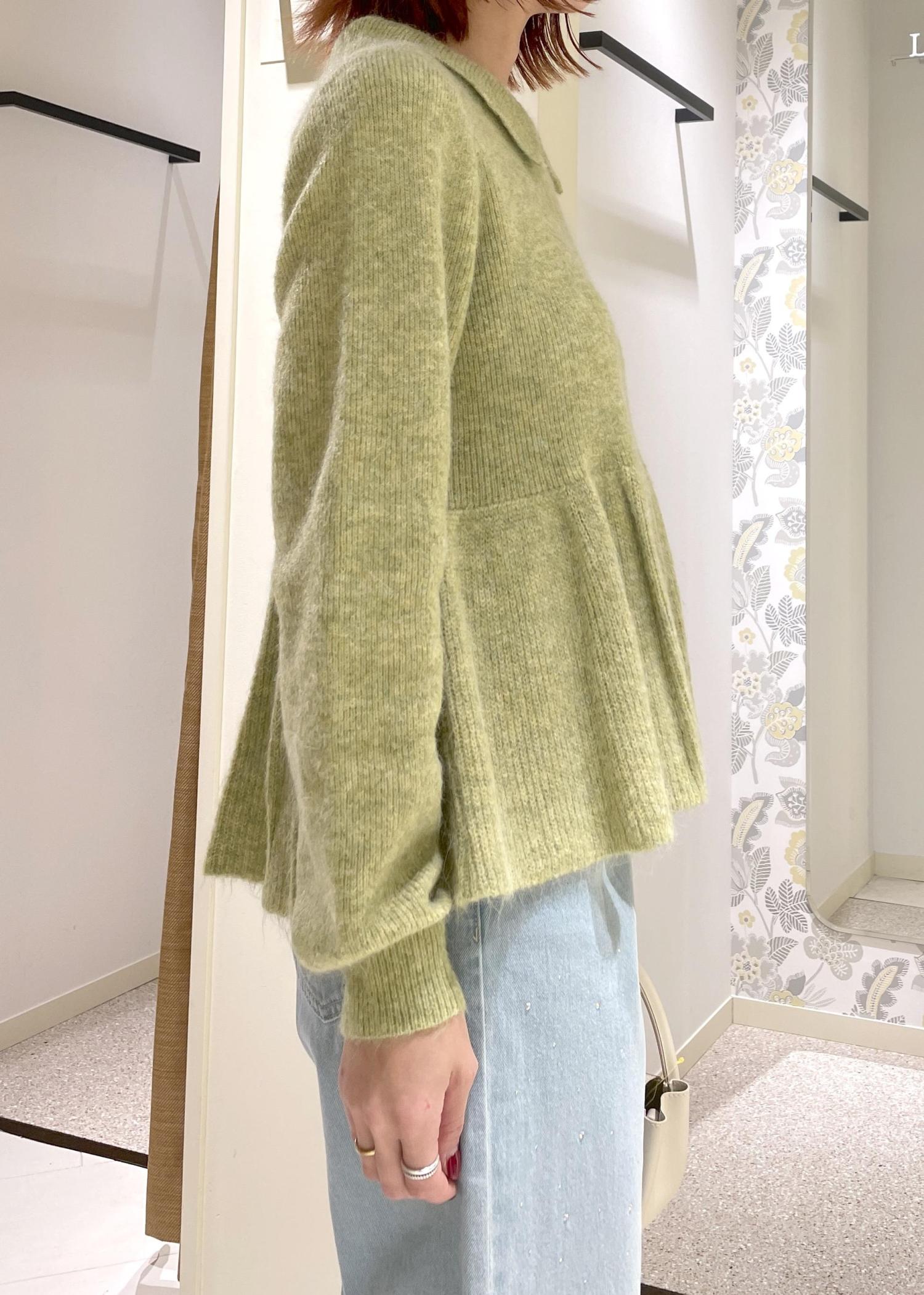 柔らかなグリーンのカラーが顔まわりを明るく華やかに見せてくれるペプラムニット!