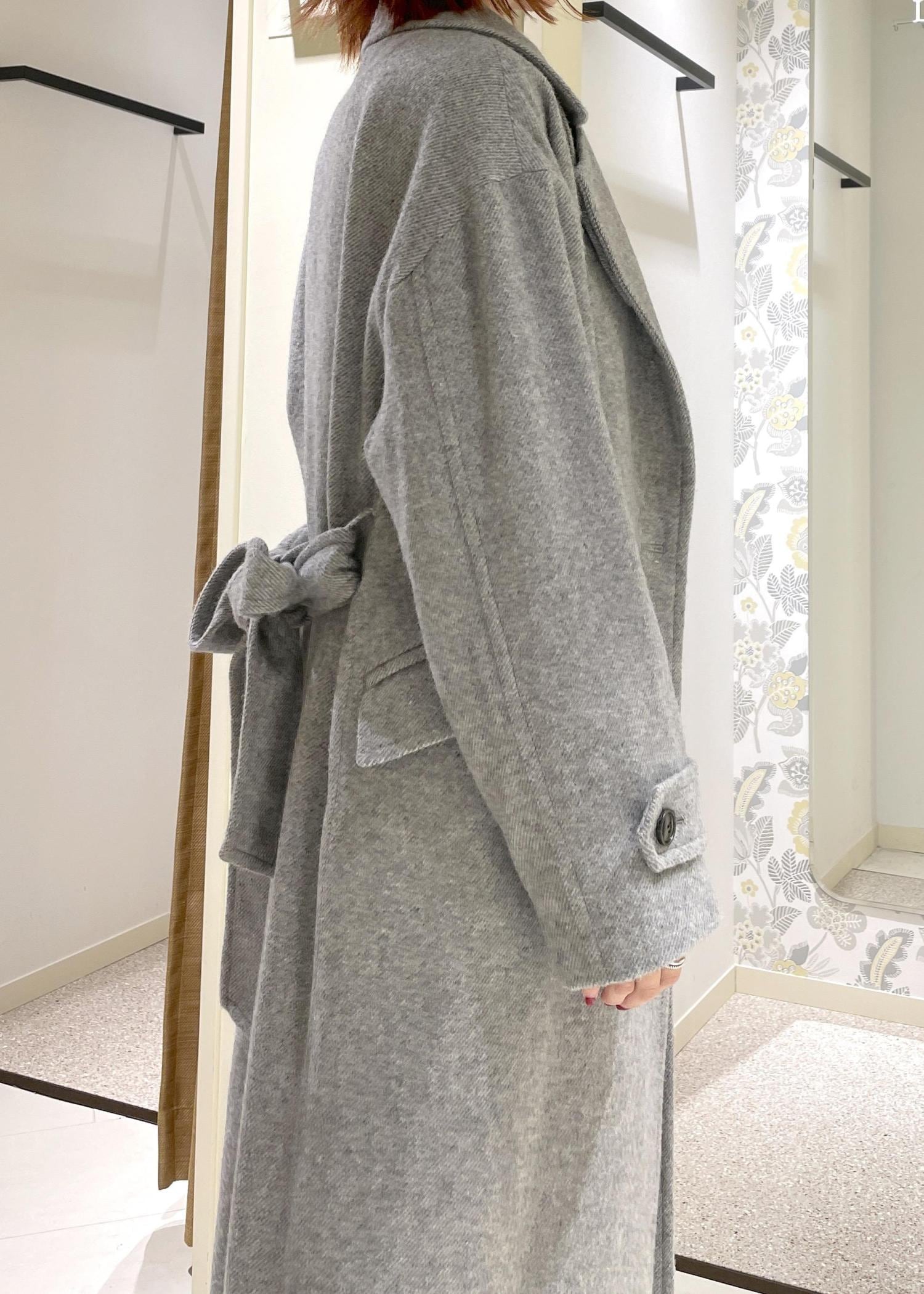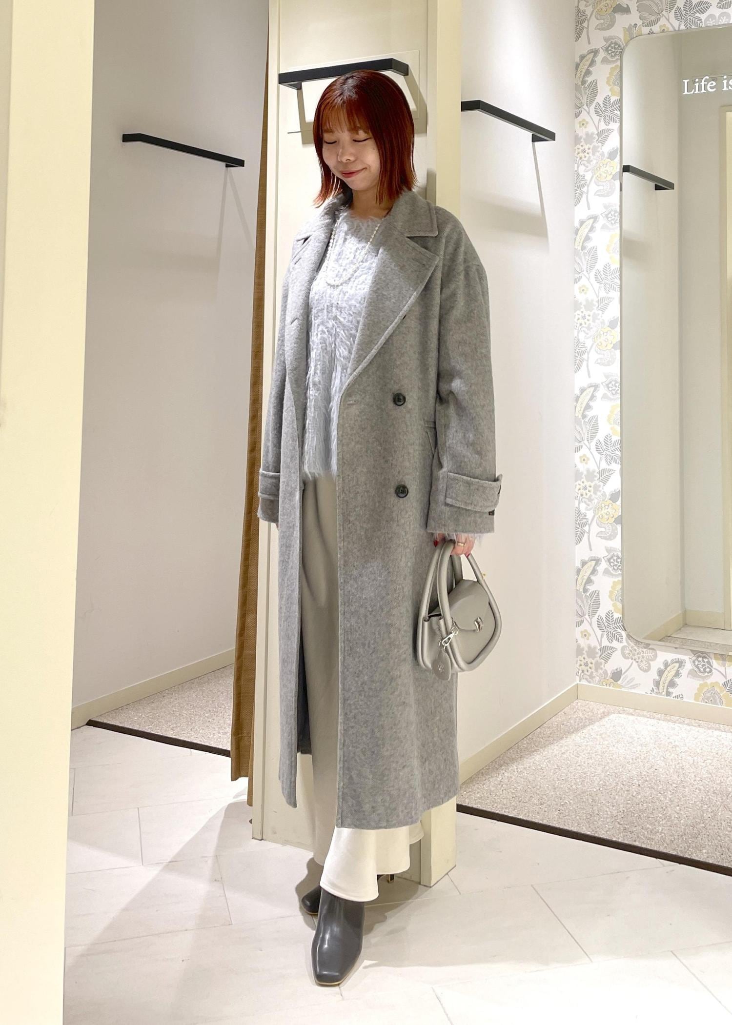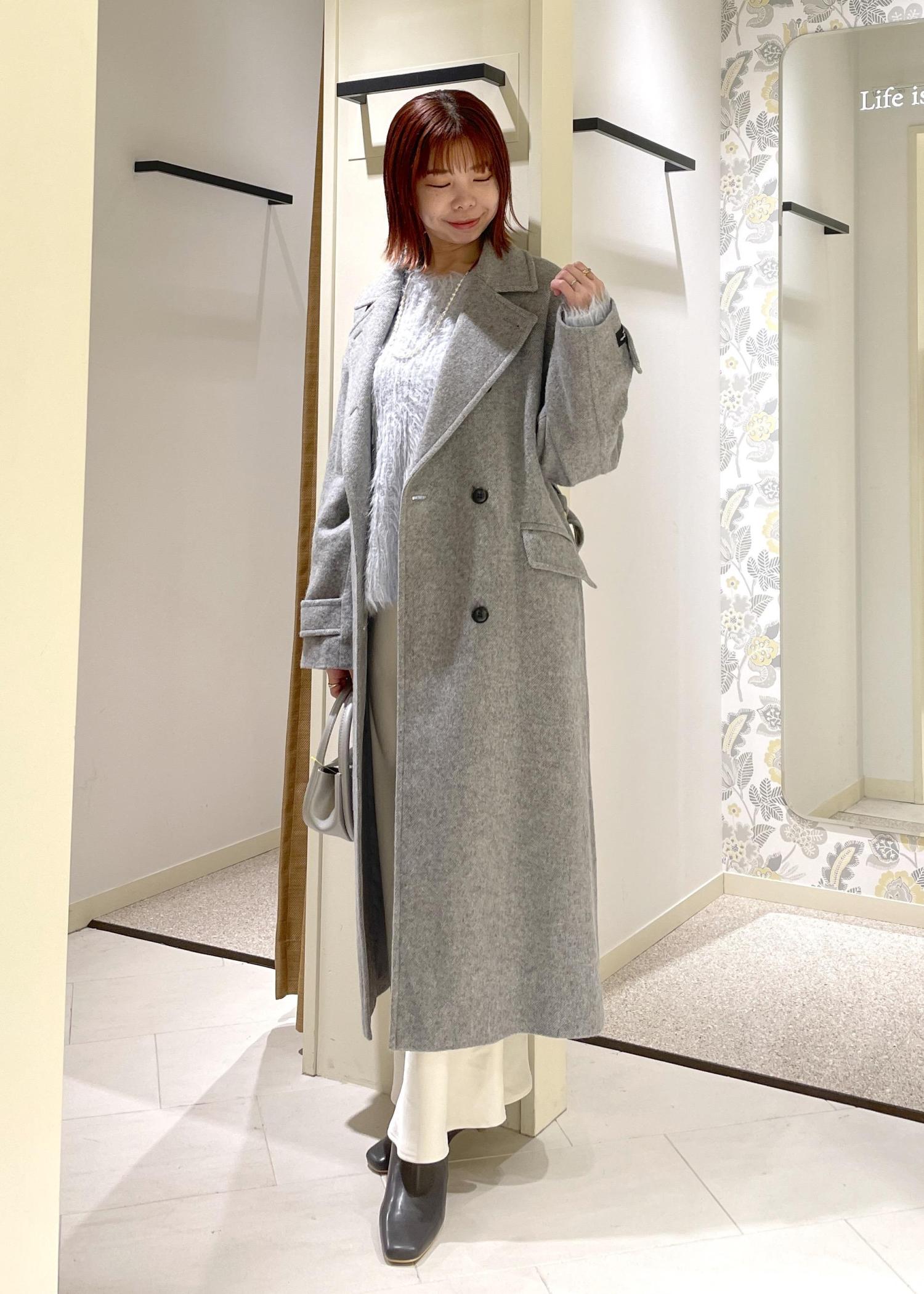 着丈は、膝下でロング丈ですが、ボタンやポケット位置が高く、ネックのデザインもあり、重量感を感じずバランス良く着て頂けます。
