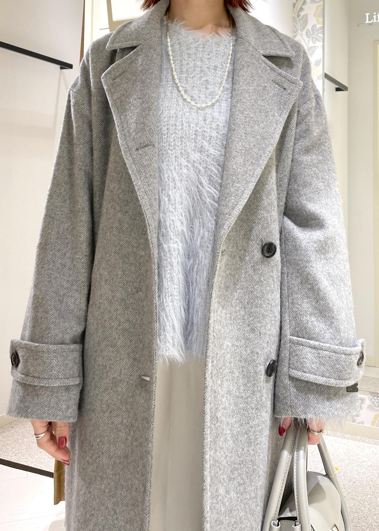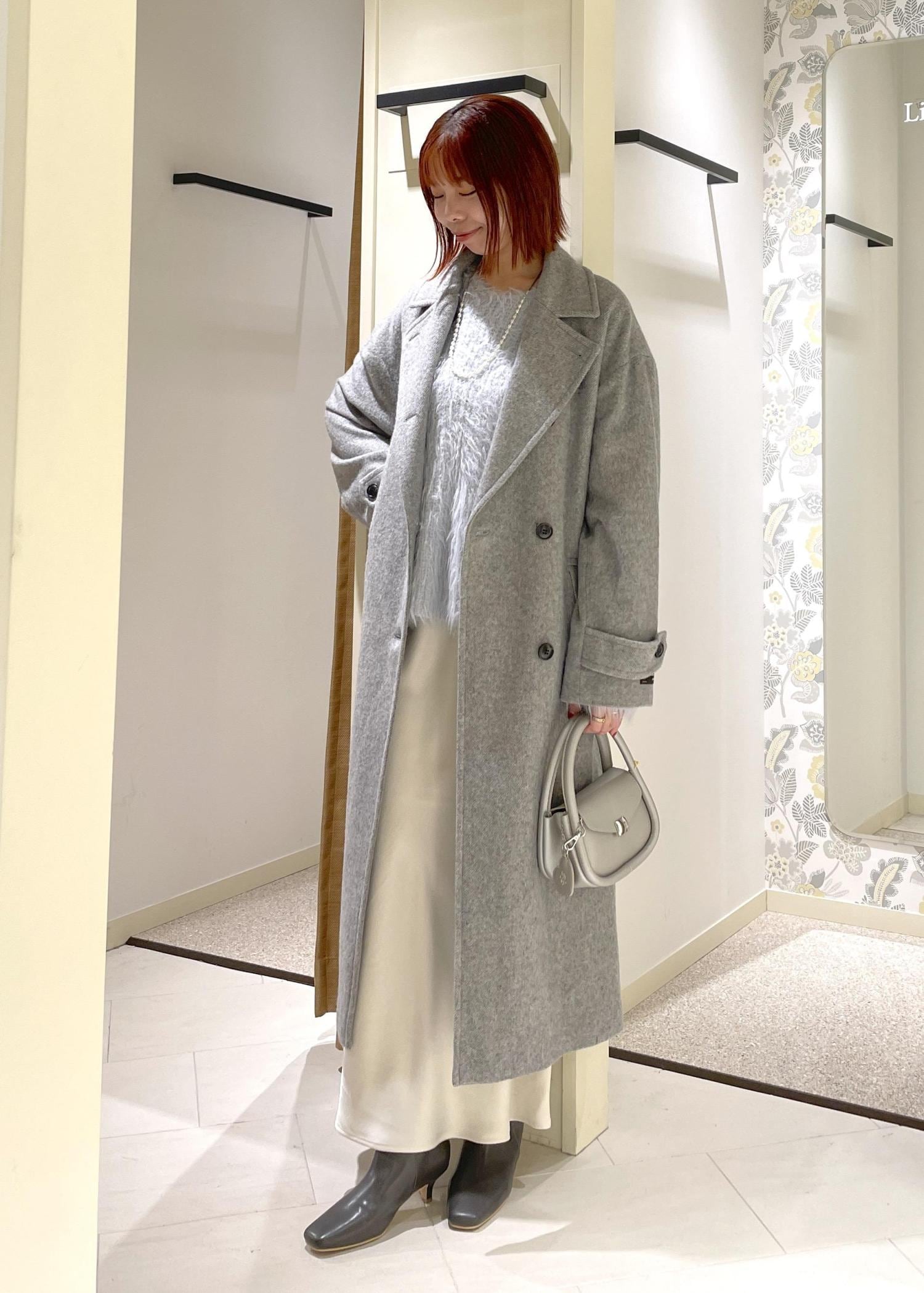 シャギーニット×サテンスカートを合わせた女性らしいスタイリングにロングコートを羽織ってこなれ感をプラスしてみました。
