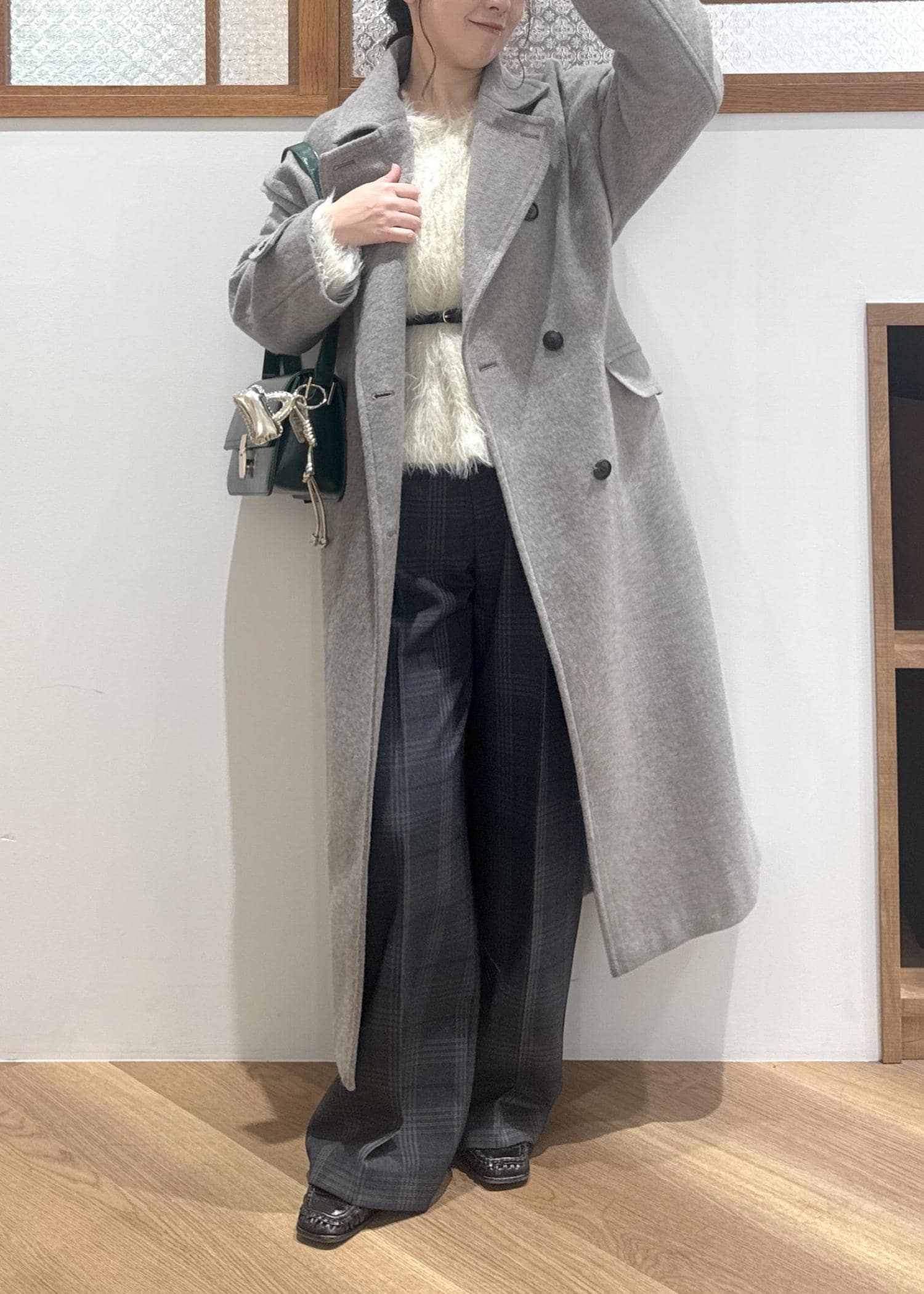 ROPÉ PICNICJAPAN FABRIC スタンドカラーロングコート/一部WEB限定カラーライトグレー / F¥15,840レビュー身長154cmでふくらはぎ下の着丈です。足首は見えます。型落ちの袖付け位置で脇・腕にゆとりがあるので重ね着も楽々です。記事をたっぷり使い身幅があるので、動いた時のドレープがキレイなコートです。毛70%配合なので軽さと暖かさも申し分無く、ご活用頂けます。