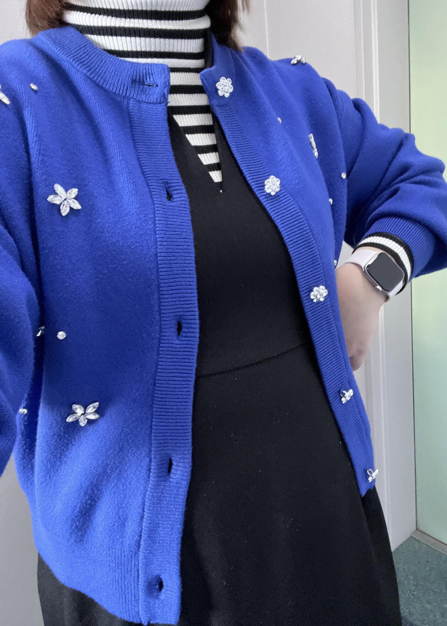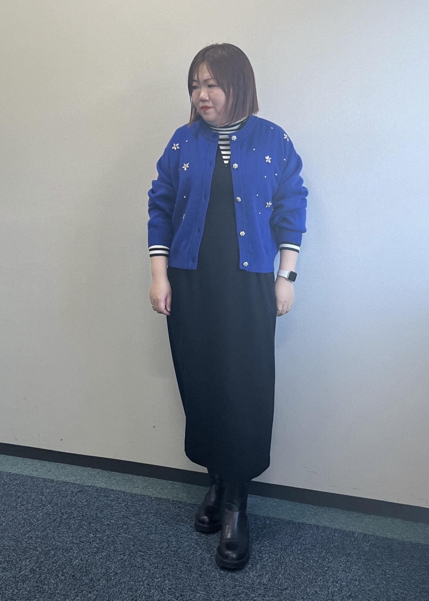 ワンピースにブルーのビジューニットカーディガンを合わせたお出かけにピッタリなコーディネートです。