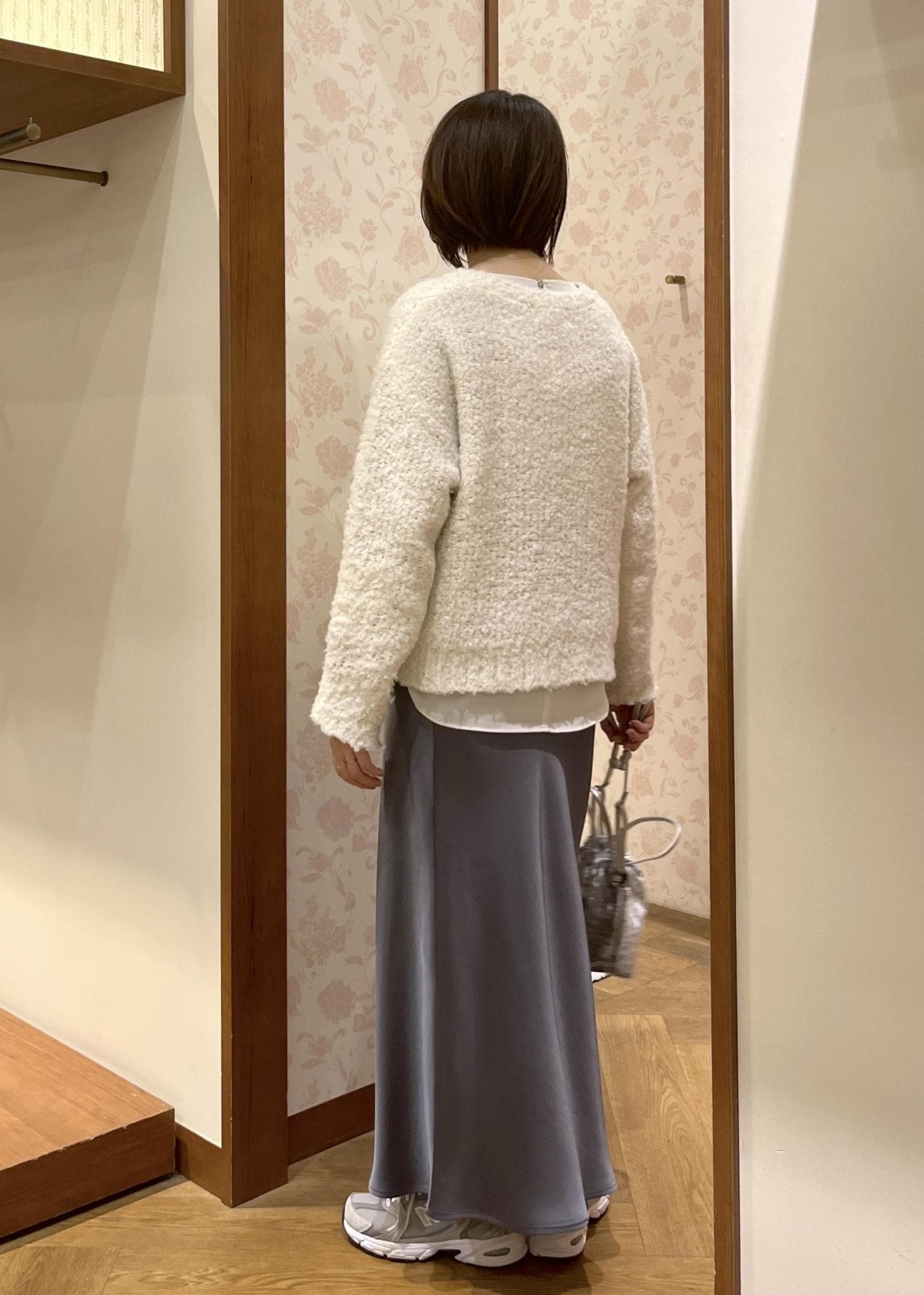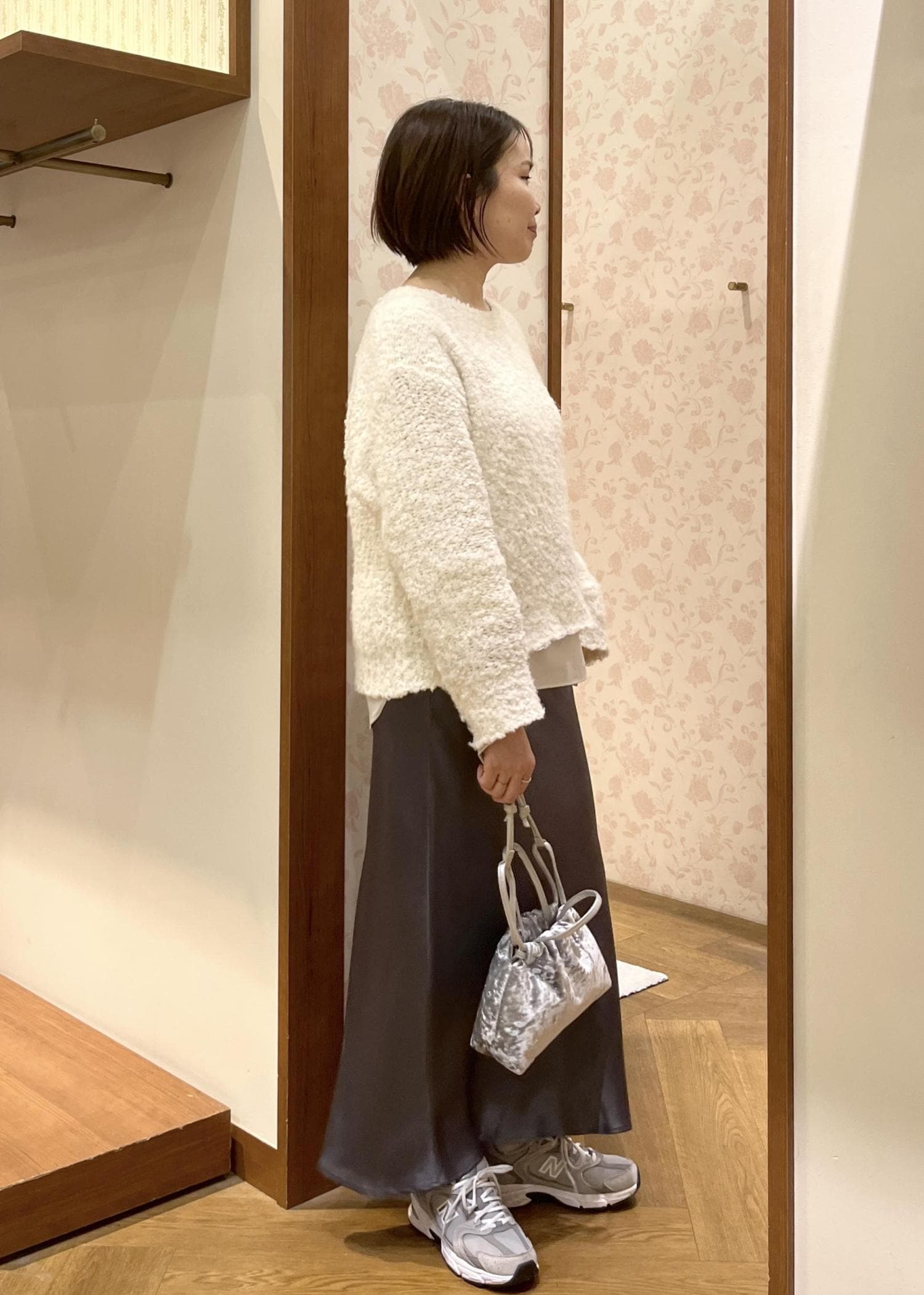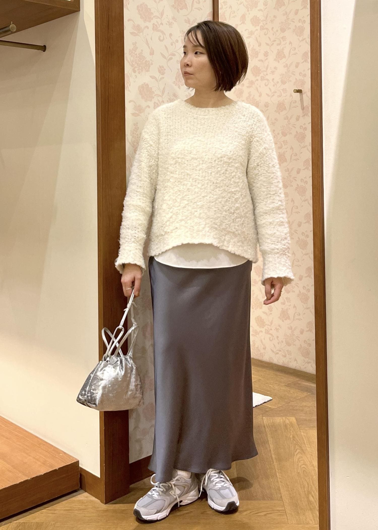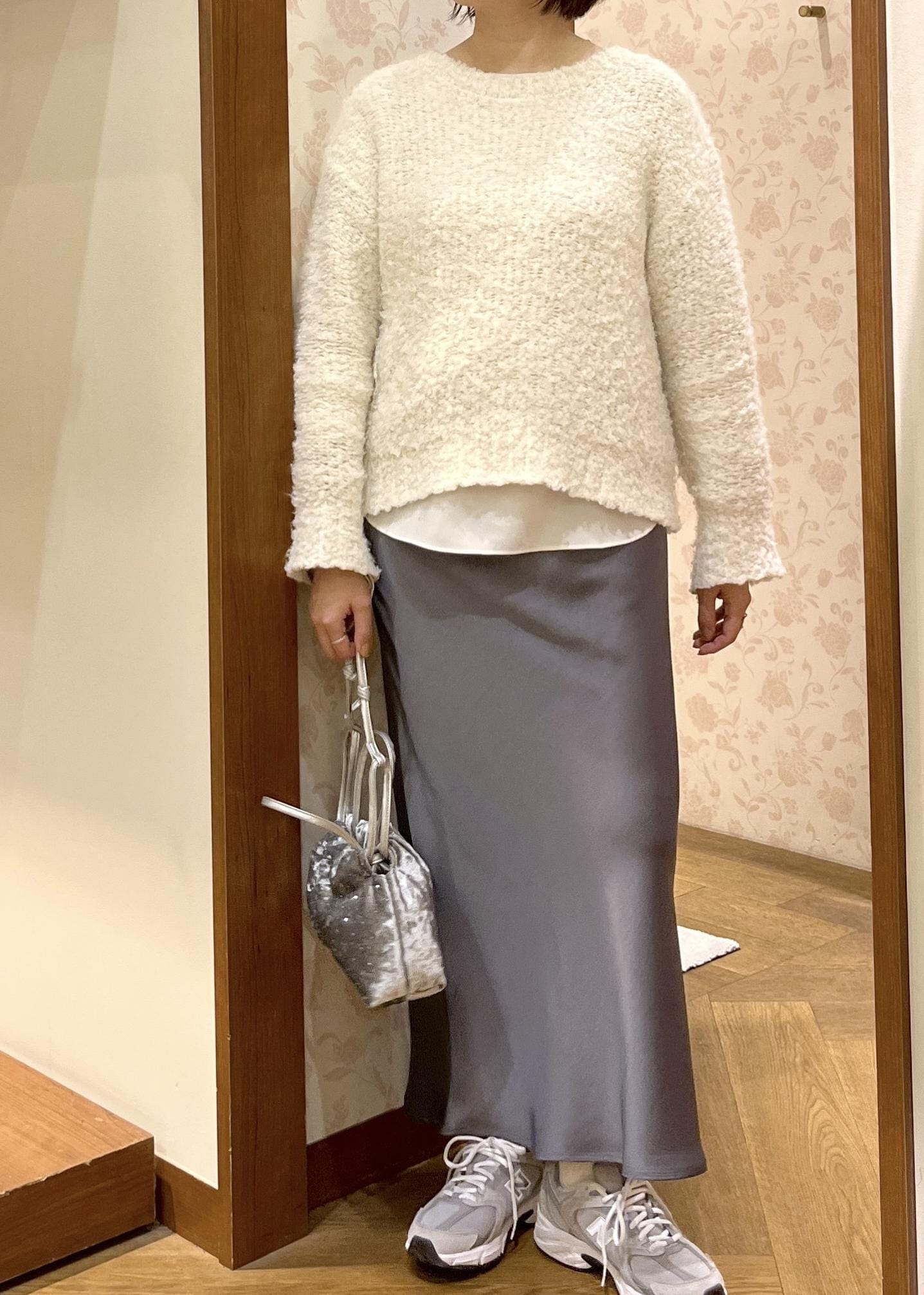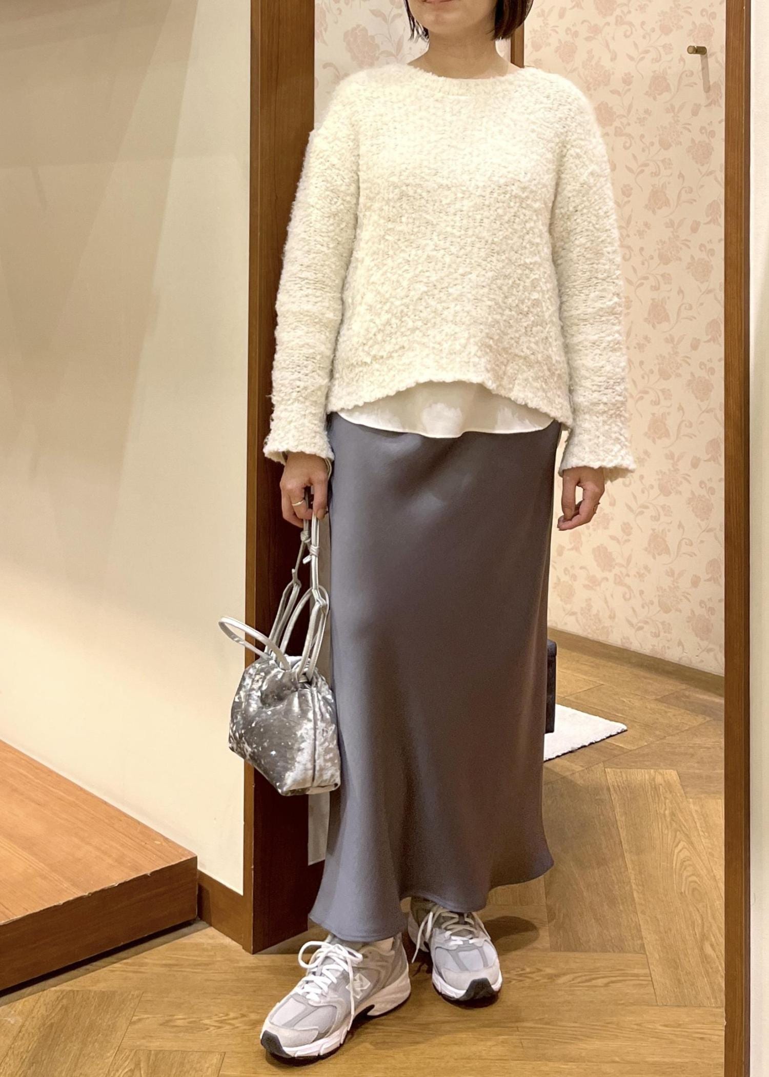 上品な光沢のサテンスカートを合わせて大人カジュアル☺︎