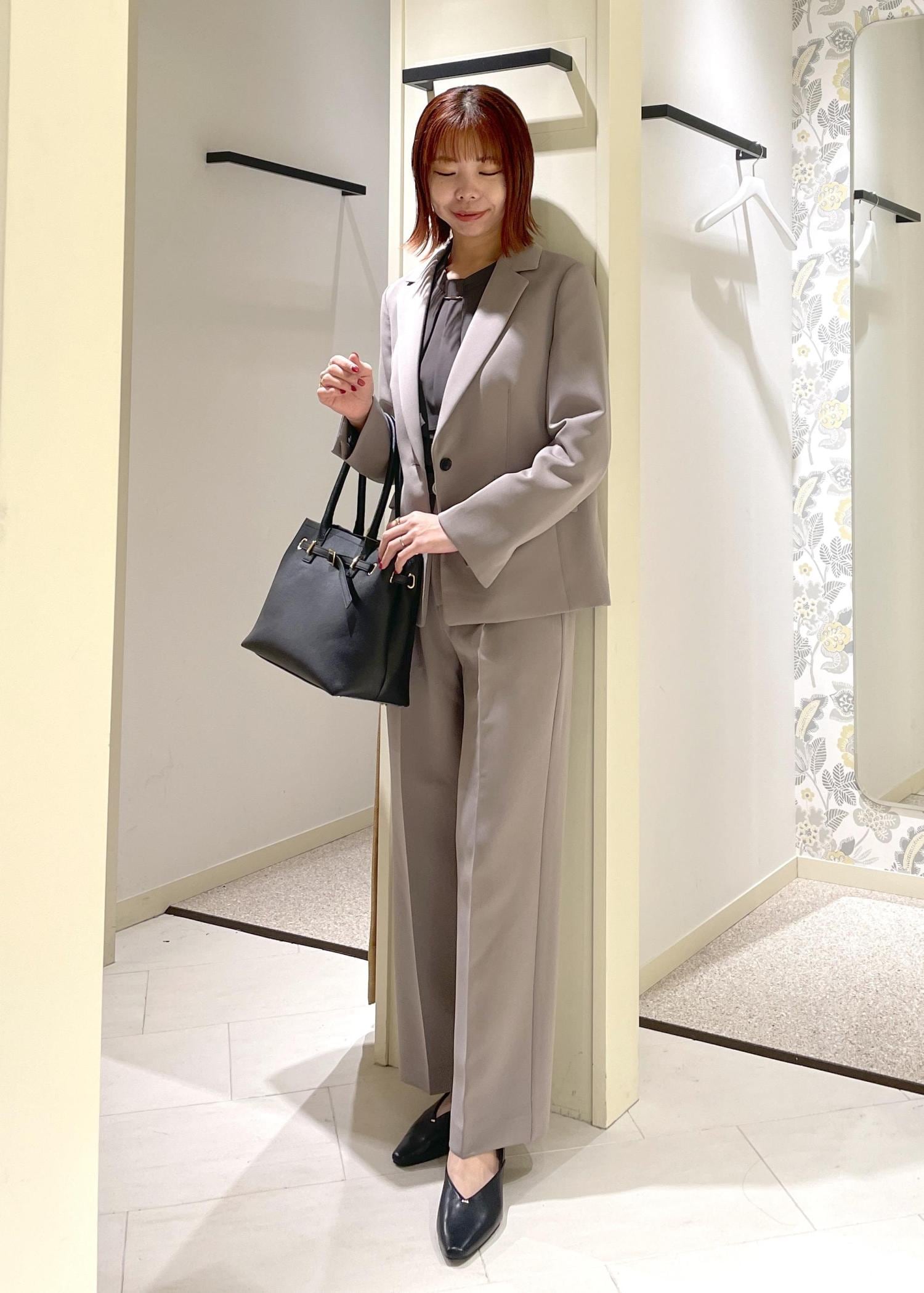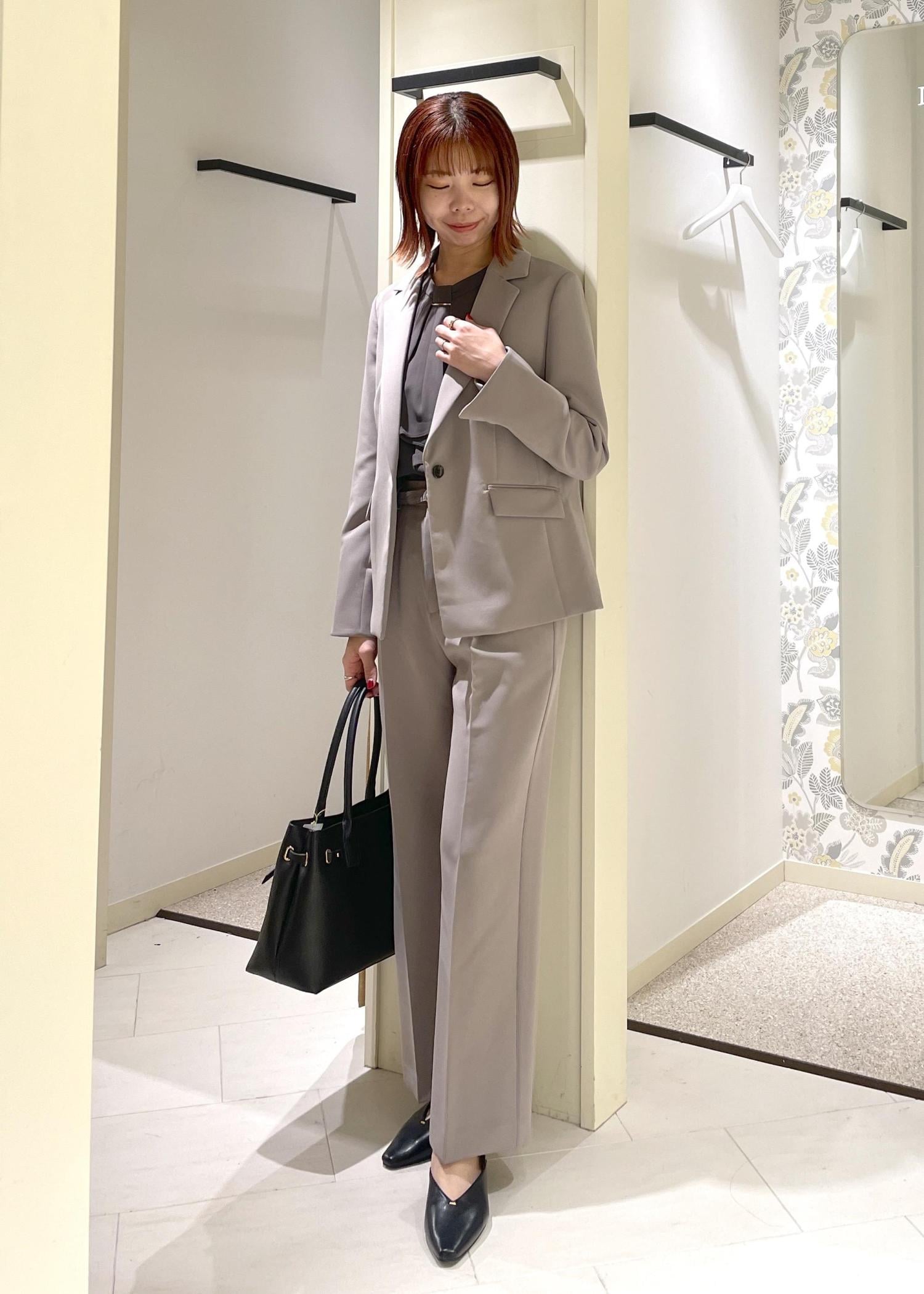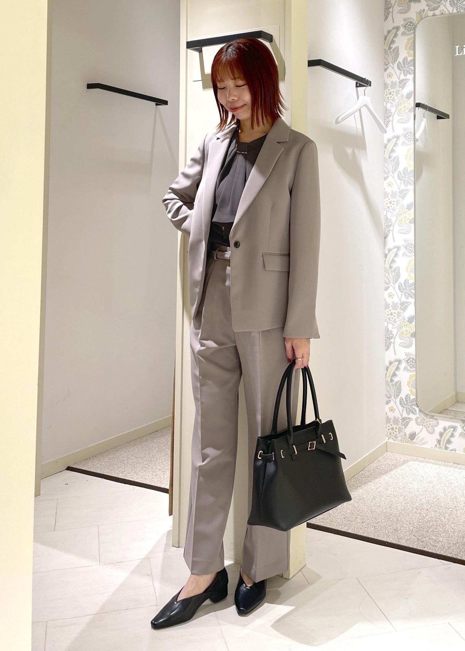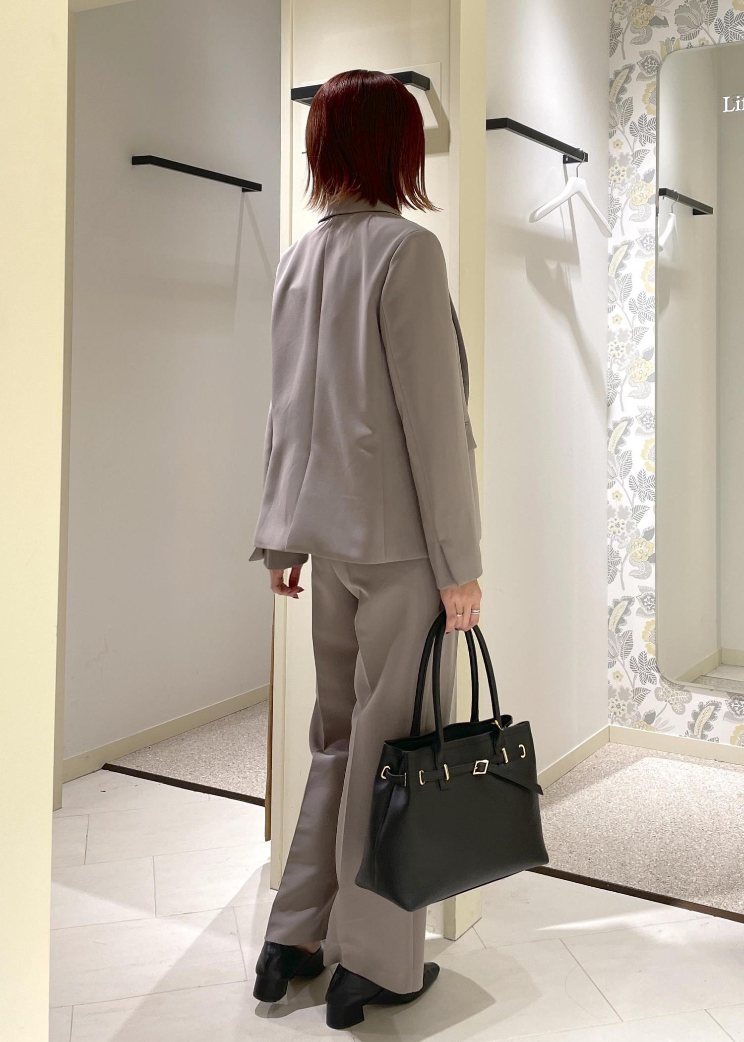 ベージュ系のカラーでこなれ感のあるセットアップスタイルは、小物ですっきりとメリハリのあるコーデにまとめてみました。