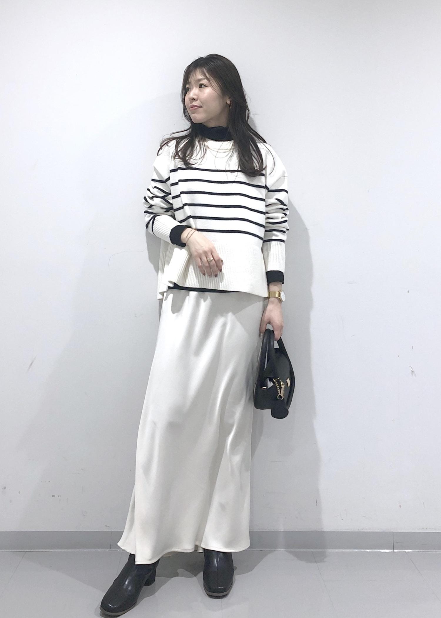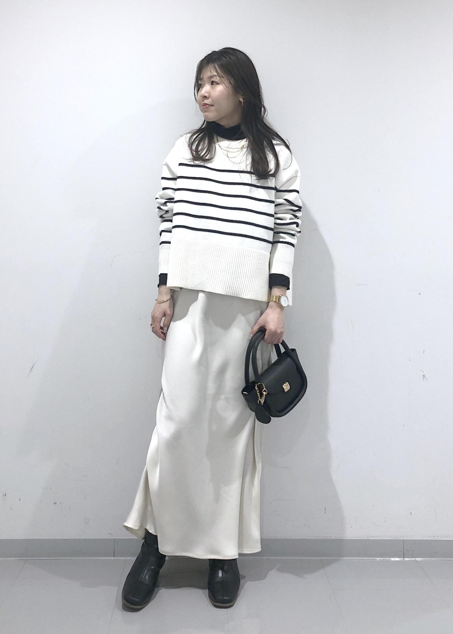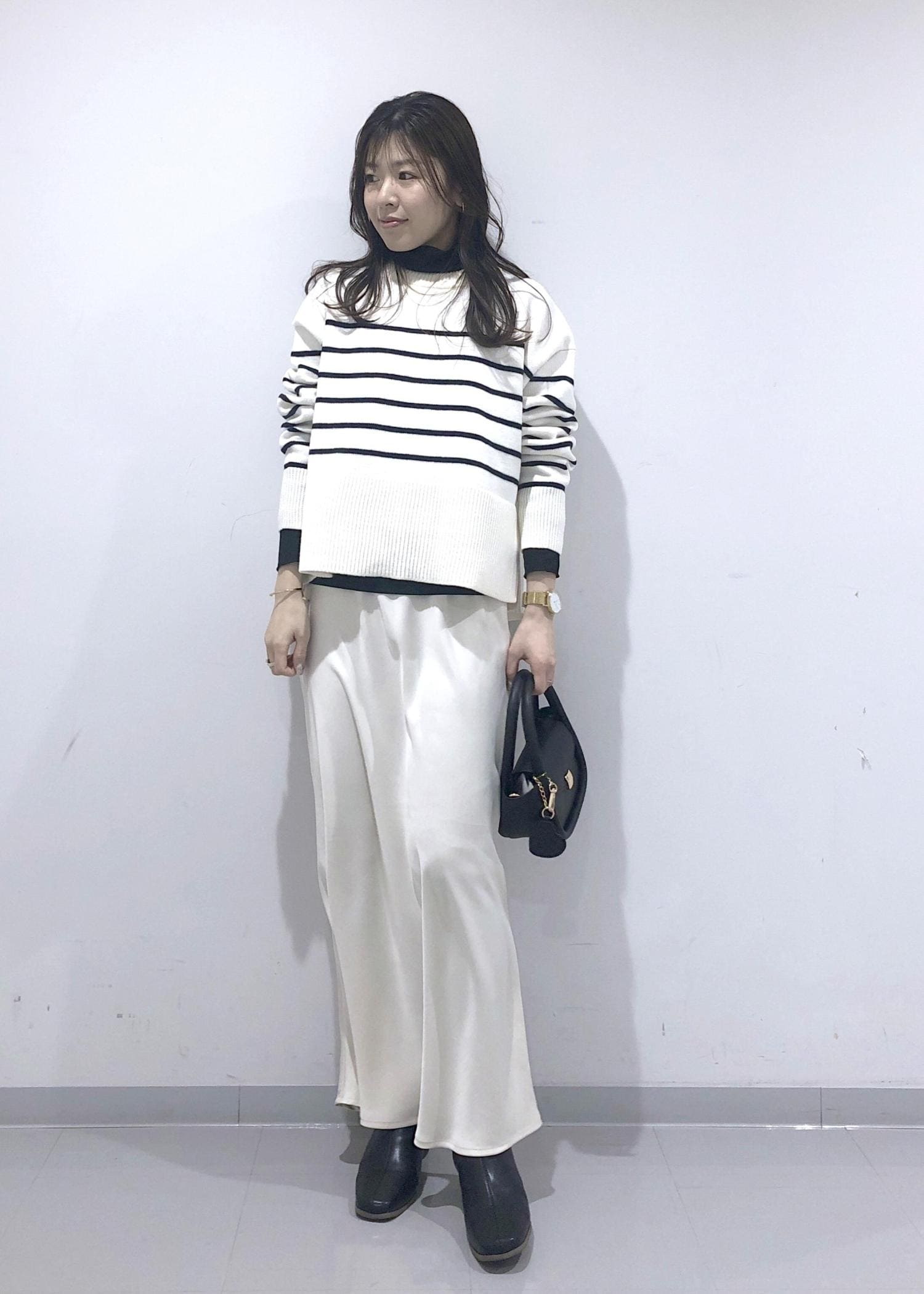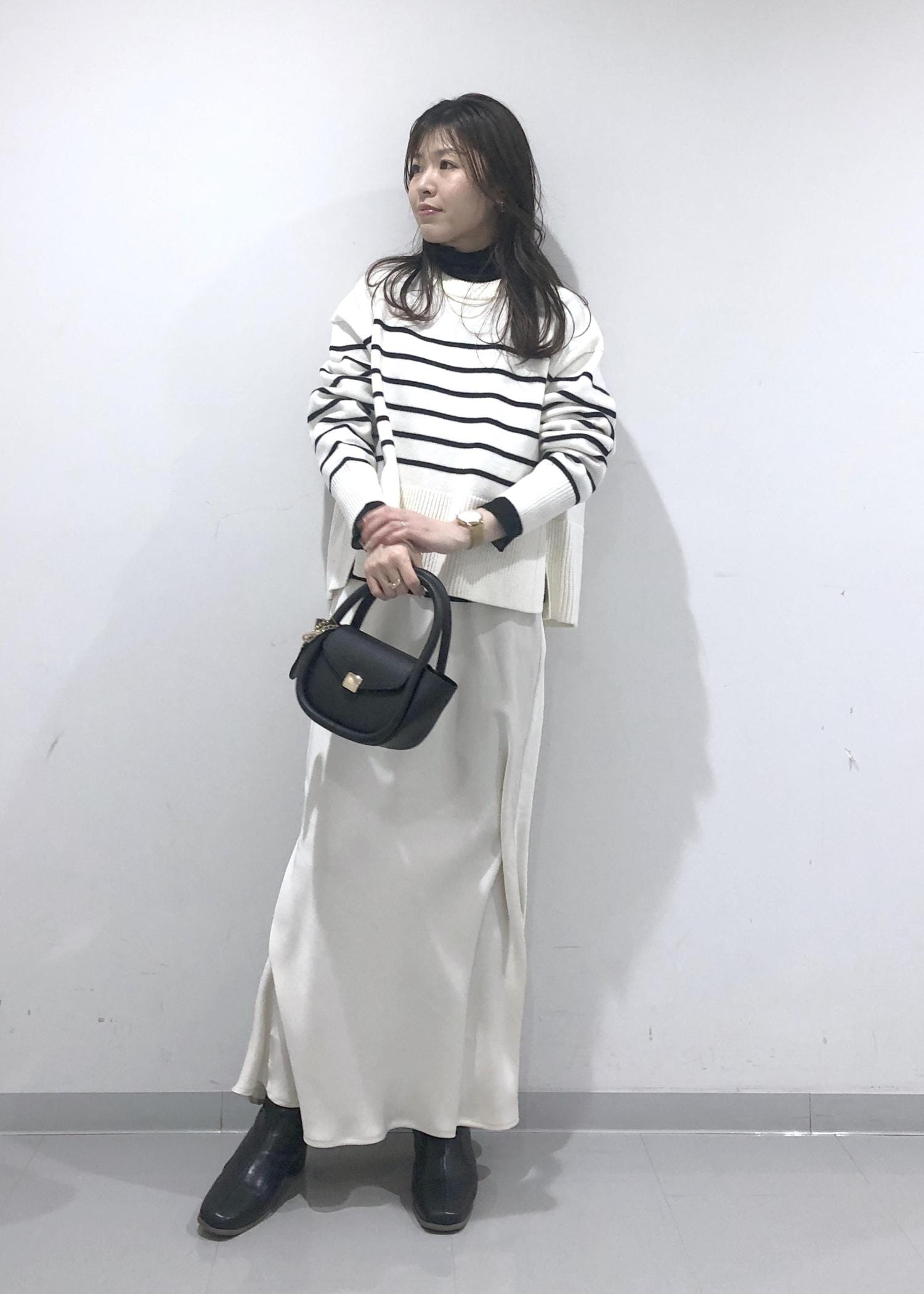ボーダーのサイドスリットニットに、ラメシアータートルネックのインナーをレイヤードし、ホワイトスカートを合わせたカジュアルモノトーンコーデにしました!