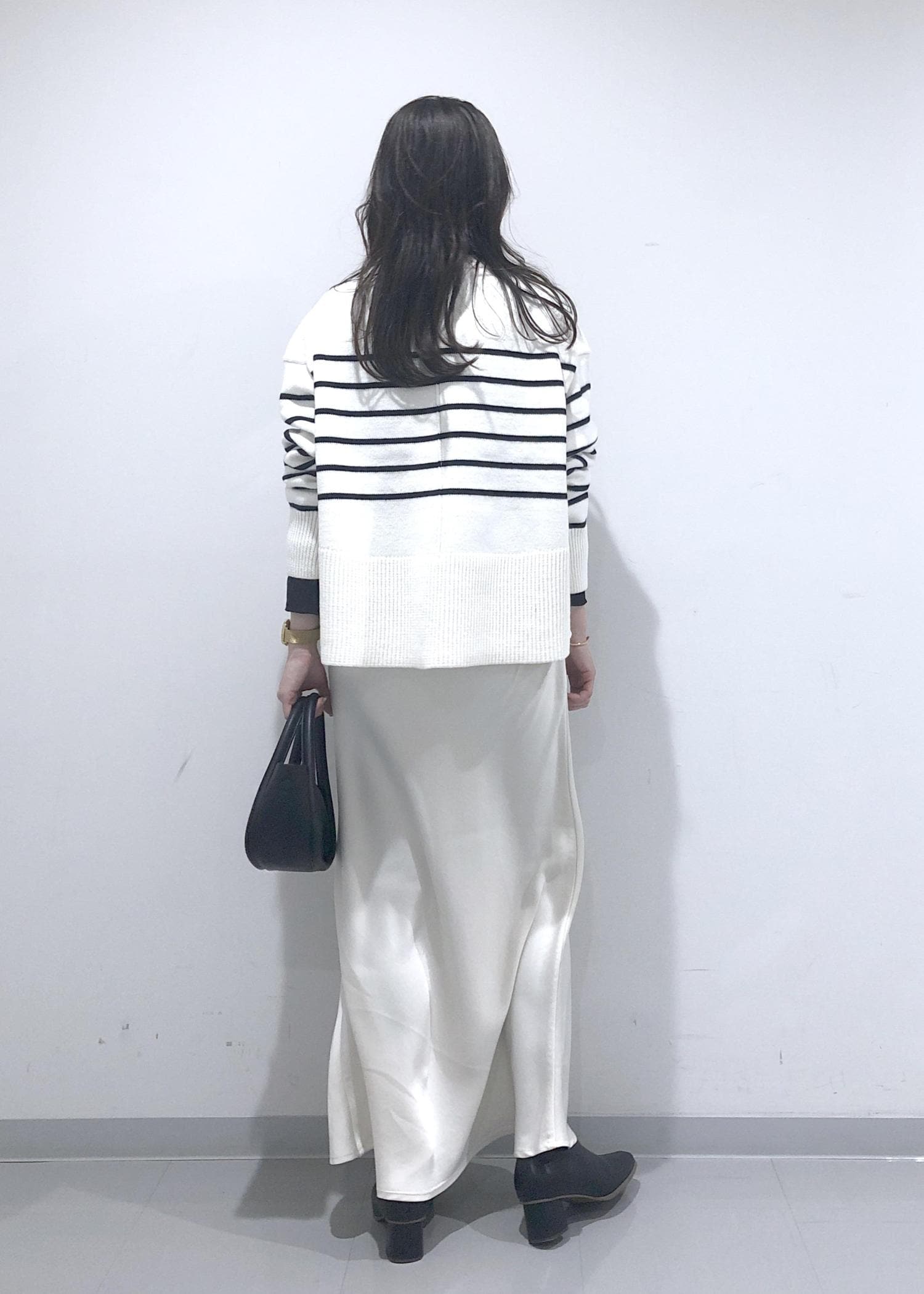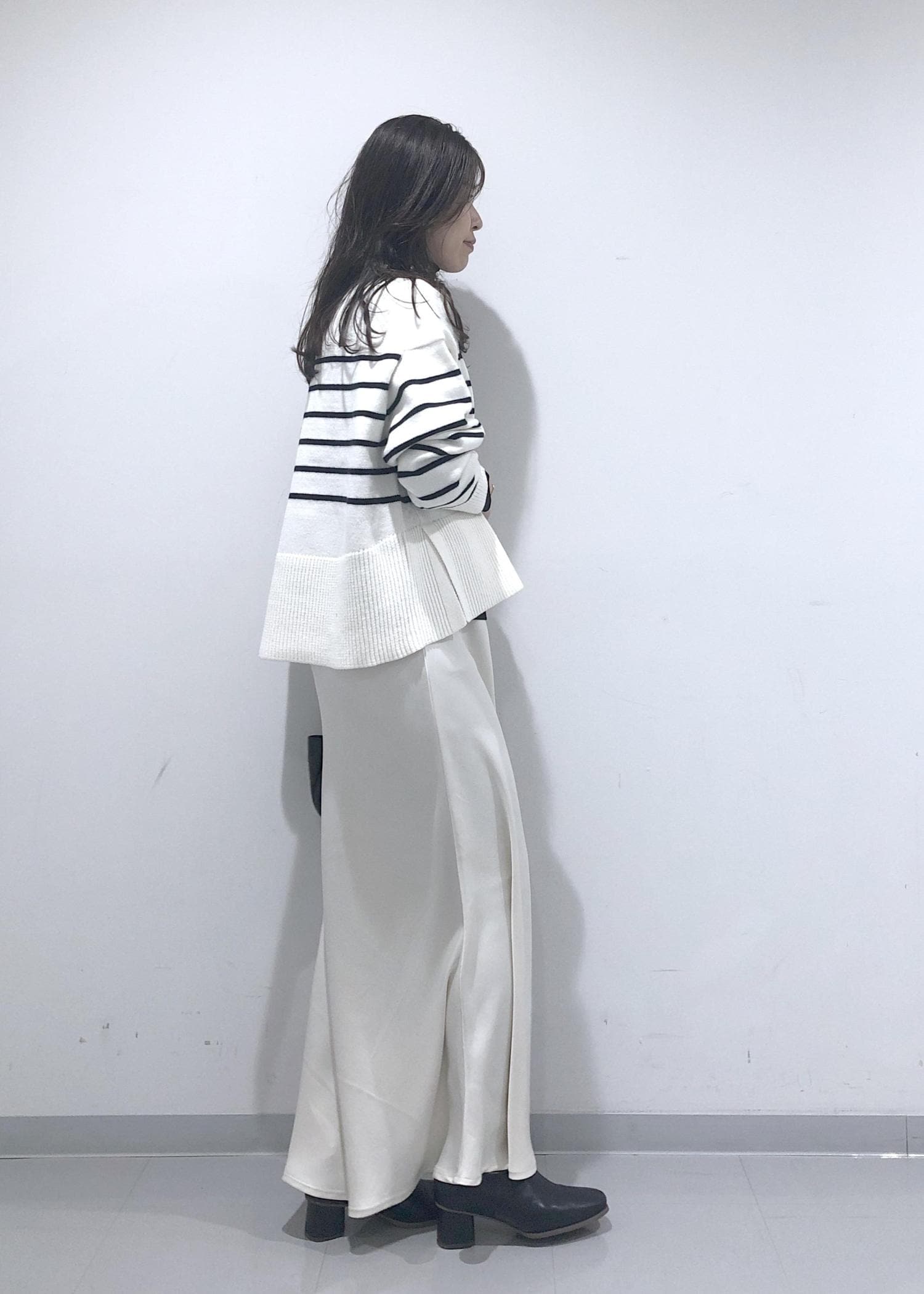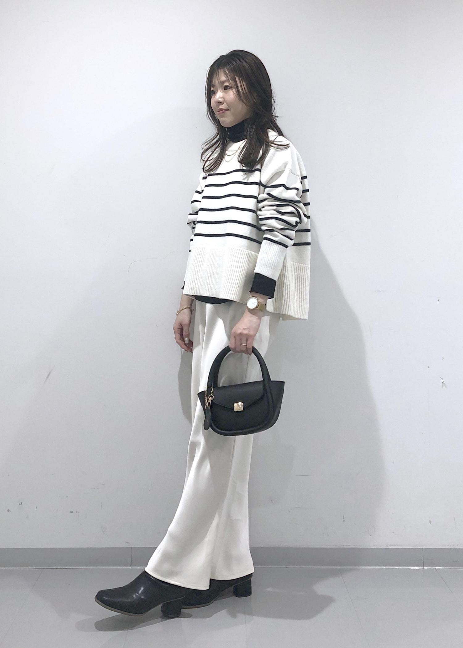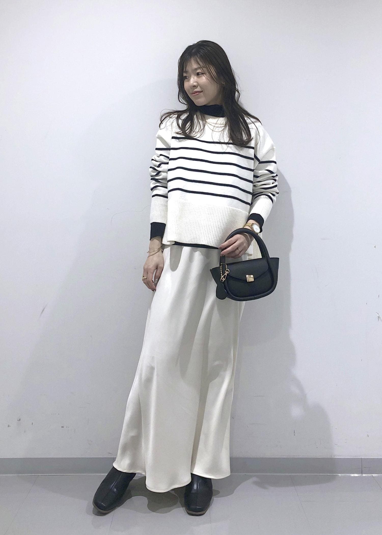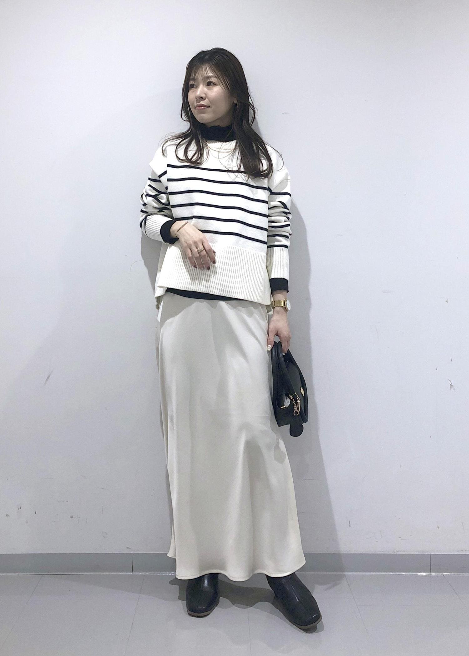 ボーダーのサイドスリットニットに、ラメシアータートルネックのインナーをレイヤードし、ホワイトスカートを合わせたカジュアルモノトーンコーデにしました!