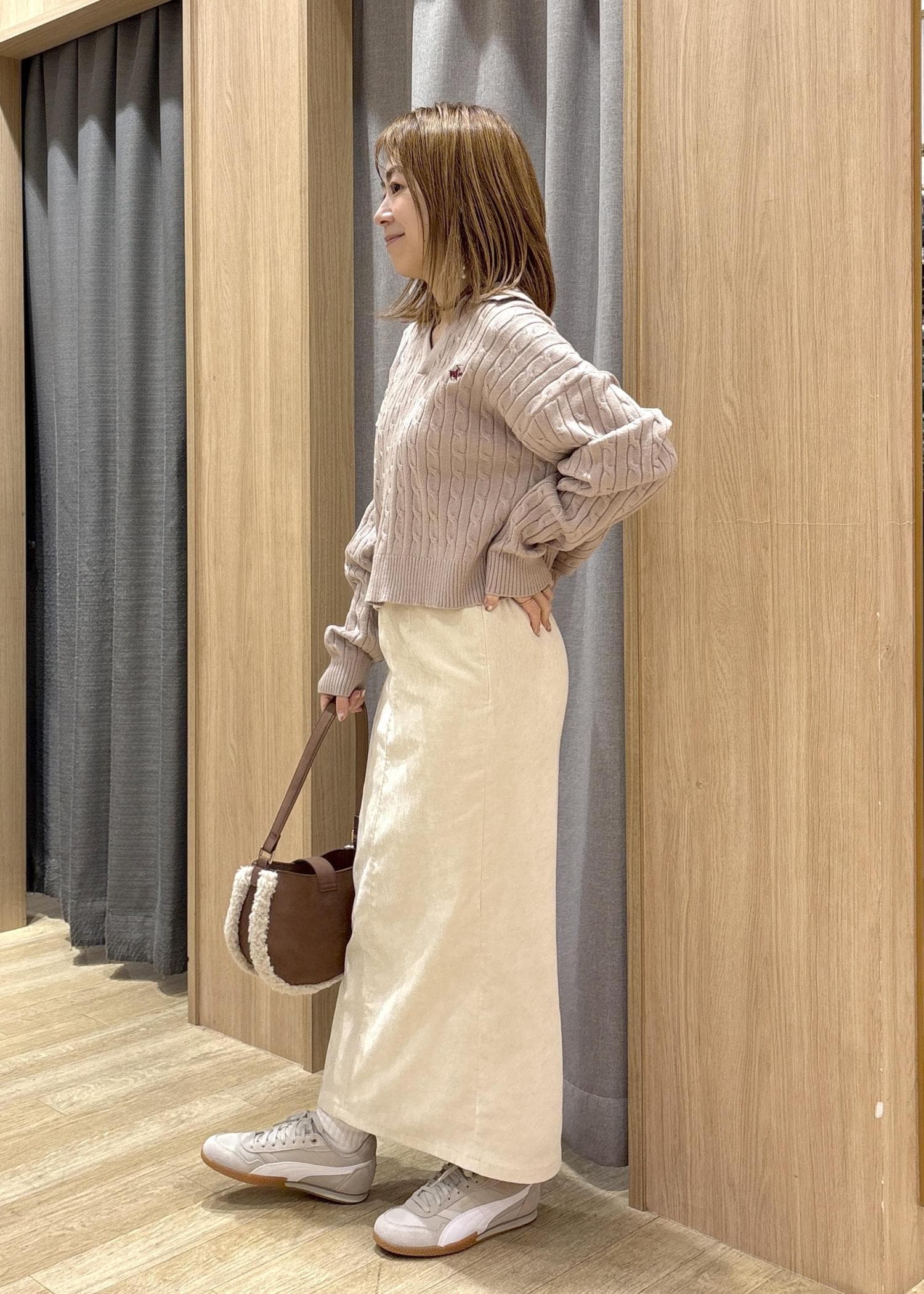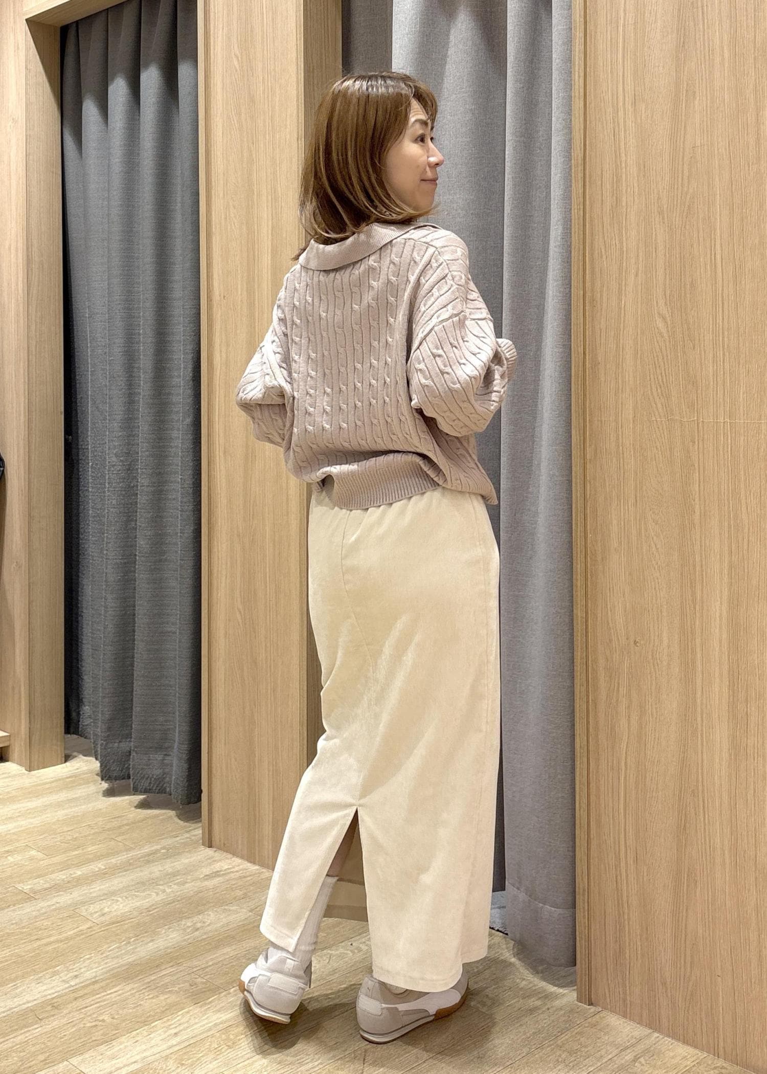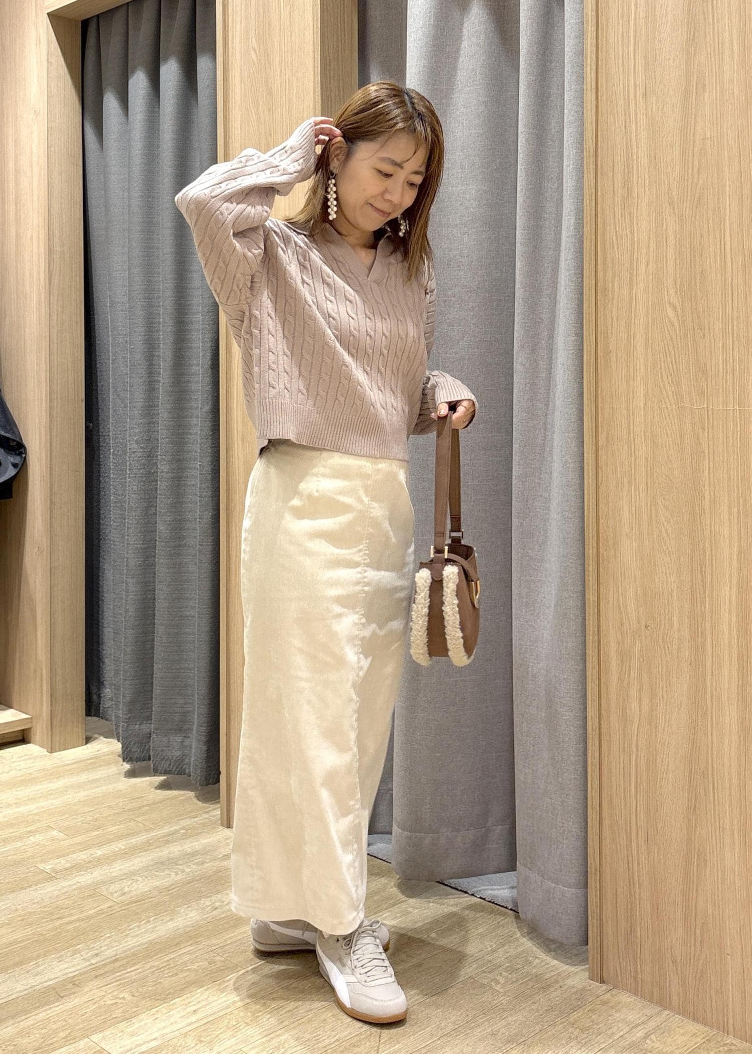 襟付きニットが人気を博している中、スキッパータイプのケーブル編みは抑えたいポイントがたっぷりで、一枚でサマに見えるので、敢えてシンプルなアイラインスカートとコーディネートしてみました。