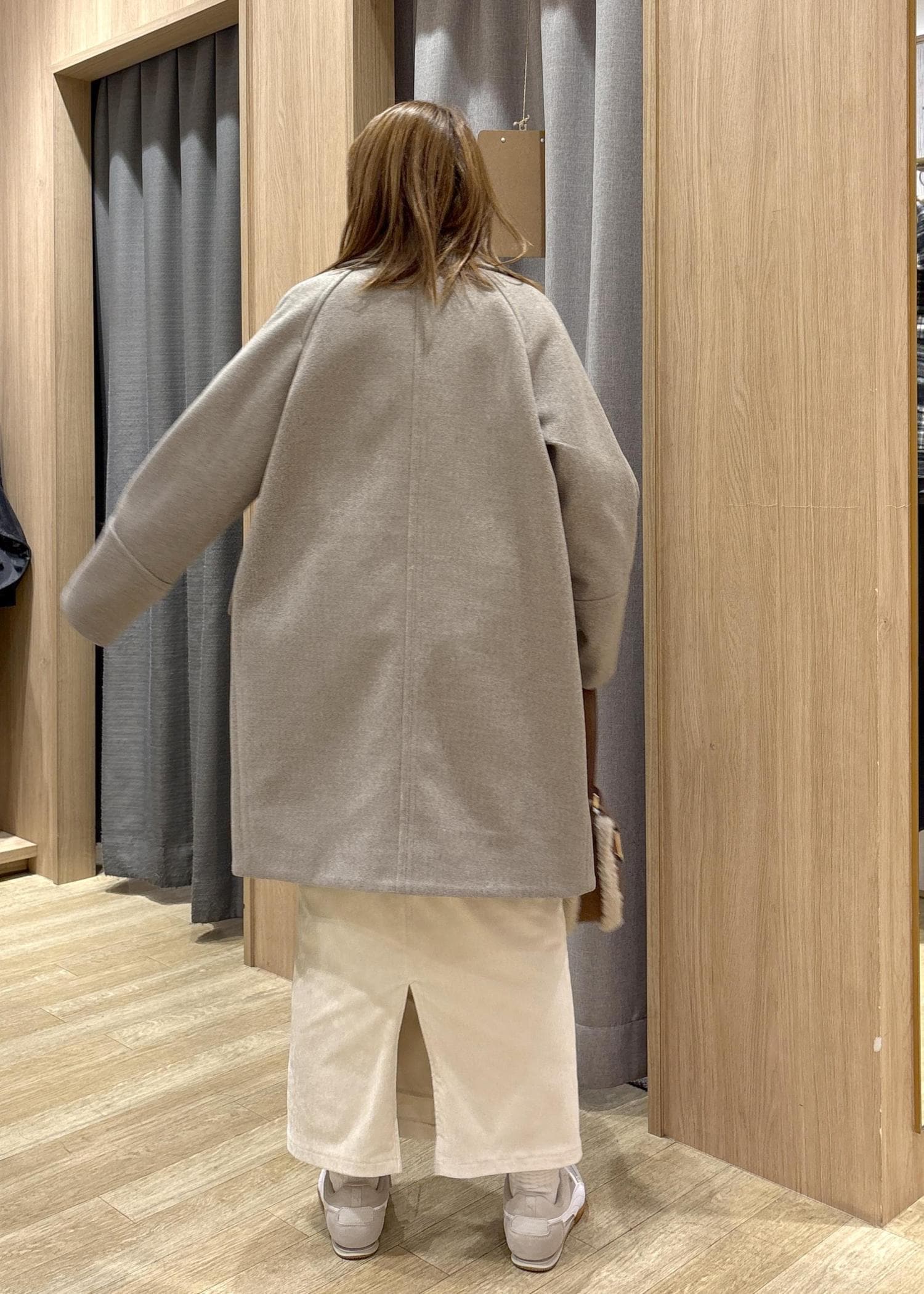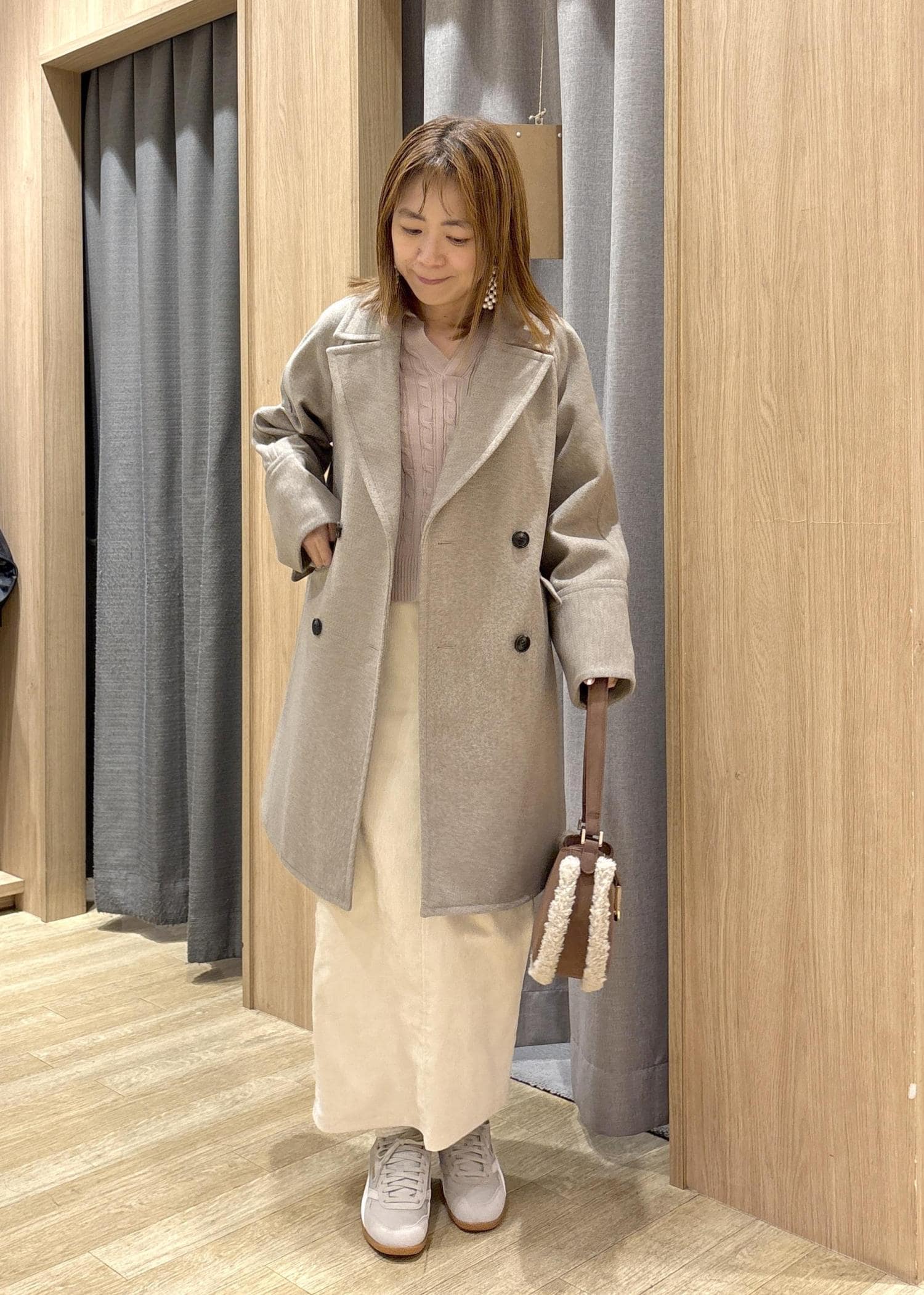 Sサイズでもウエストは入りますが、Iラインのシルエットと、着丈バランスがMの方が身体に合っていたので、Mを着用しています。 -