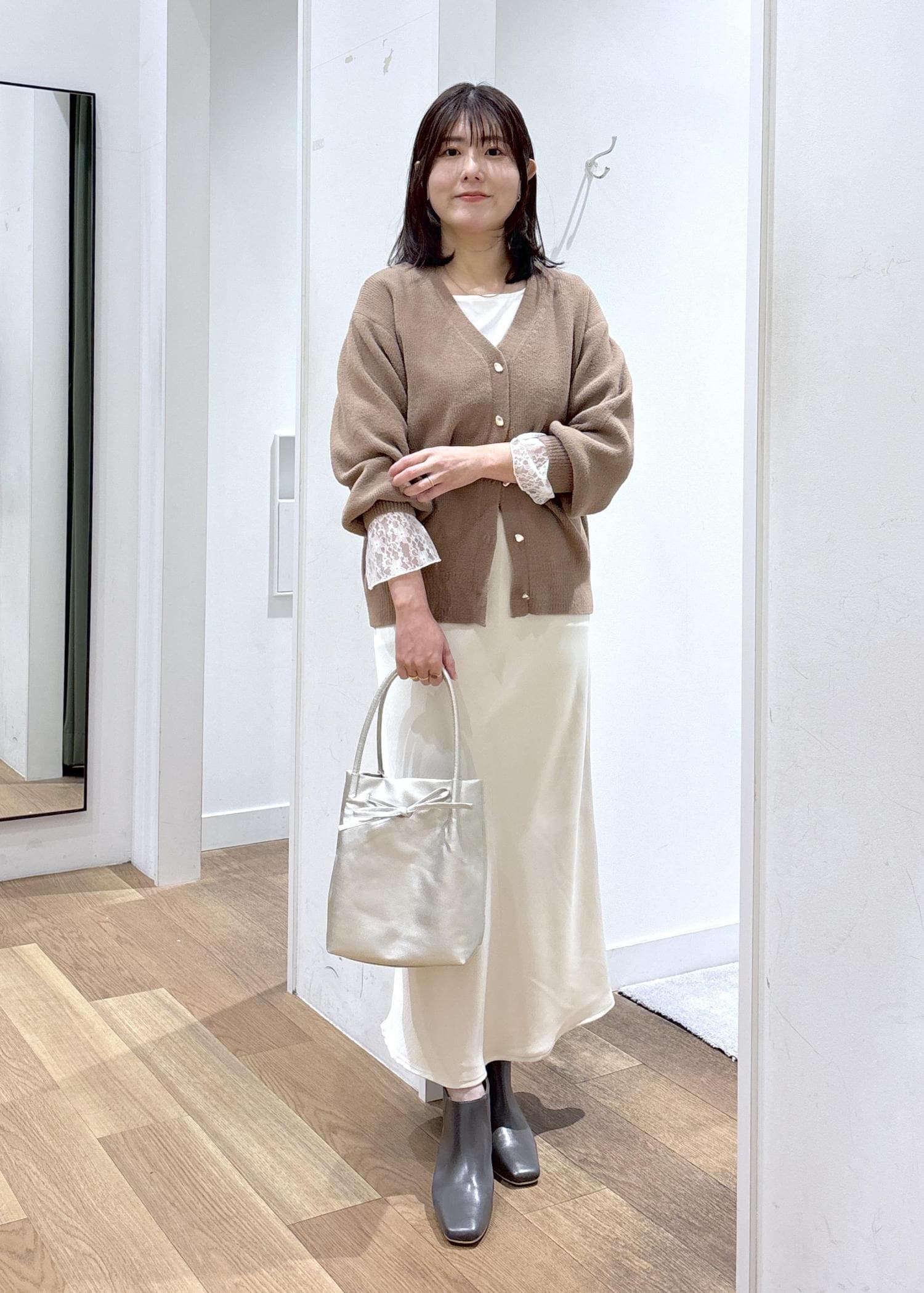 NEW!ROPÉ PICNIC細見えバイアスサテンスカート/イージーケアオフホワイト / F¥6,490レビュータイトすぎないアイラインとウエストゴムで、履き心地が楽で足さばきも◎です。腰が張っている為腰回りはフィット感がありました。162㎝で足首くらいの長さでした。