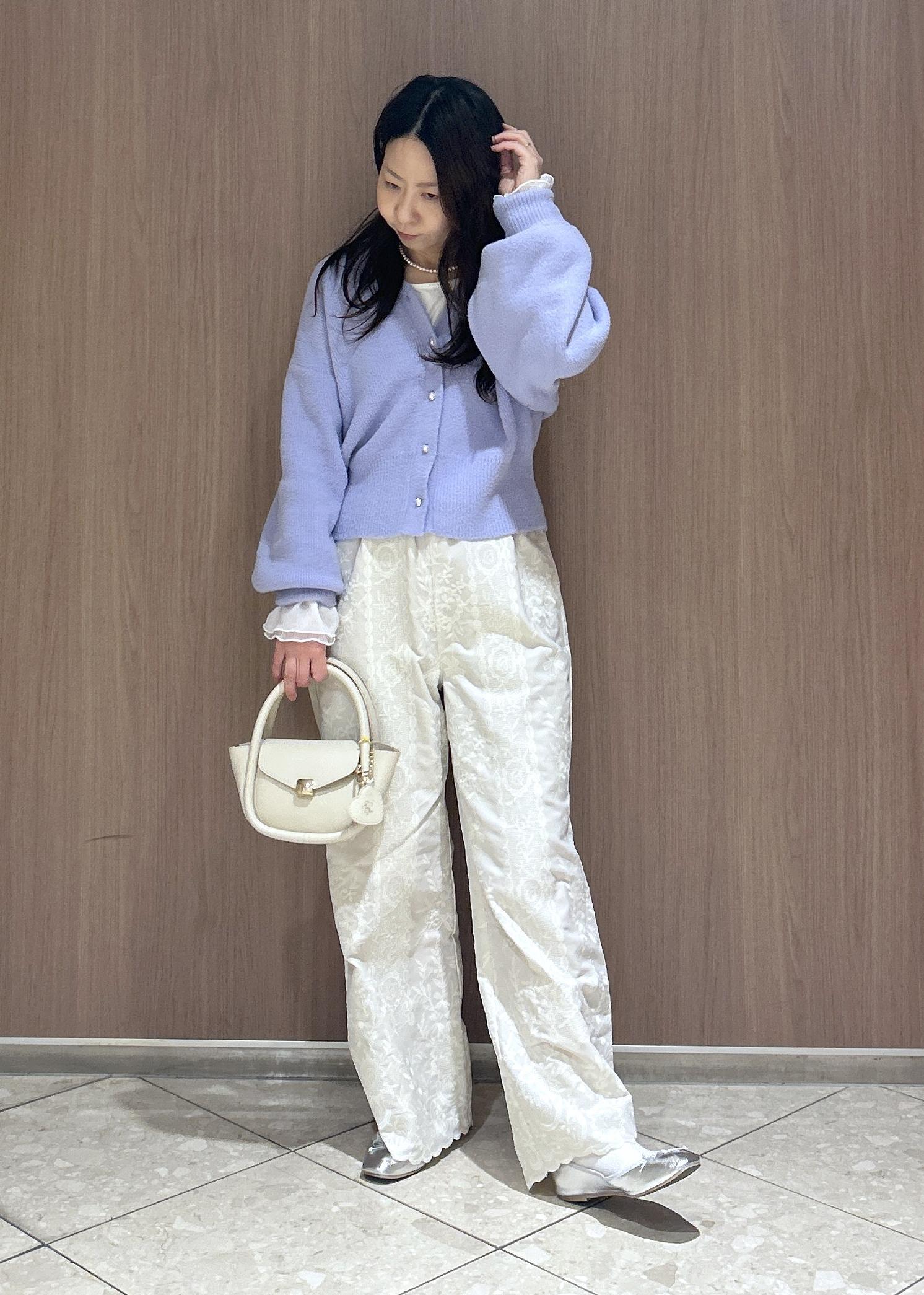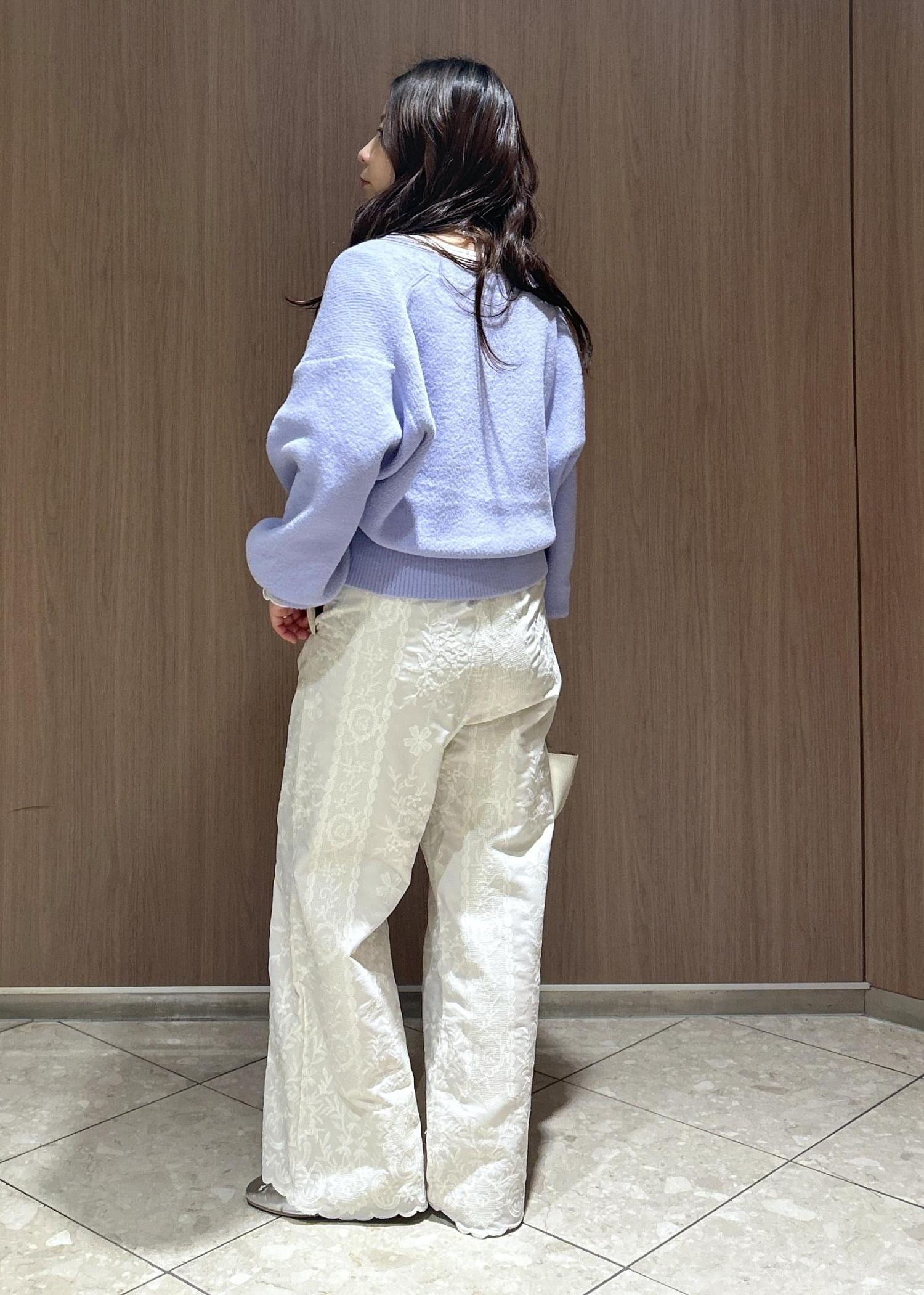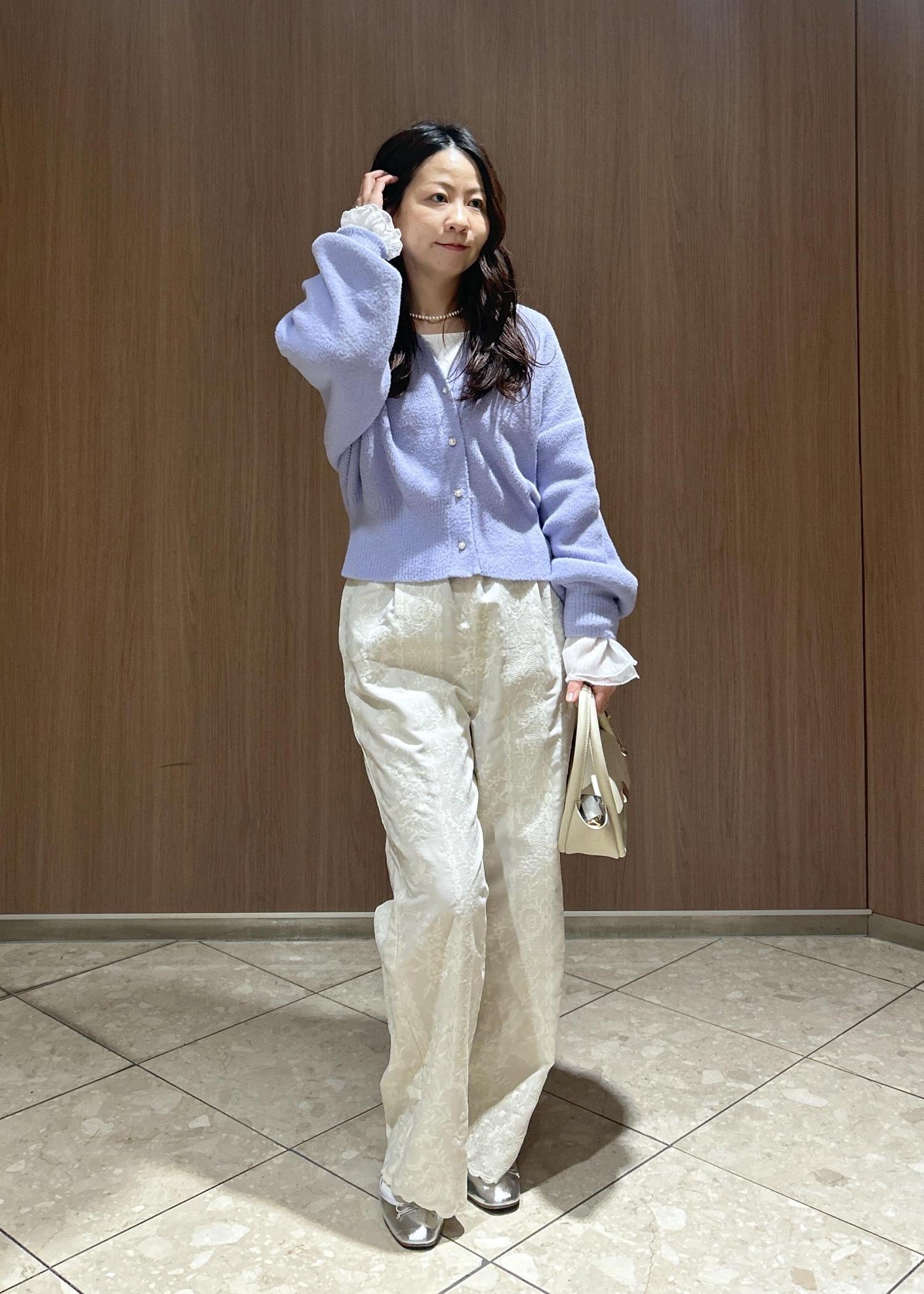 少し先の春の装いをしてみました!ラベンダーに白はキュートな合わせです。袖にシアーのプリーツを入れてよりトレンド性を出したコーディネートにしました。