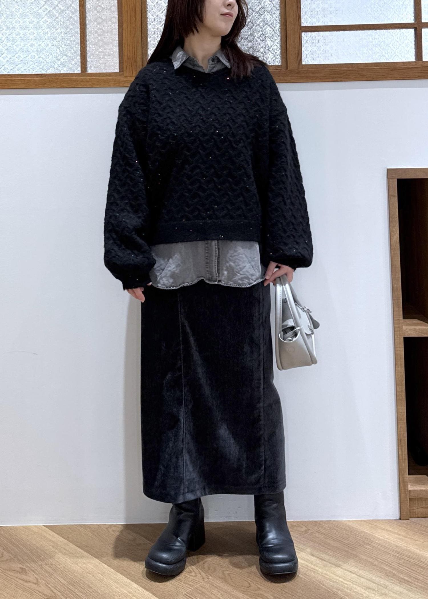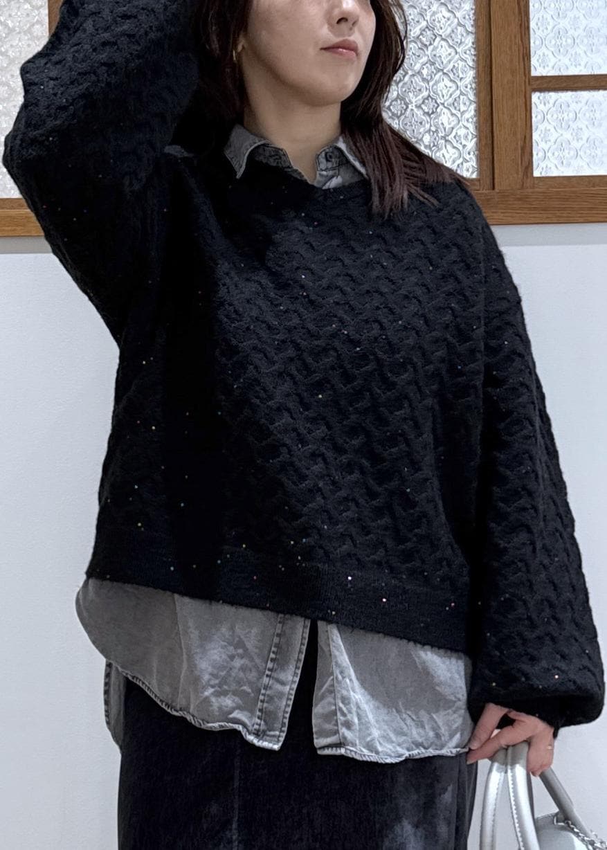 ROPÉ PICNICミニフラワースパンコールニットブラック / F¥5,995レビューヘンリボーンのようなデザインの編み地と小さな花のスパンコールがキラッと映えるニットです。