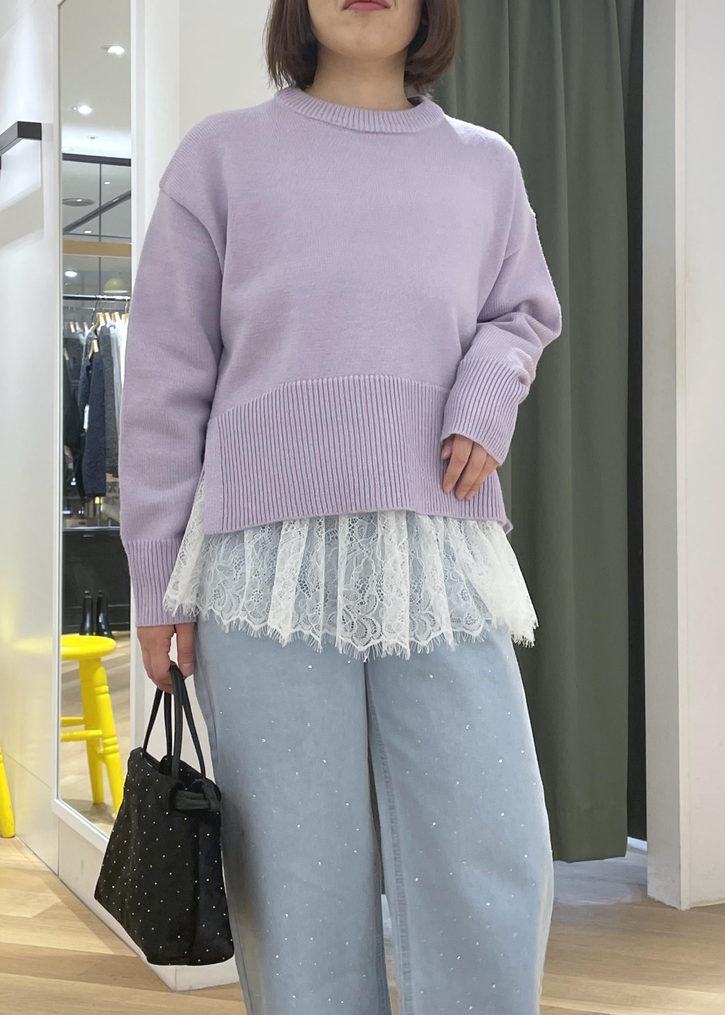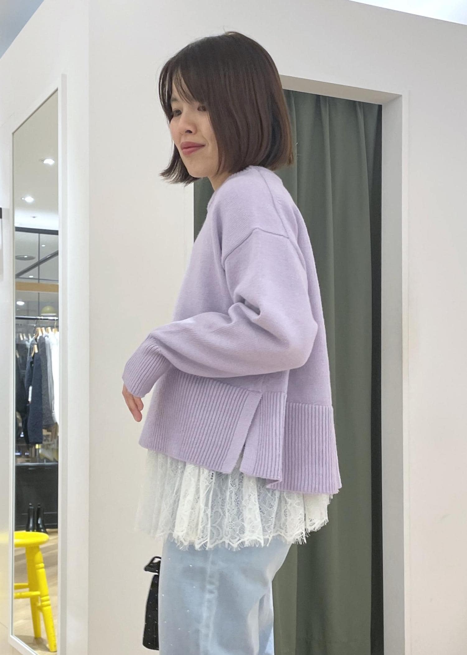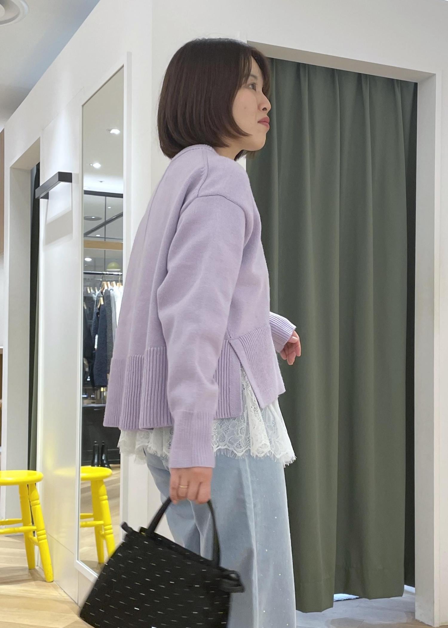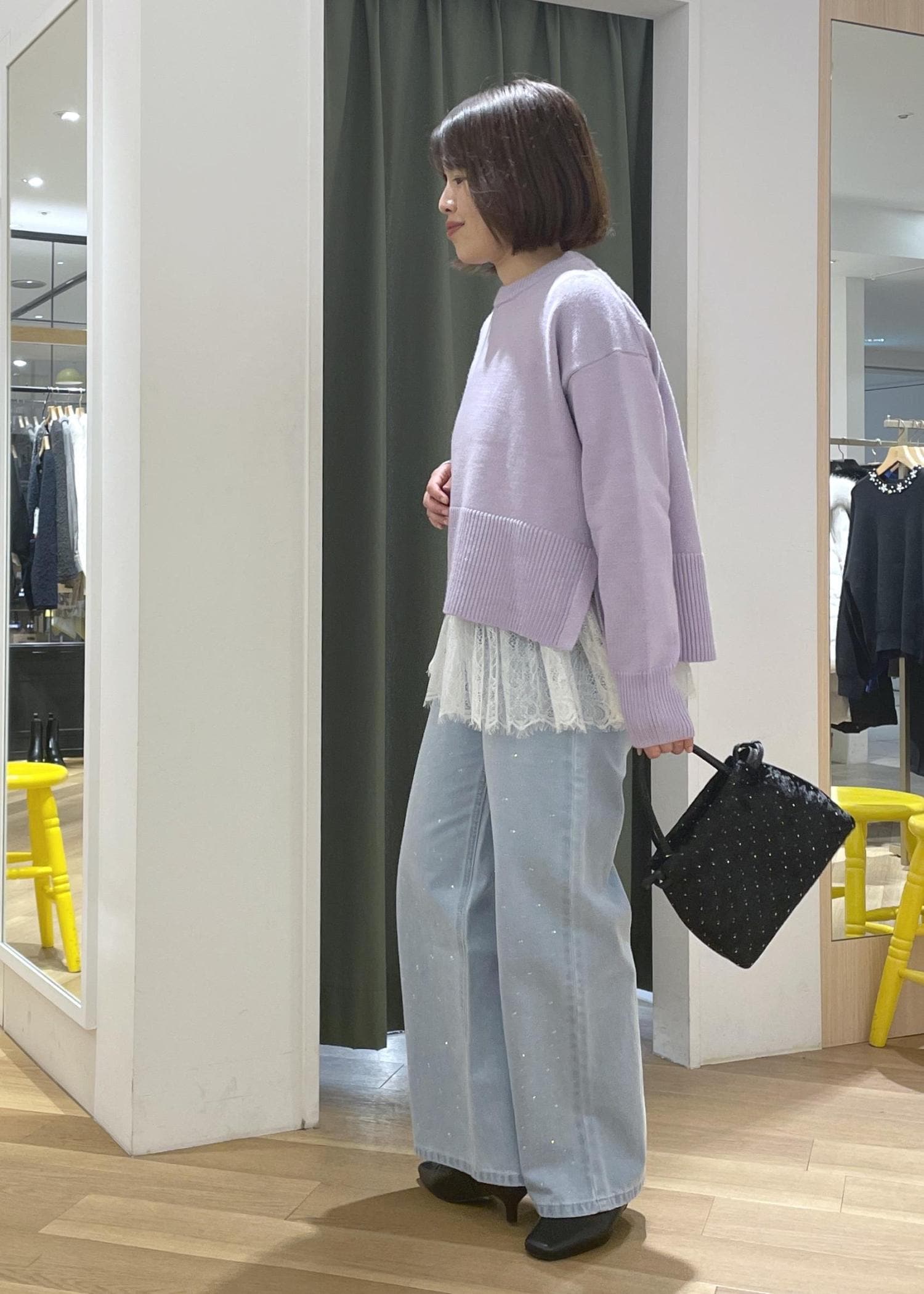 柔らかなパープルが春にぴったりのクルーネックのニットに、サックスブルーのデニムを合わせた、爽やかなニットコーデです!