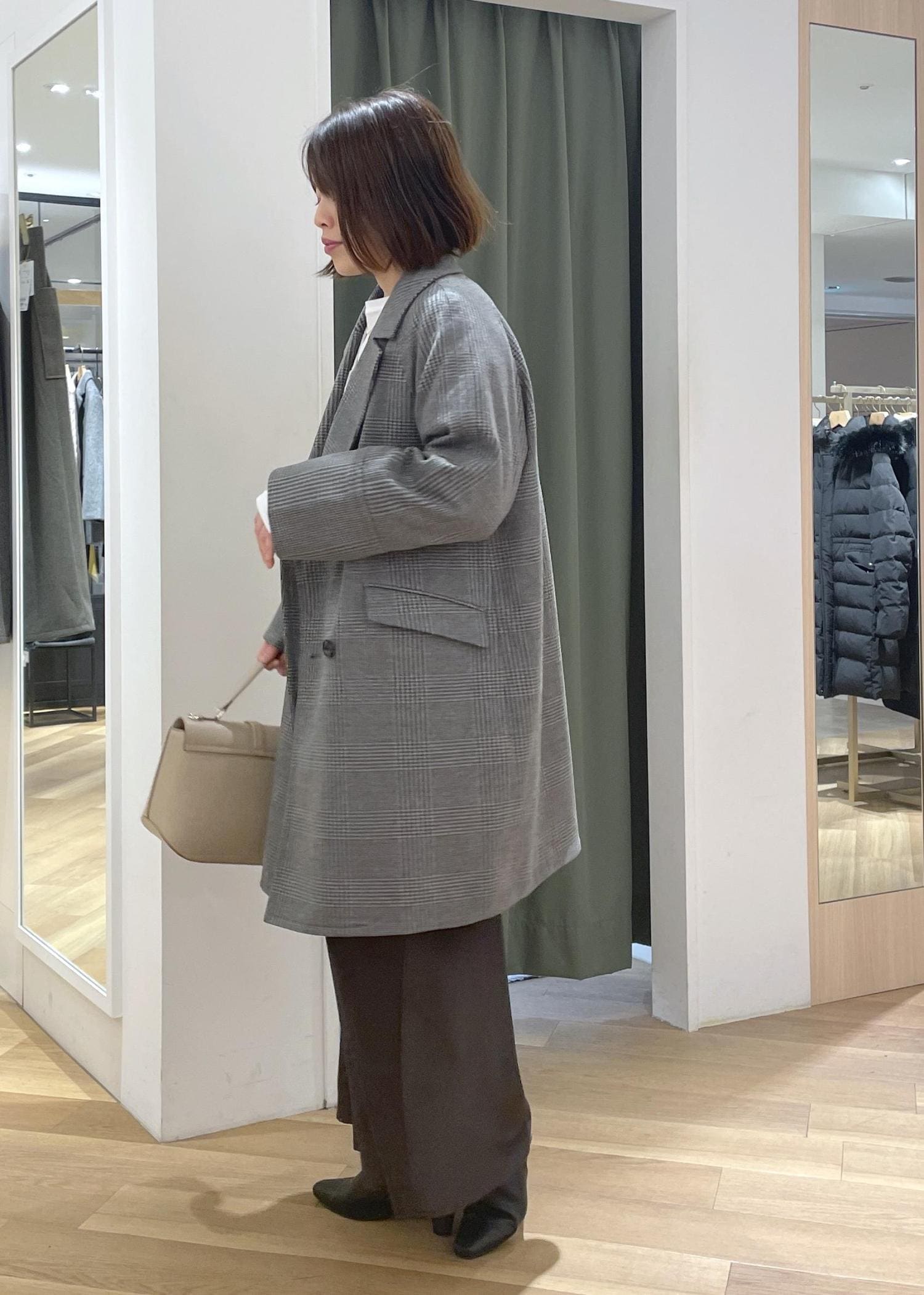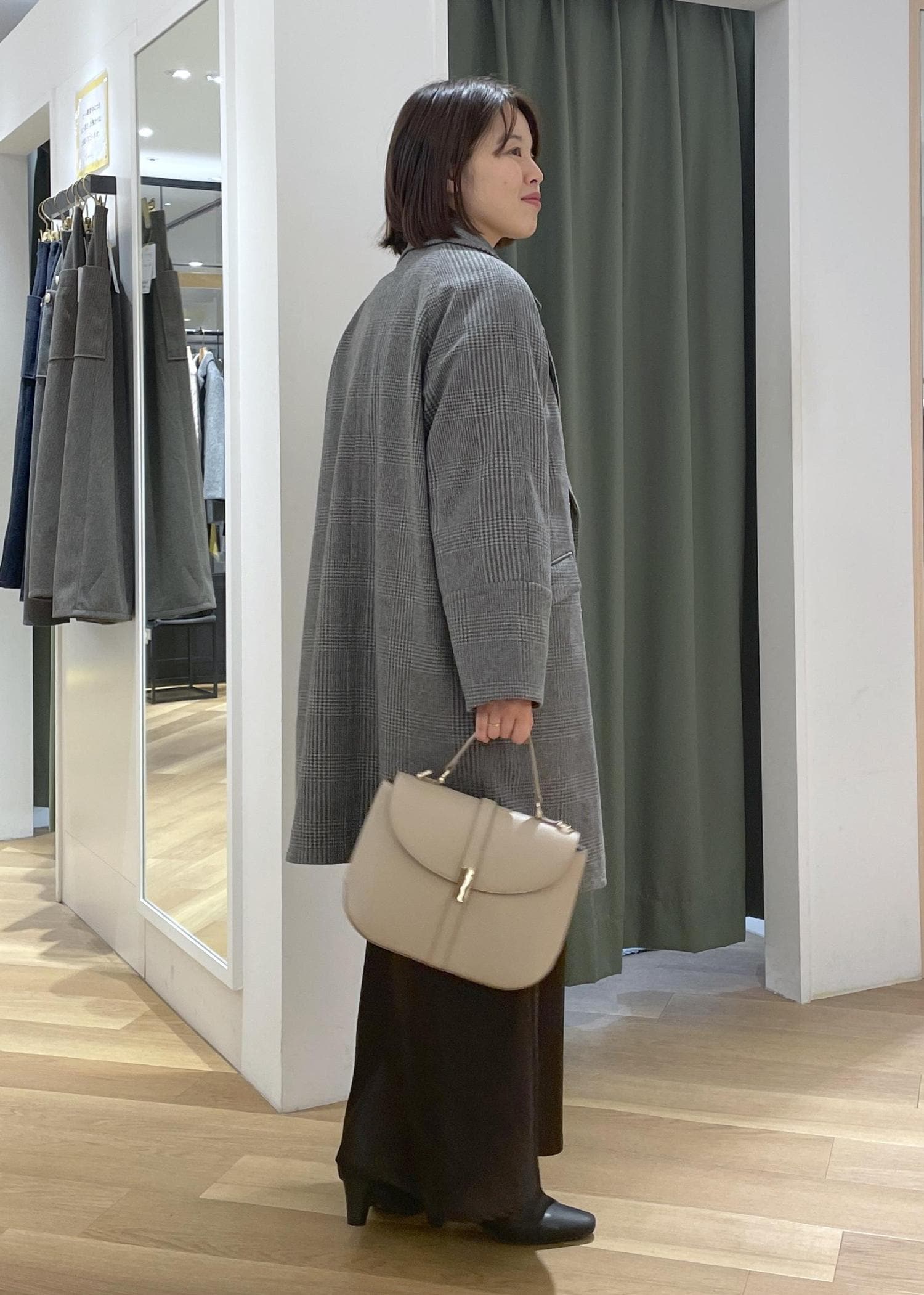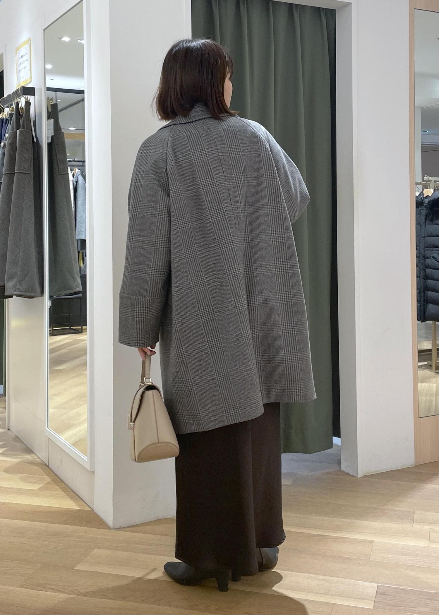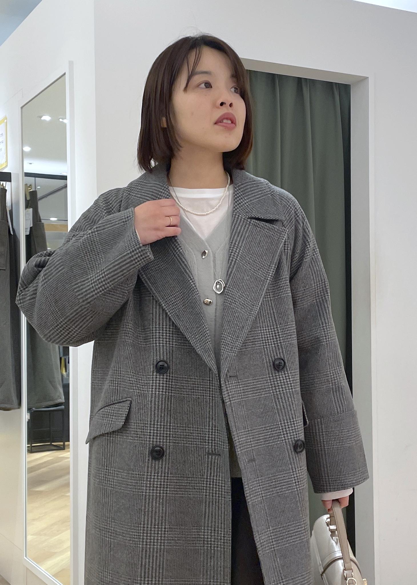 クラシカルなチェック柄のロングコートに落ち感のあるロングスカートを合わせた、大人カジュアルコーデです!