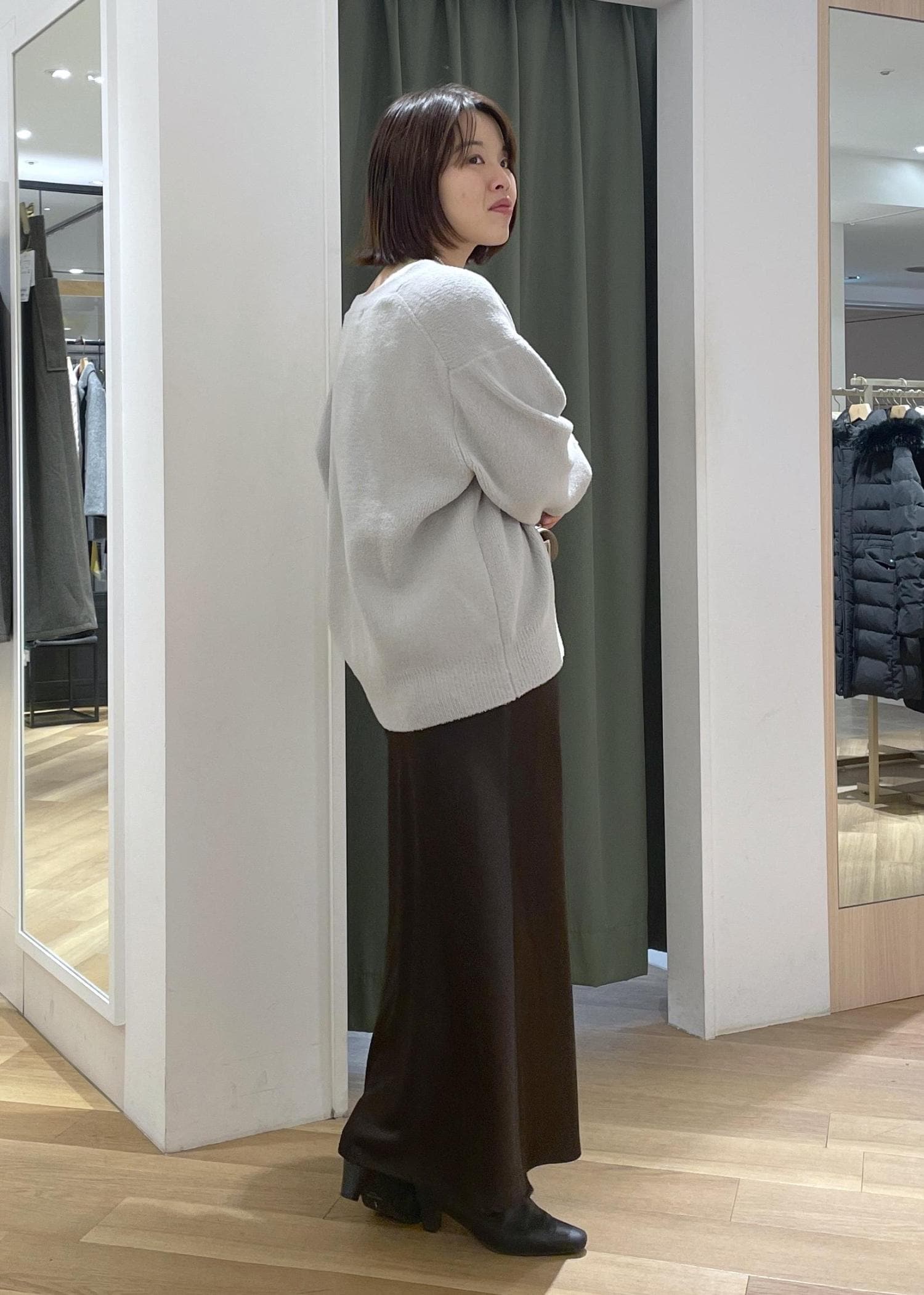 すっきりしたラインのスカートなので、オーバーサイズのコートと合わせてもバランス良く合わせて頂けます◎