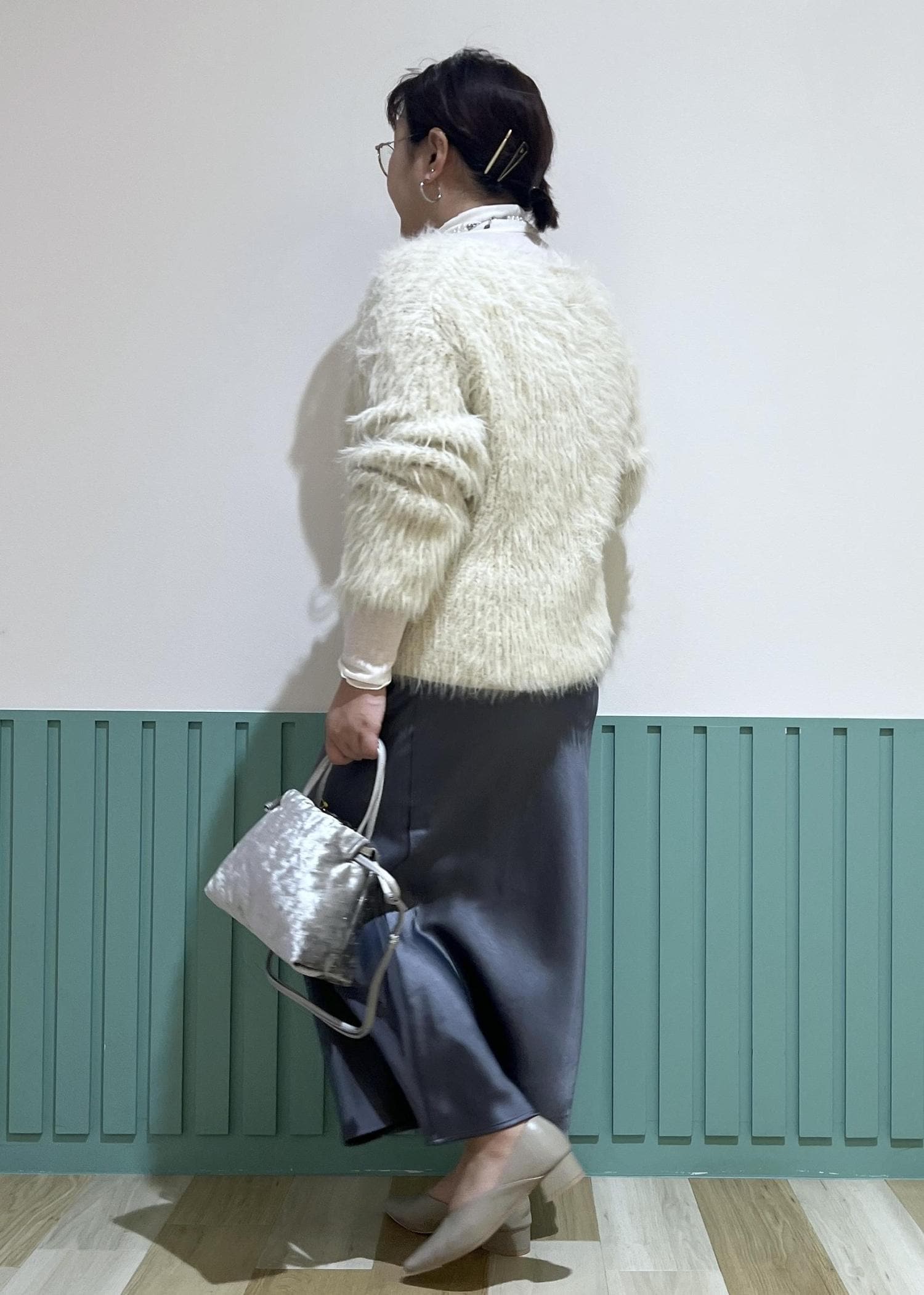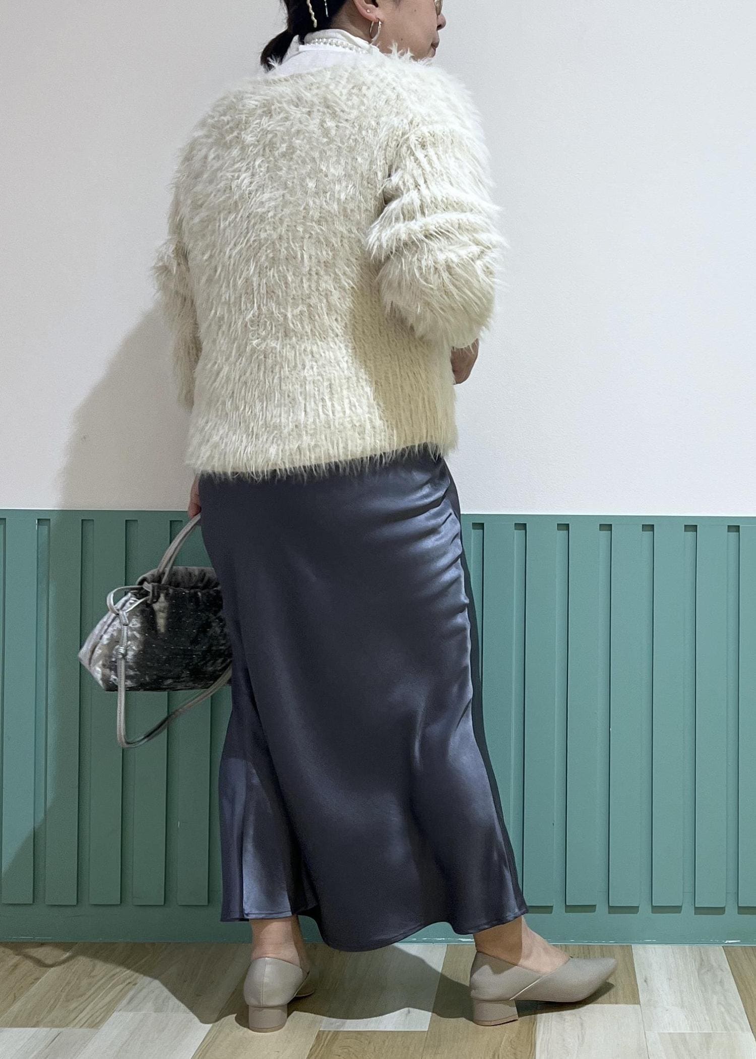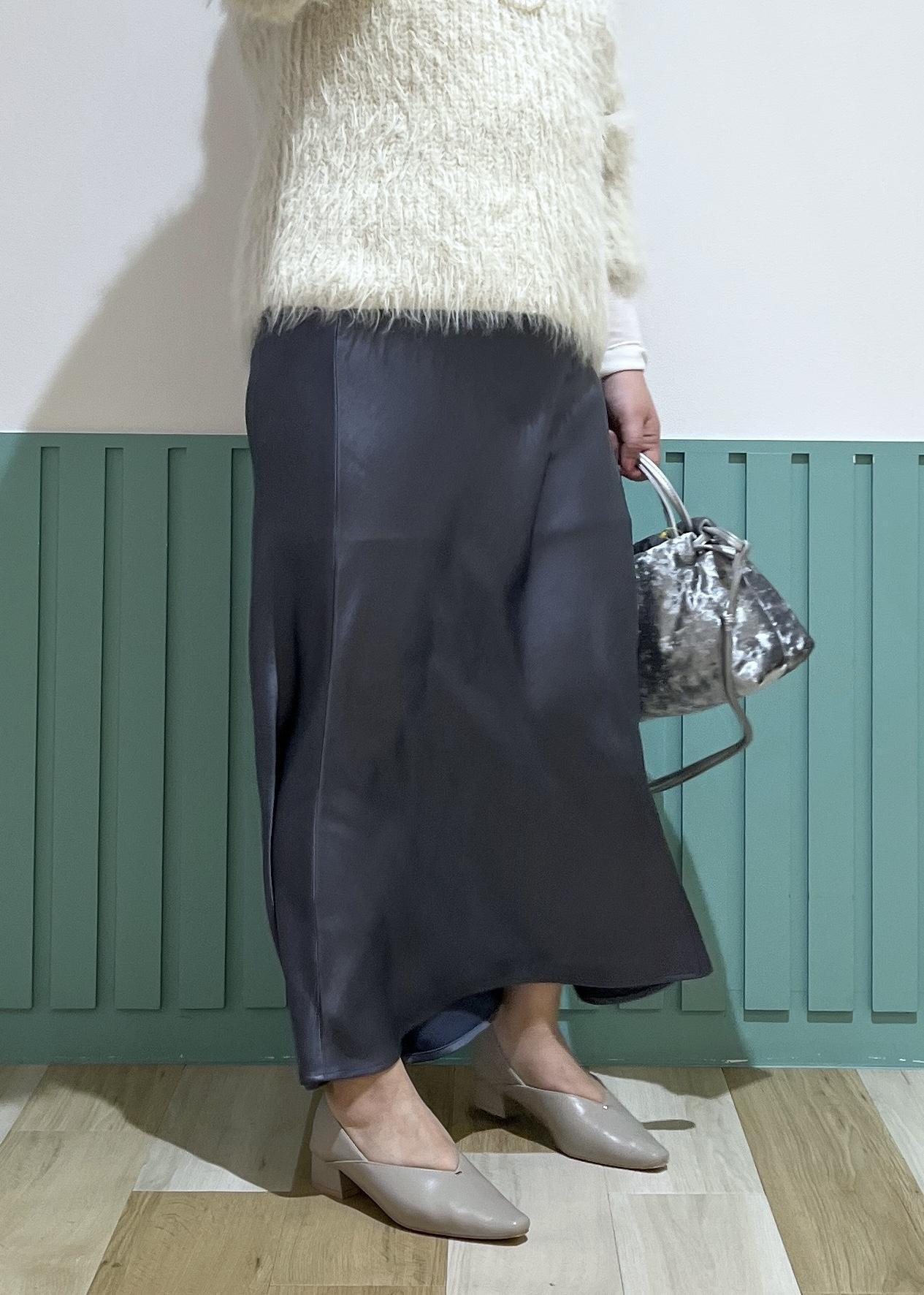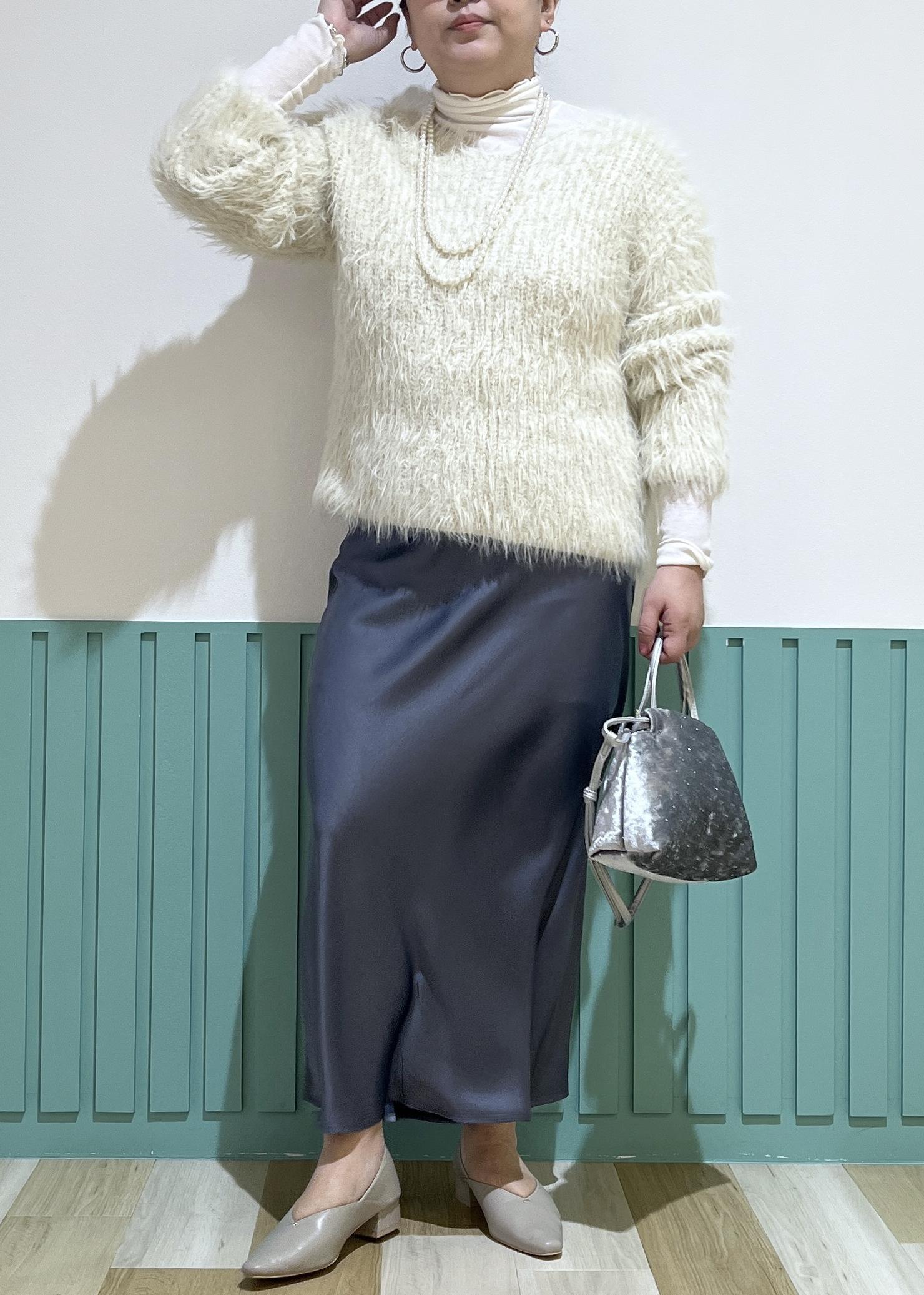 フェザーニットと光沢感のあるスカートの