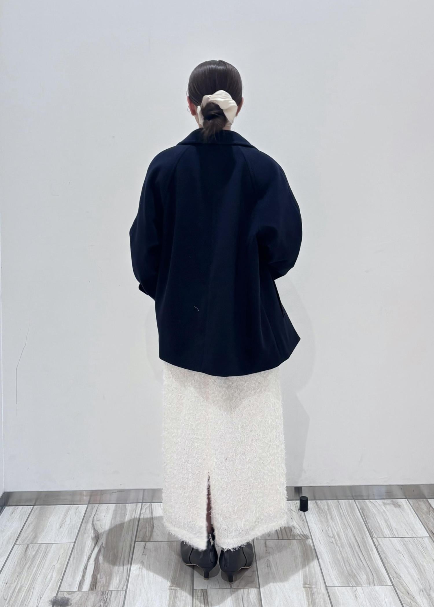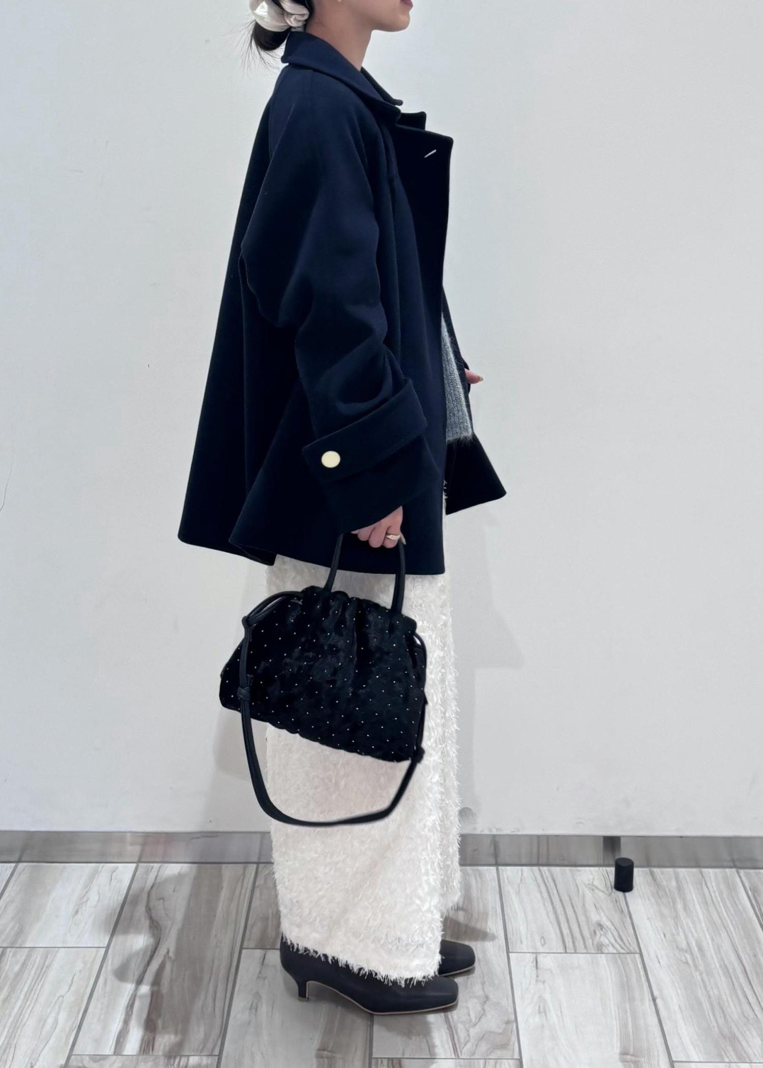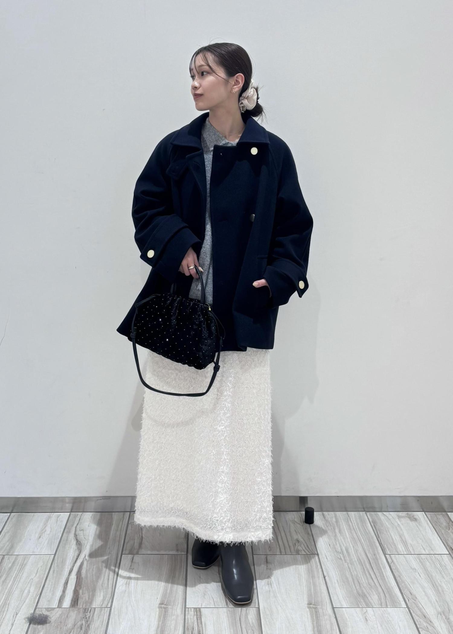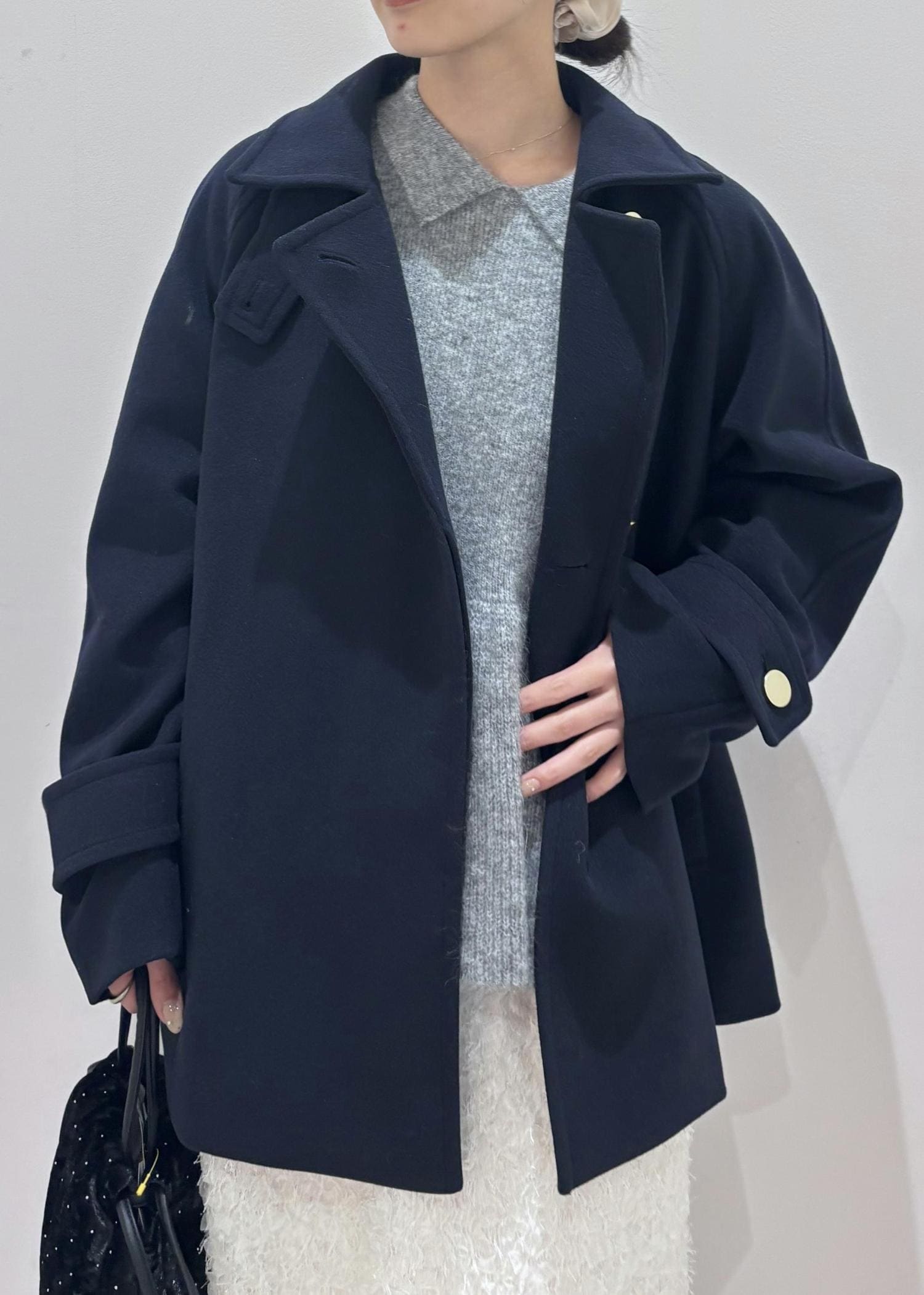 アウターはネイビーにする事でメリハリをつけ、上品さをプラス。小物は黒でまとめてバランスよく着てみました。