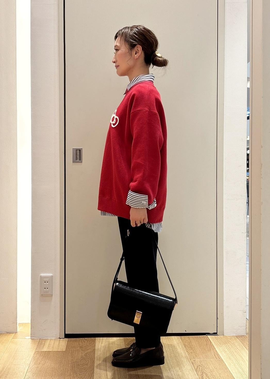 トラッド感を出したいなと思い、赤ニット×ネイビーストライプのシャツ×ブラウンローファーという定番の配色やアイテムをチョイスました。