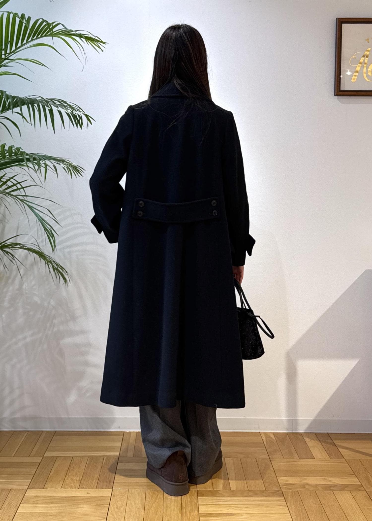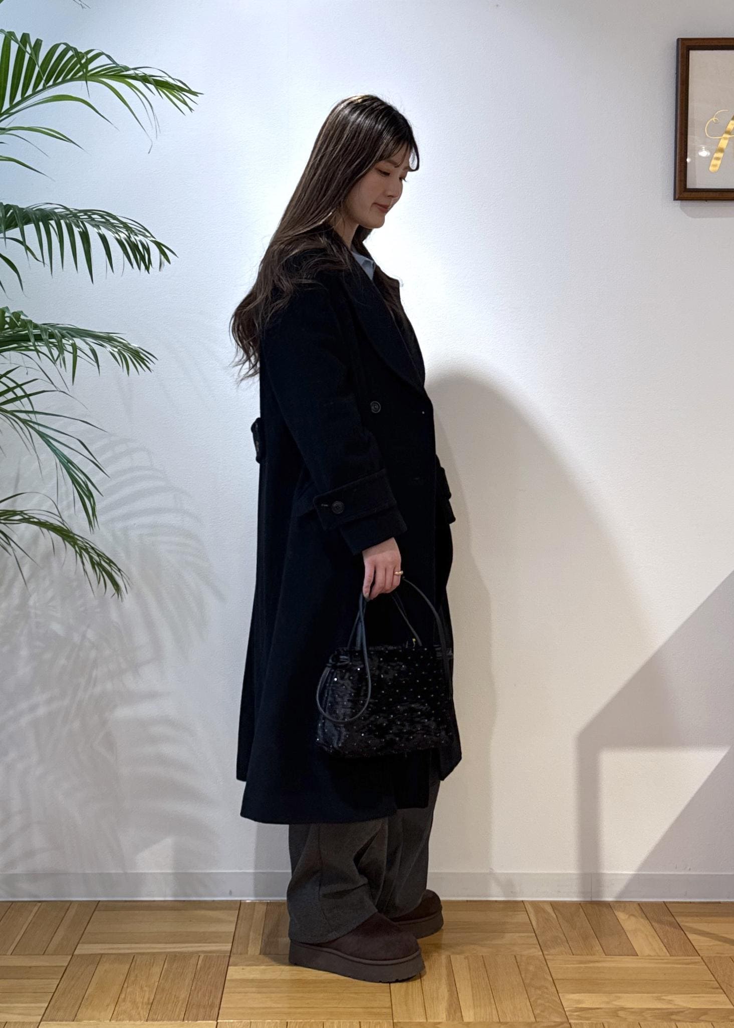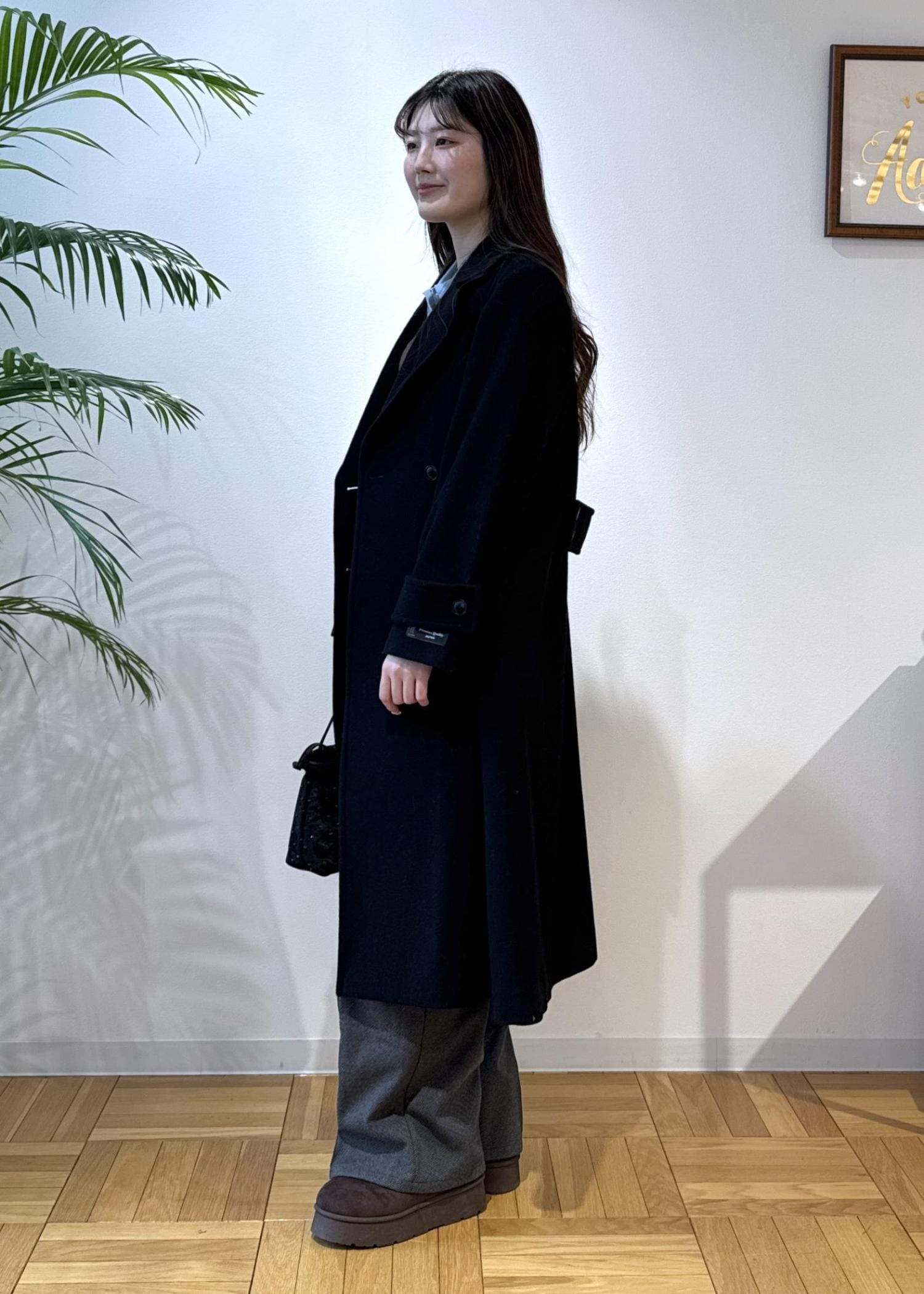 ブラックのコートで女性らしく全体を引き締めました。