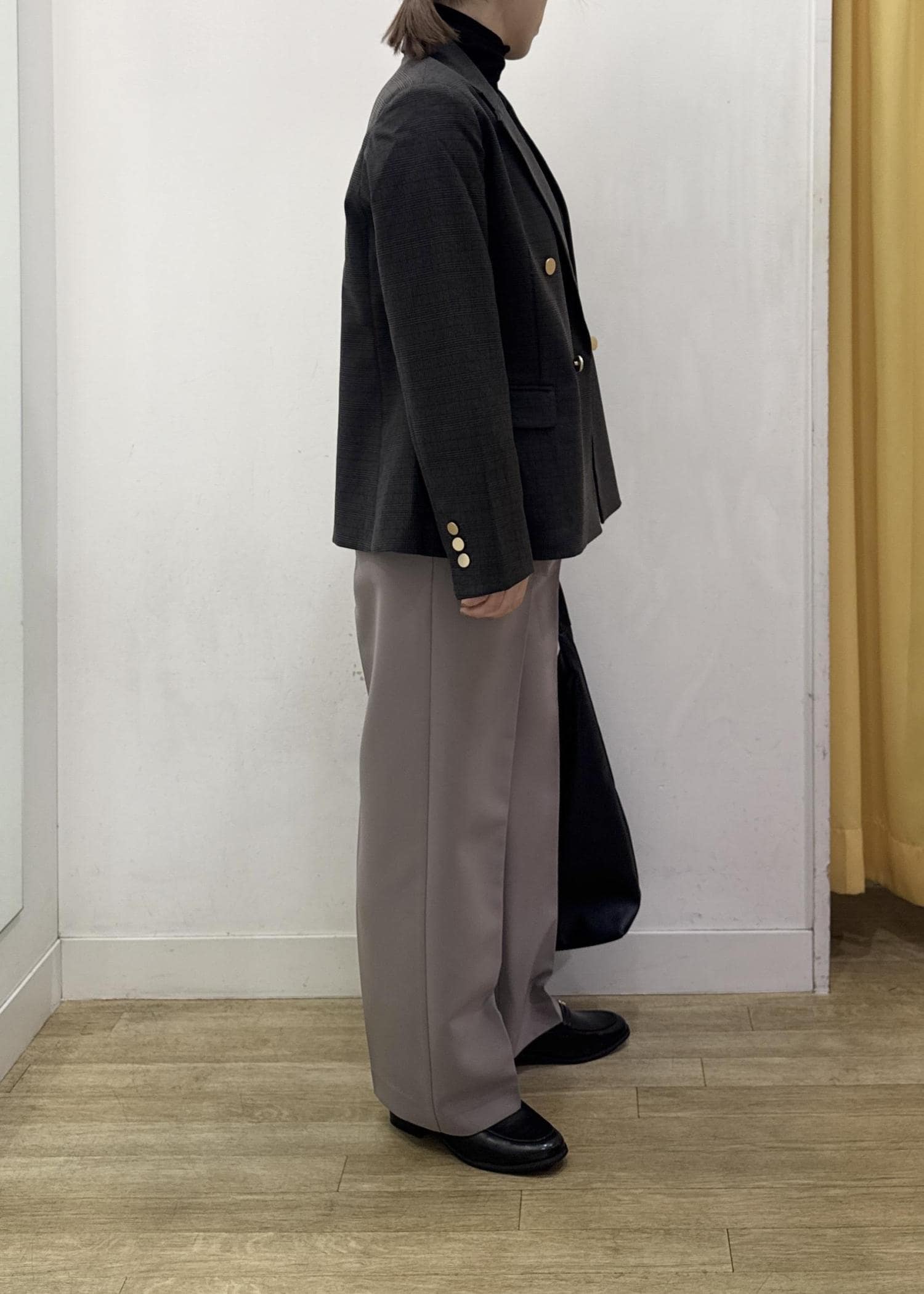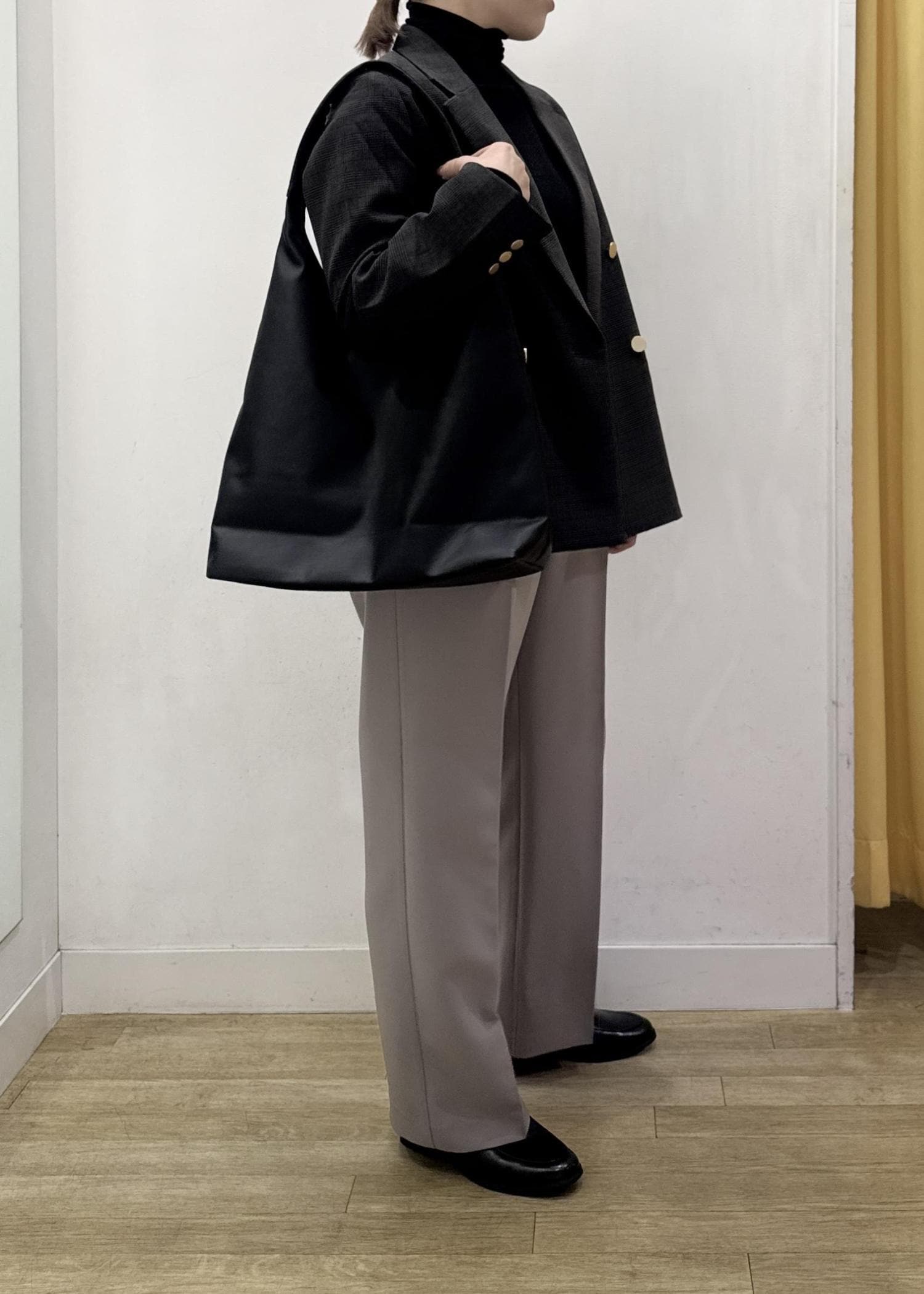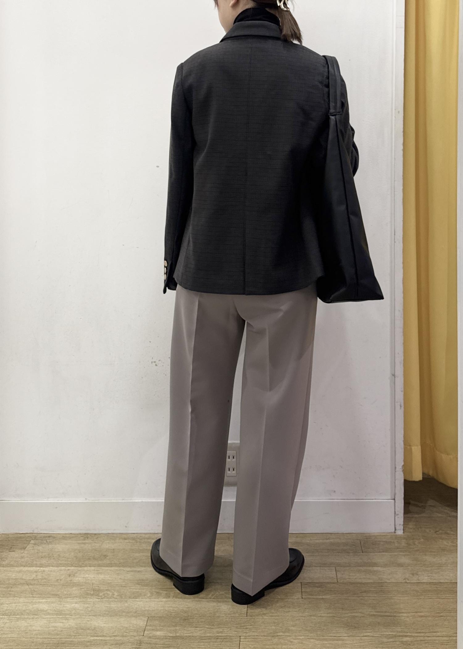 着丈はヒップにかかるぐらいの長さで、スカート、パンツどちらにも合わせやすい着丈です。 -