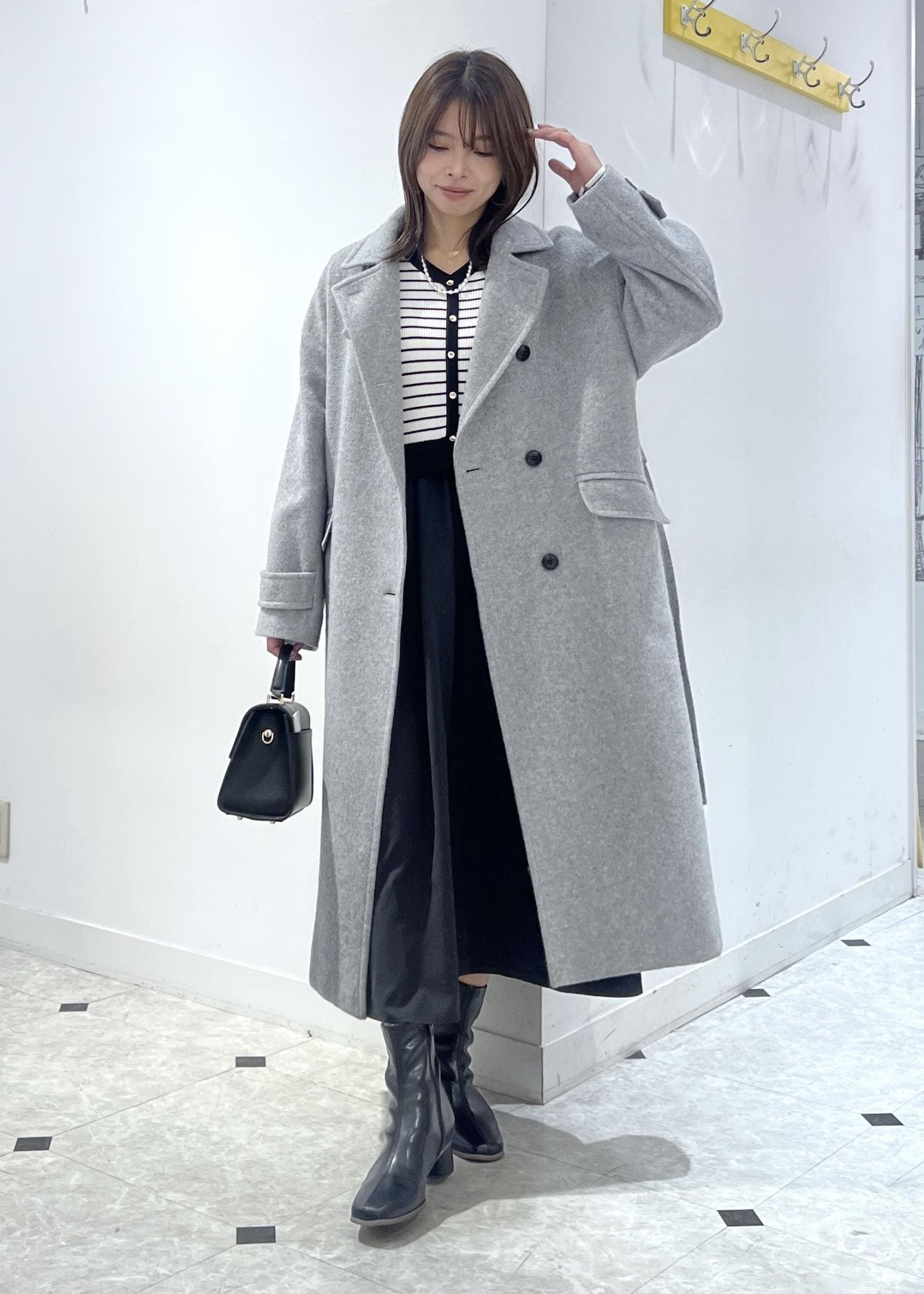 前を閉じて1枚でコーデが完結できるロング丈のウールコートは、軽くしっかり暖かい着心地。