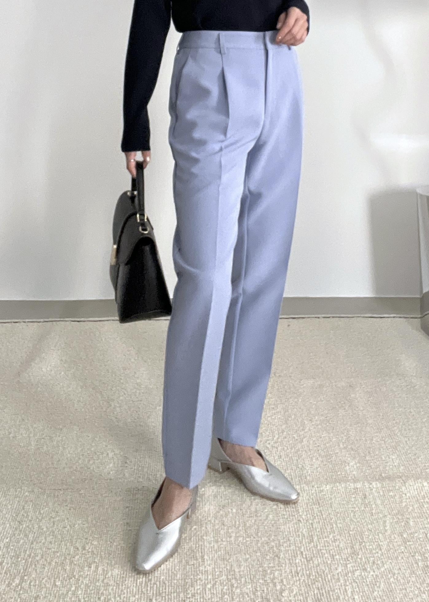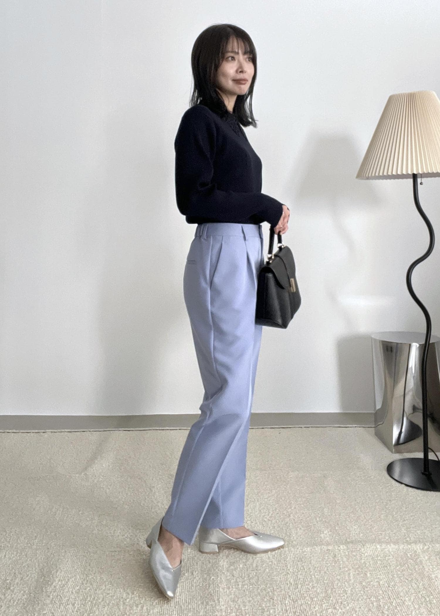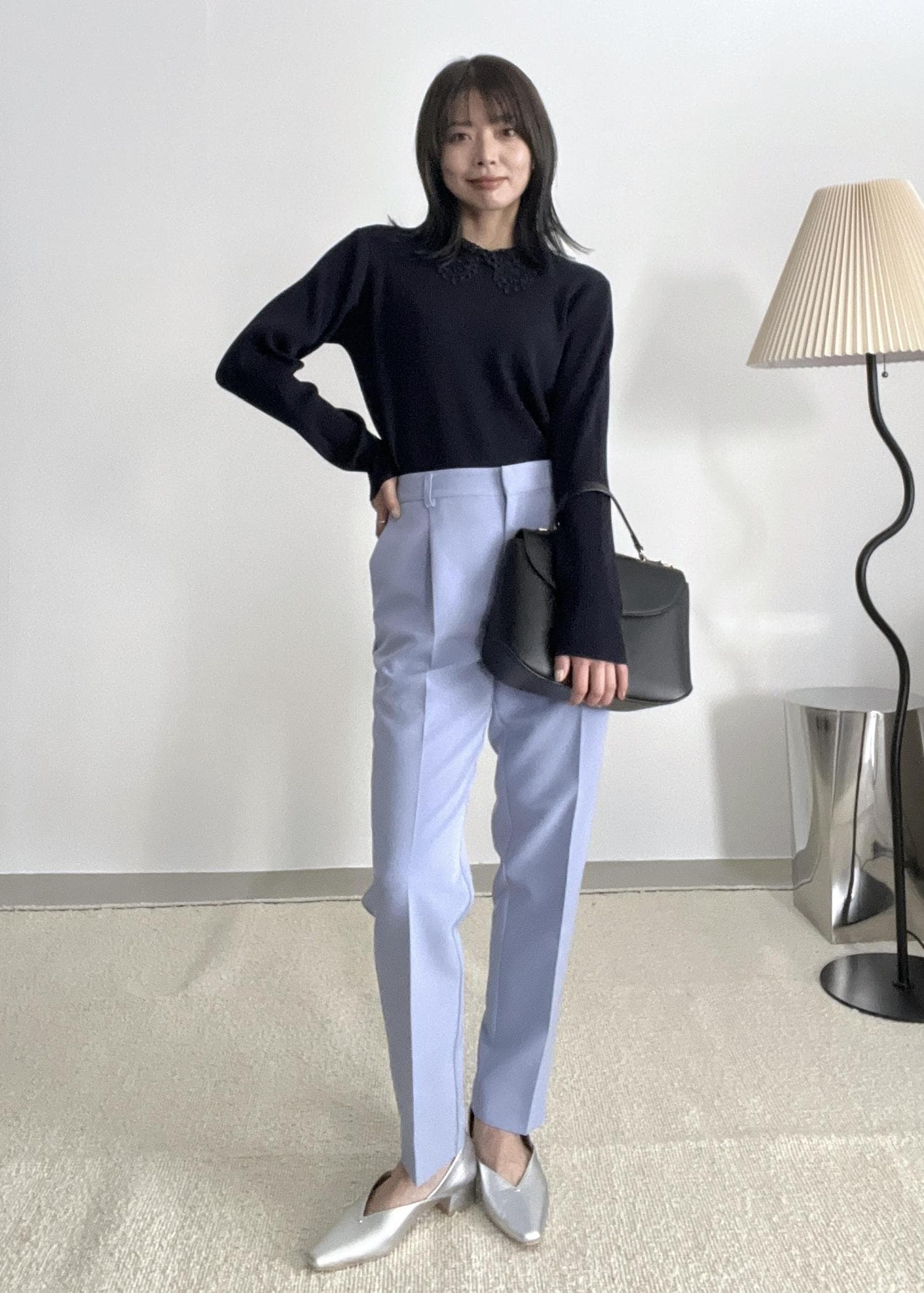 明るく柔らかい雰囲気のブルーのパンツには、締め色を合わせるのが◎。