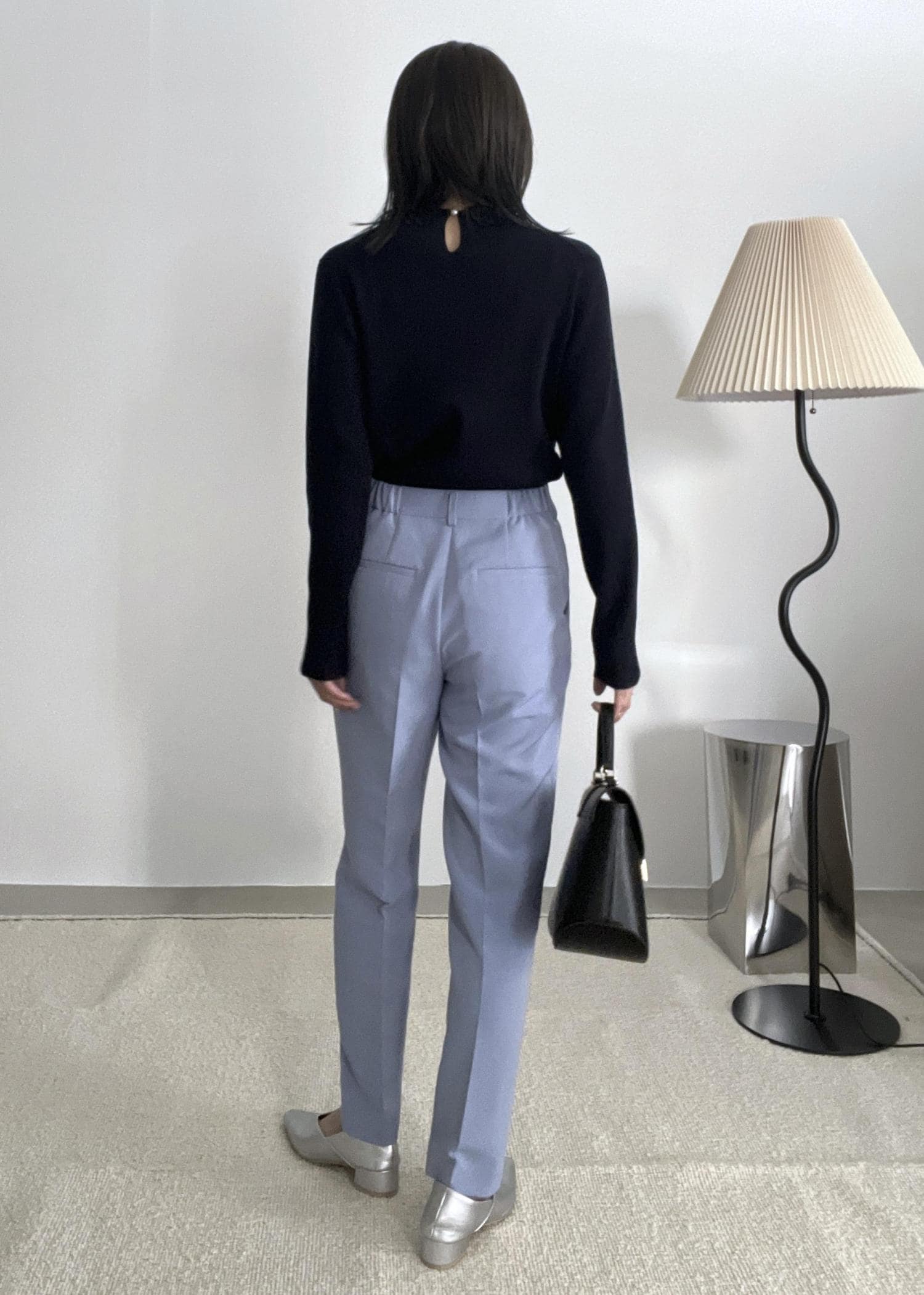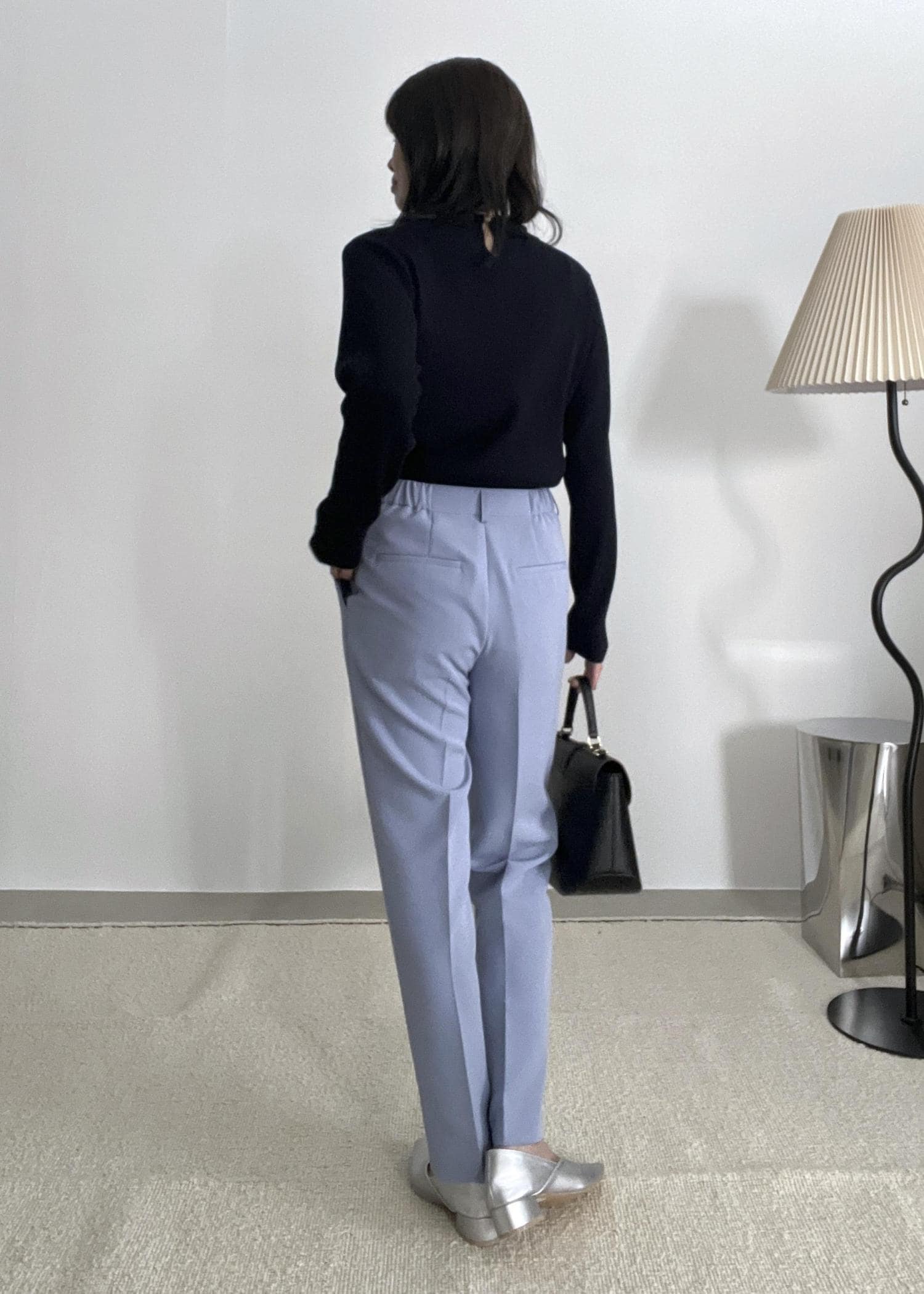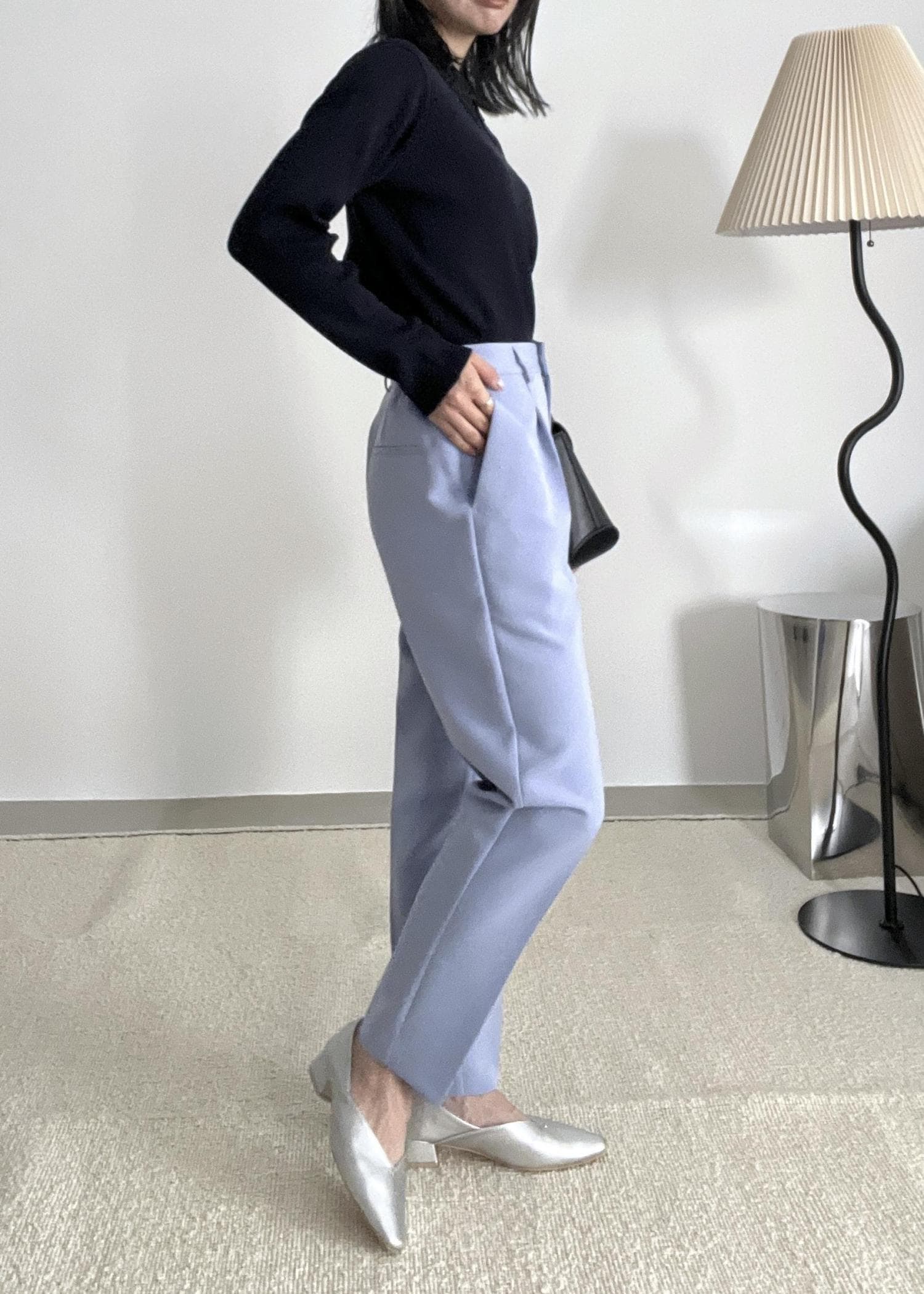 柔らかくストレッチ性の高い素材のパンツは、お仕事から普段使いまで幅広く着られるテーパード型。