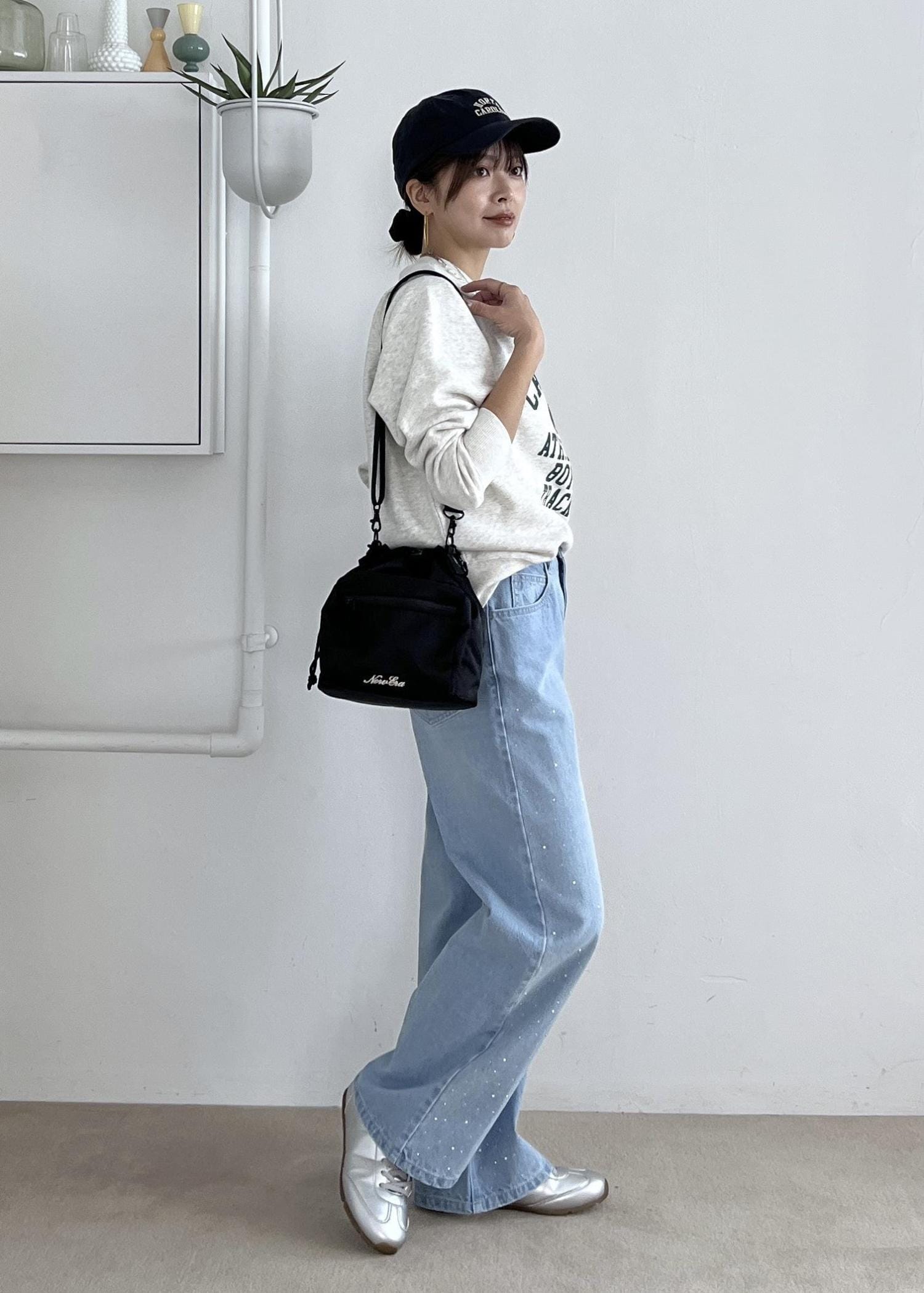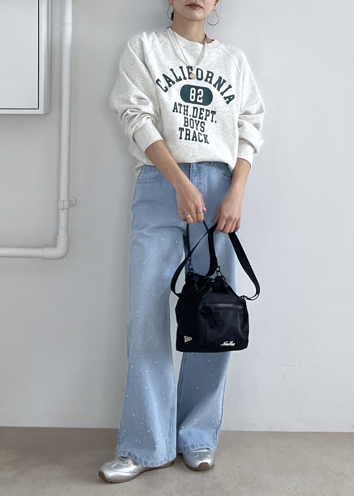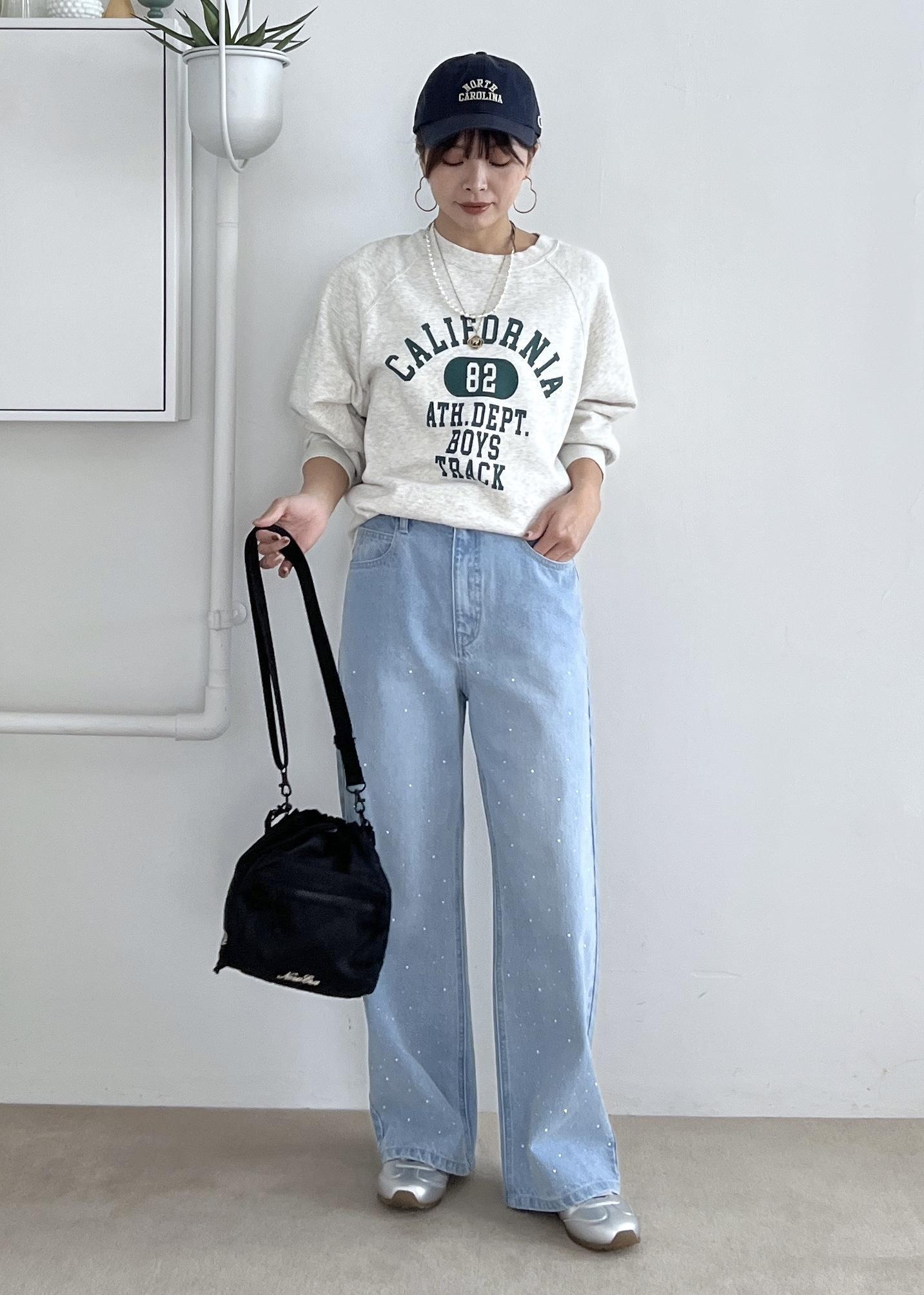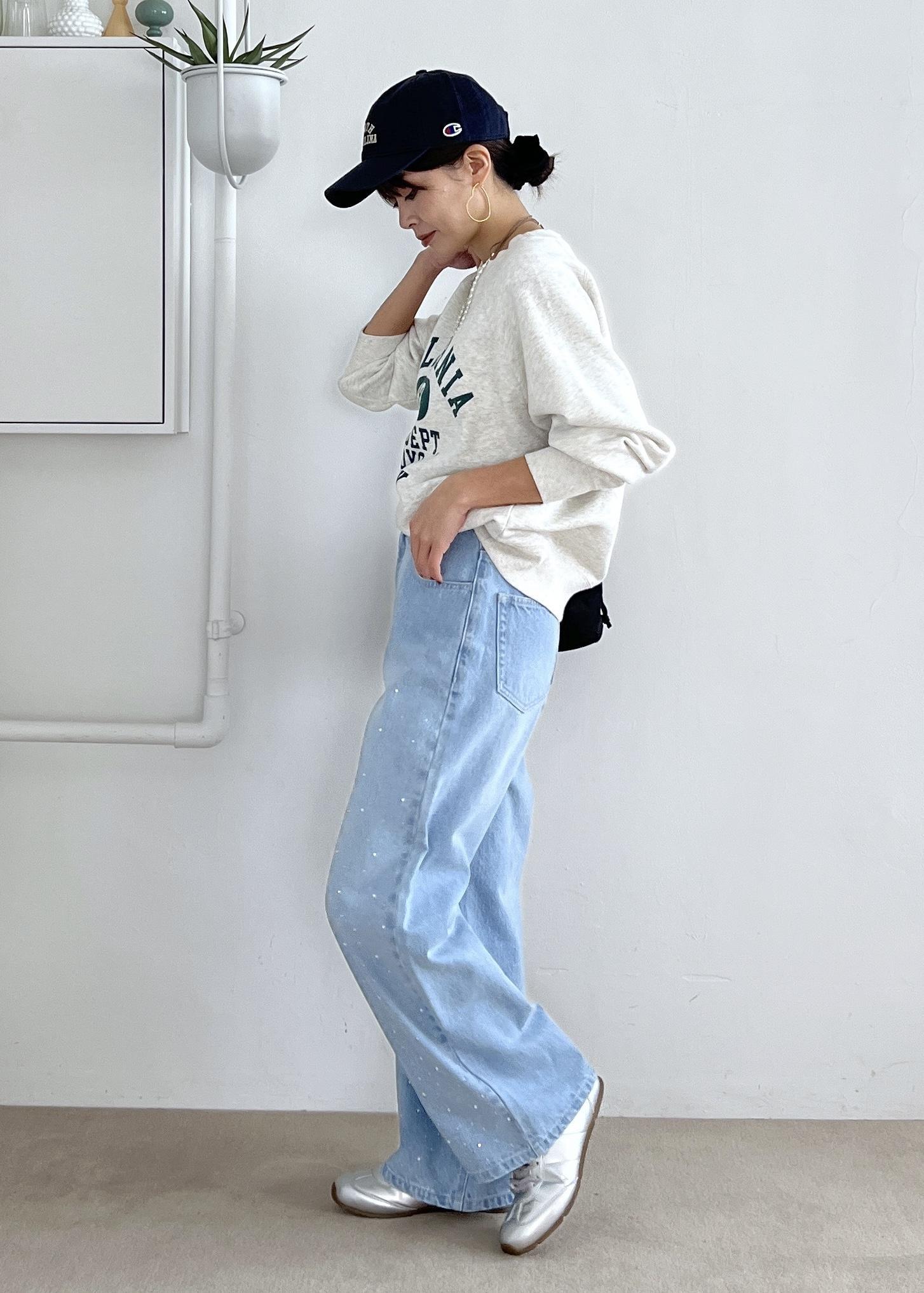 デニムでゆるっと休日スタイルですが、デニムにはさりげないビジュー付きでワンポイントに。