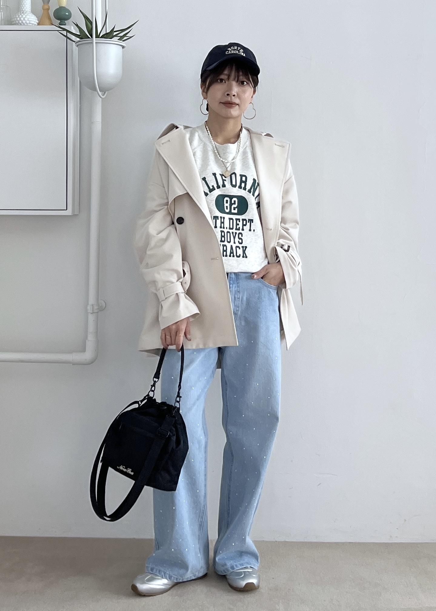 スウェット×デニムのラフなコーデも、トレンチコートを羽織れば大人スタイルに。