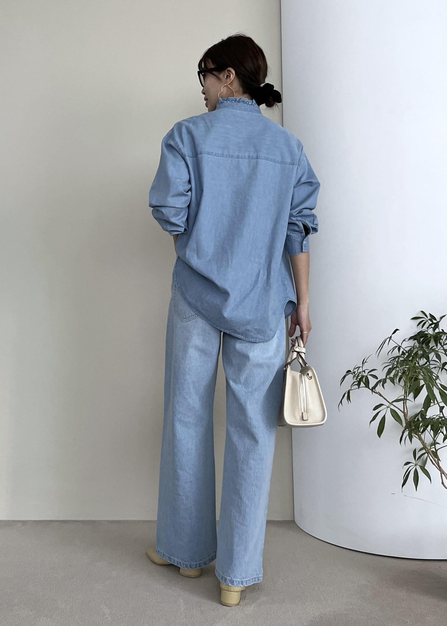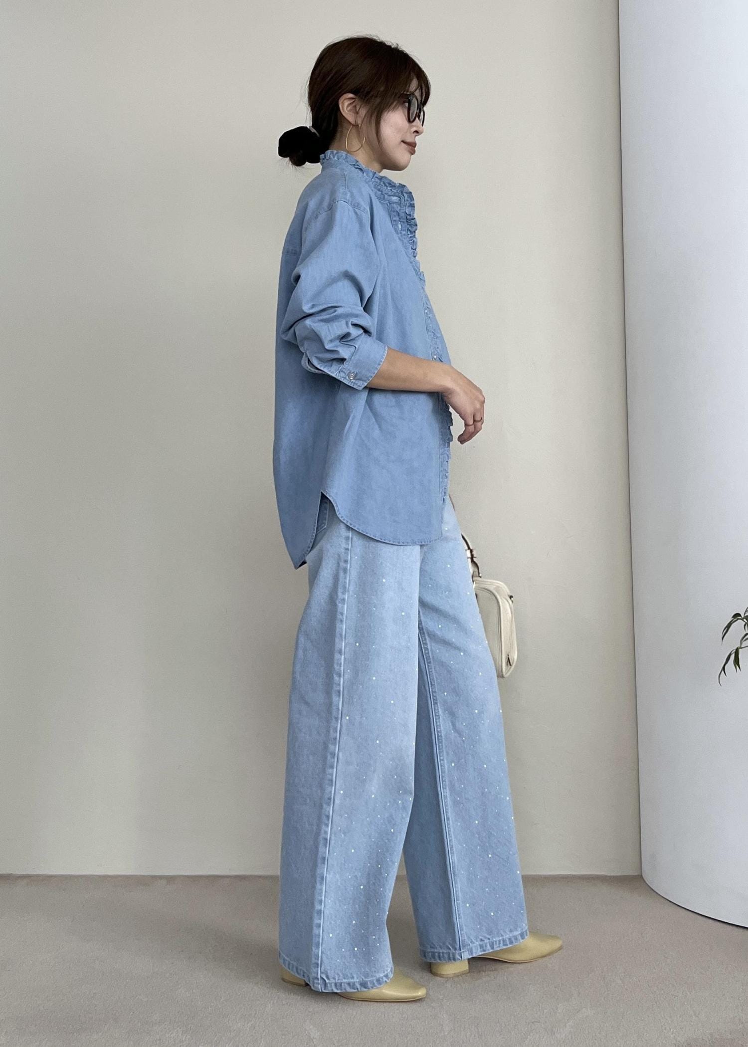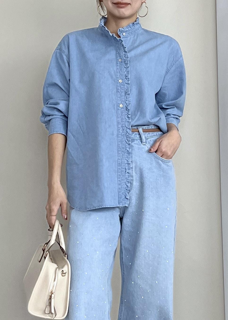 フリルデザインのシャツなら、メンズライクになりすぎないのでデニム生地でもハードに見えなくて◎。
