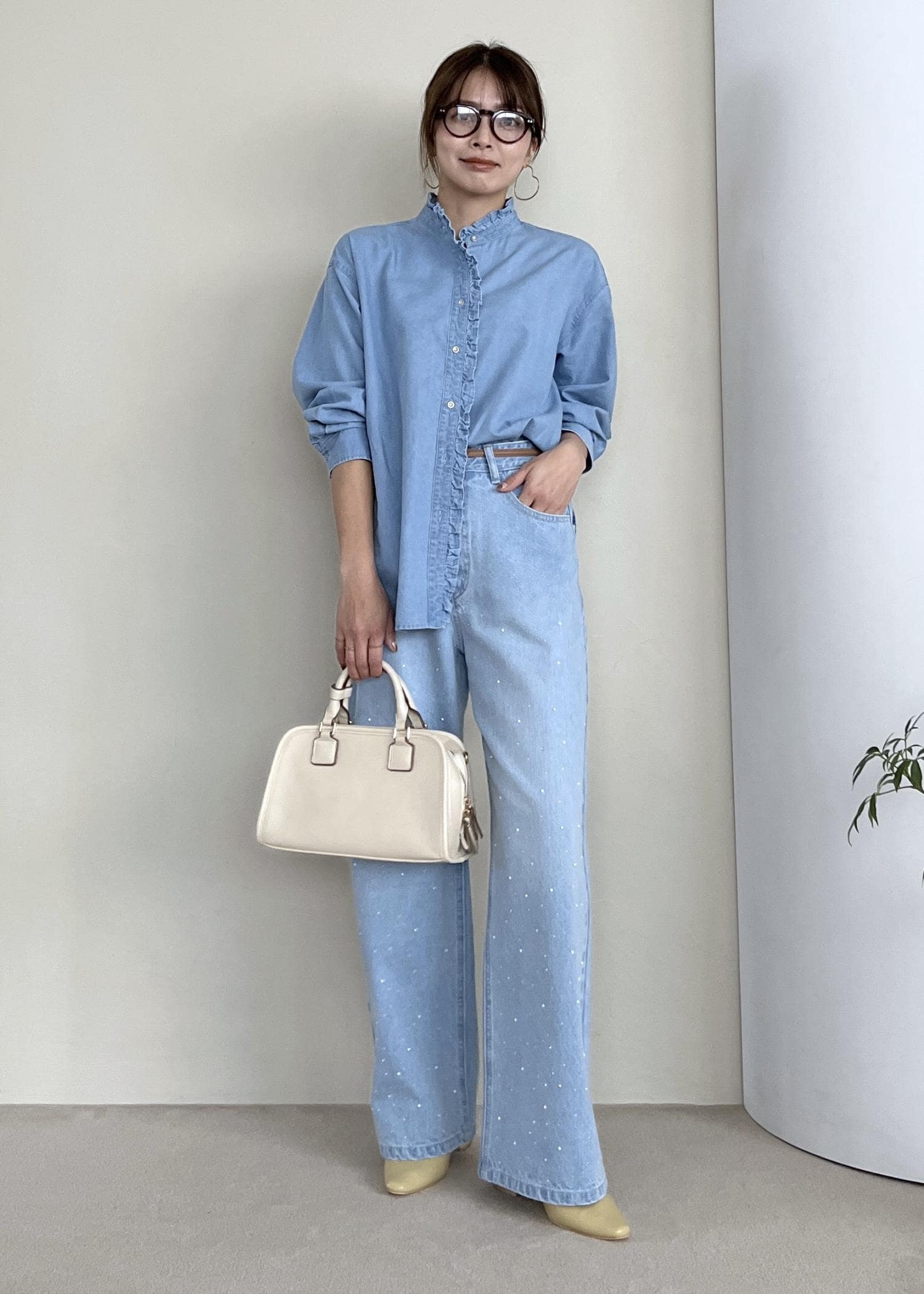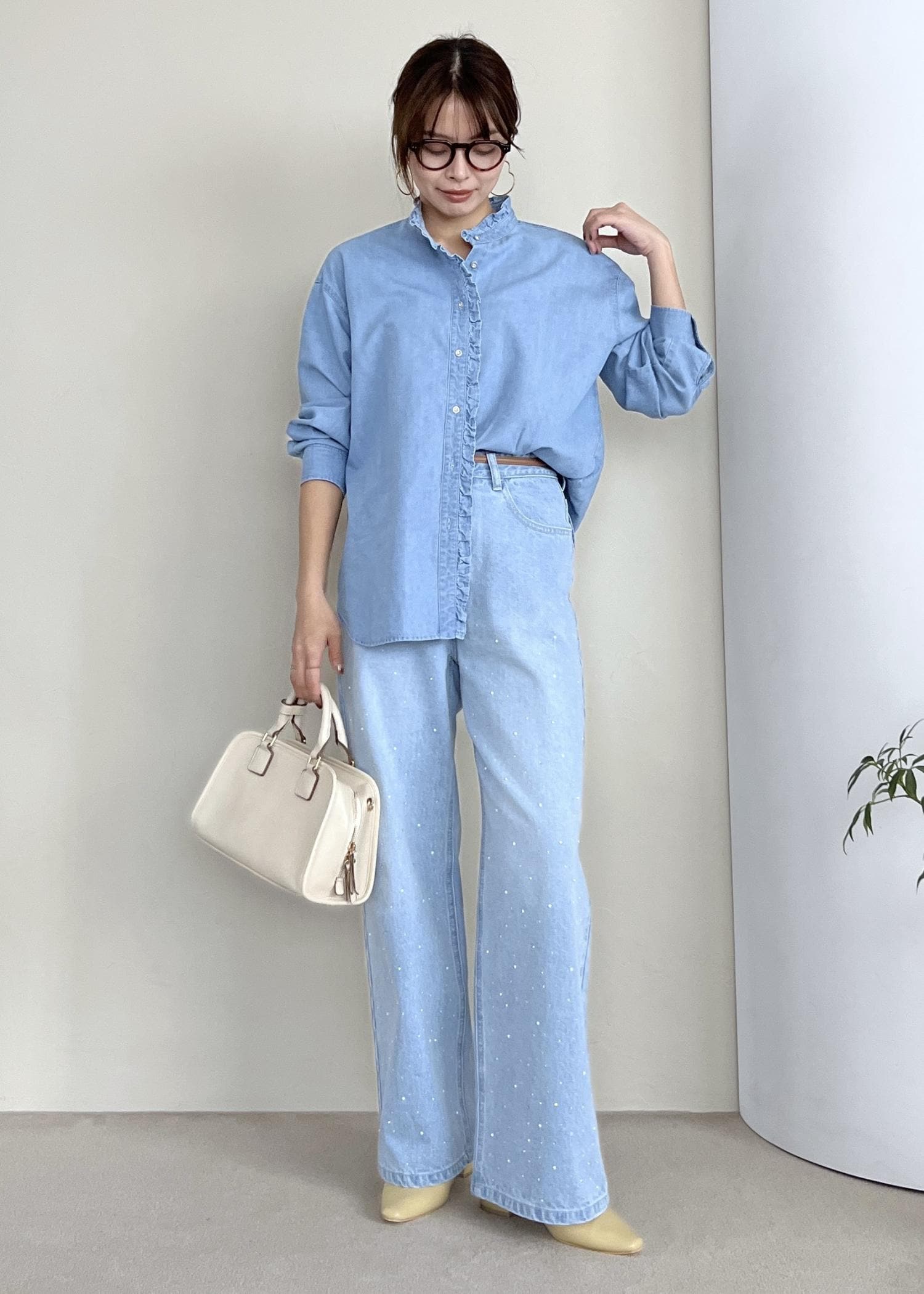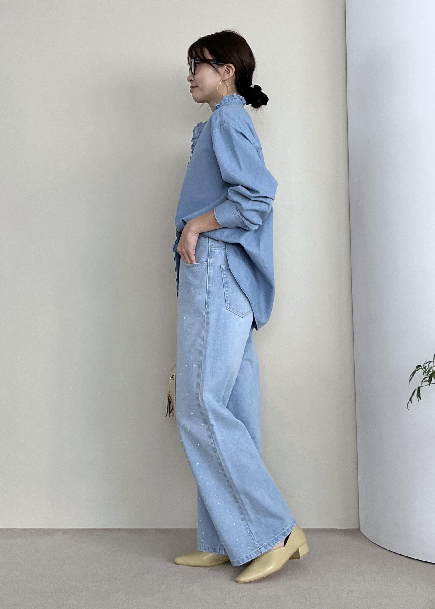 フリルデザインのシャツなら、メンズライクになりすぎないのでデニム生地でもハードに見えなくて◎。