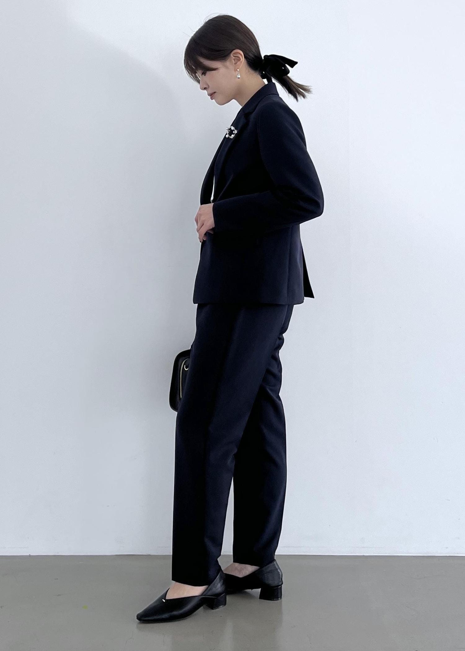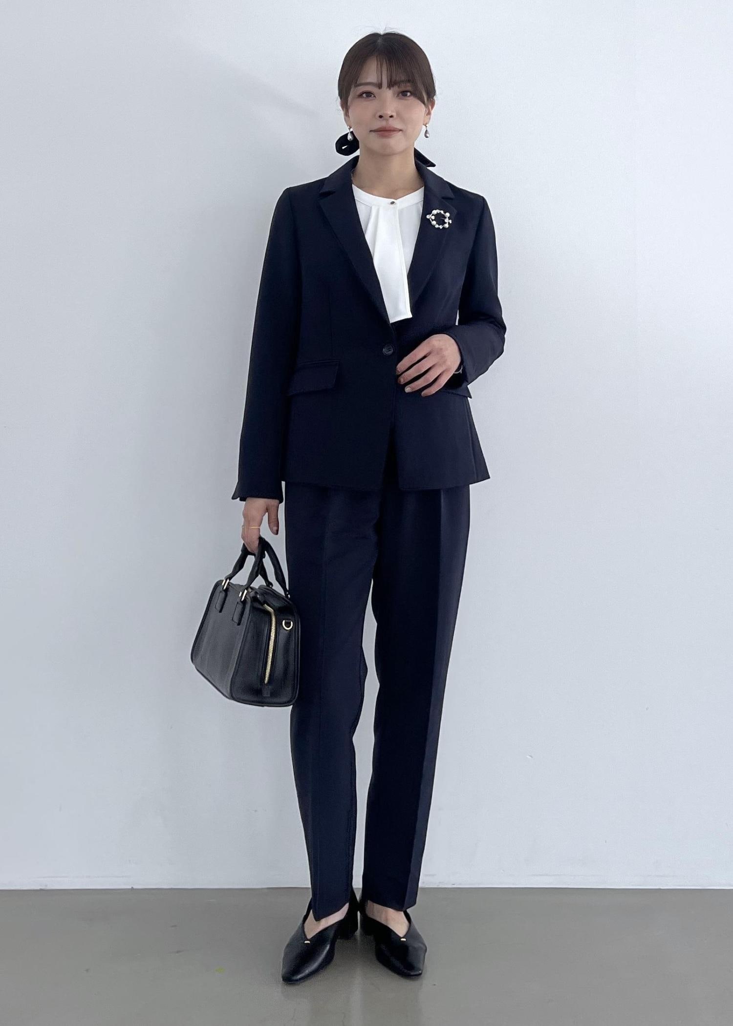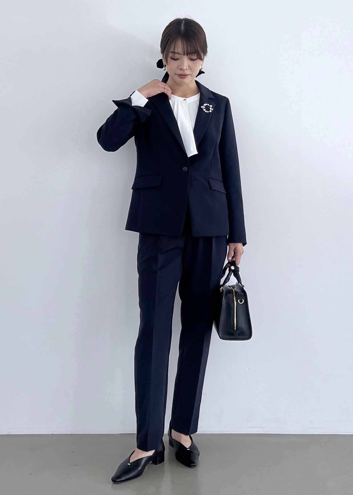 きちんと感のあるテーラードジャケットにはブローチを付けて華やかに◎。